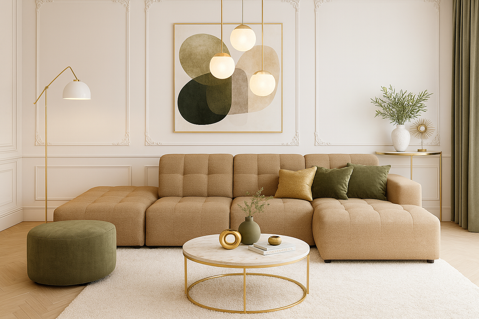 Narożnik z pufą prawostronny Bergamo B – tkanina Raven 34 jasno brązowa, 341×166×70 cm