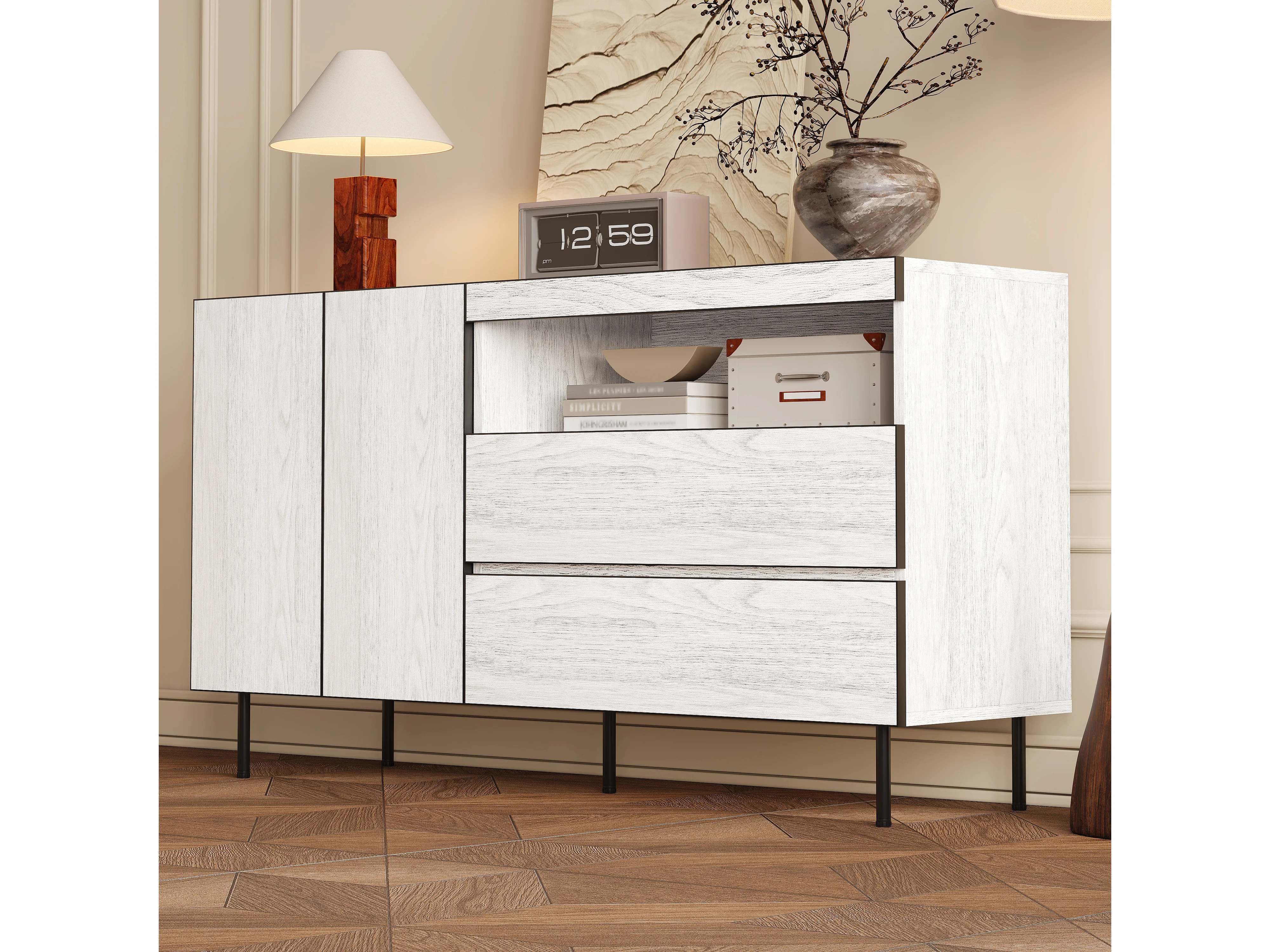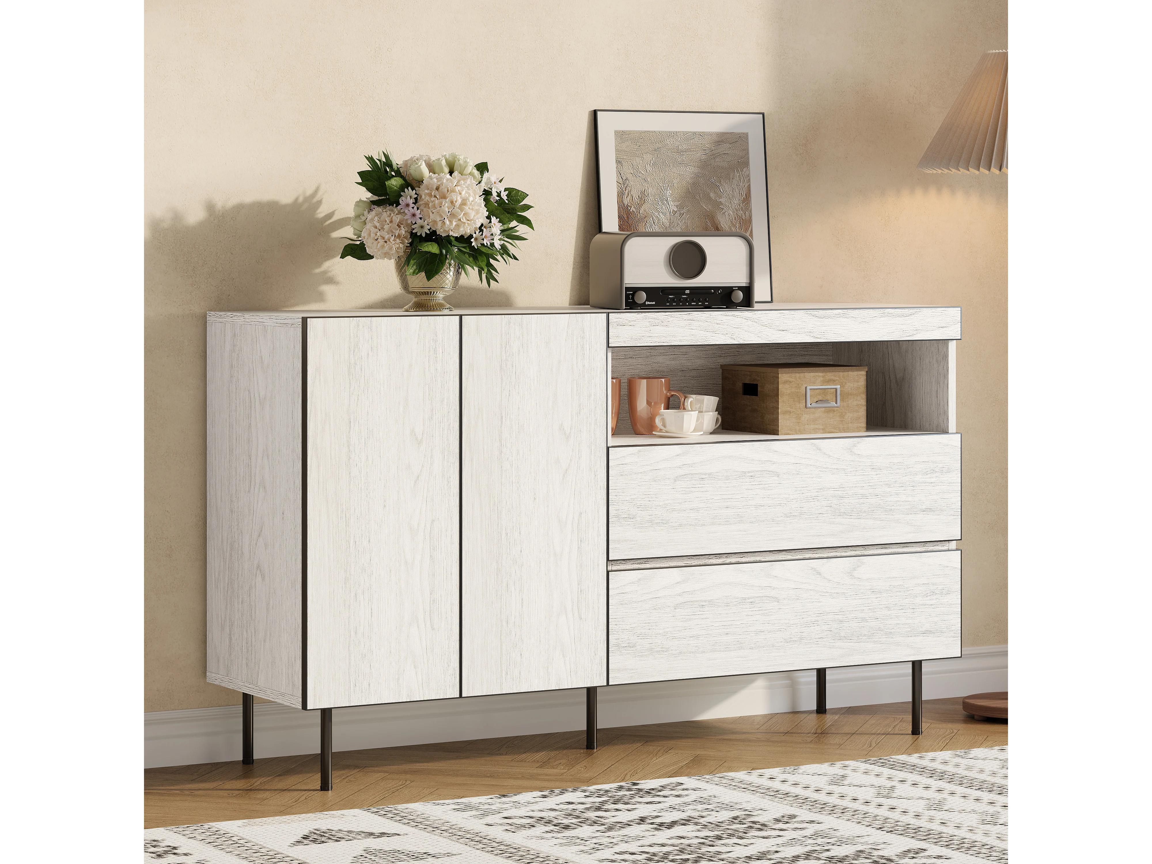 Komoda z 2 szufladami i 4 drzwiami - 140 x 35 x 82 cm - regulowane półki - do salonu i kuchni - płyta wiórowa - kolor biały i naturalny