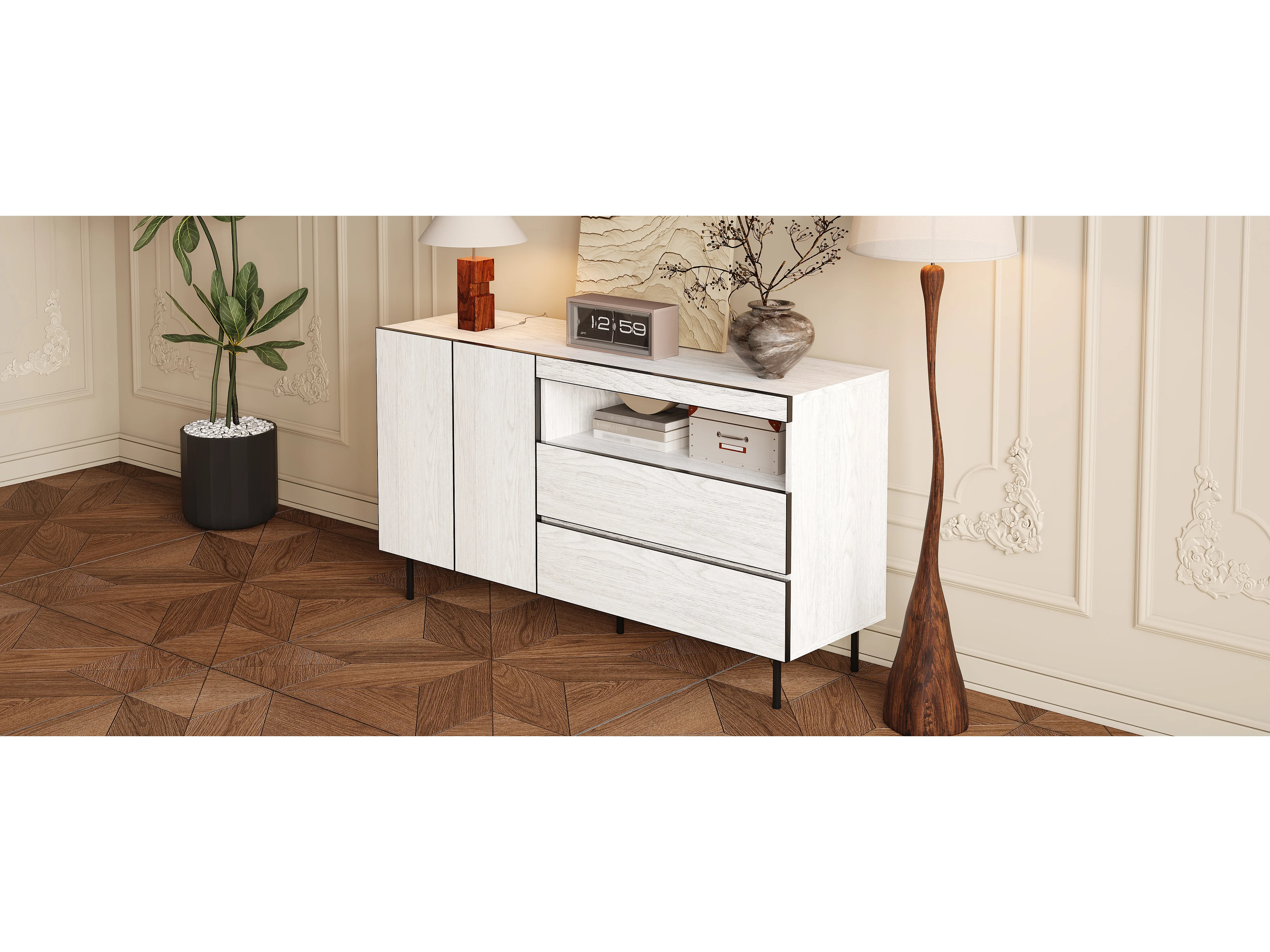 Nowoczesna komoda do salonu - 120,5 x 42 x 96 cm - z 3 drzwiami + półki - płyta wiórowa - biała