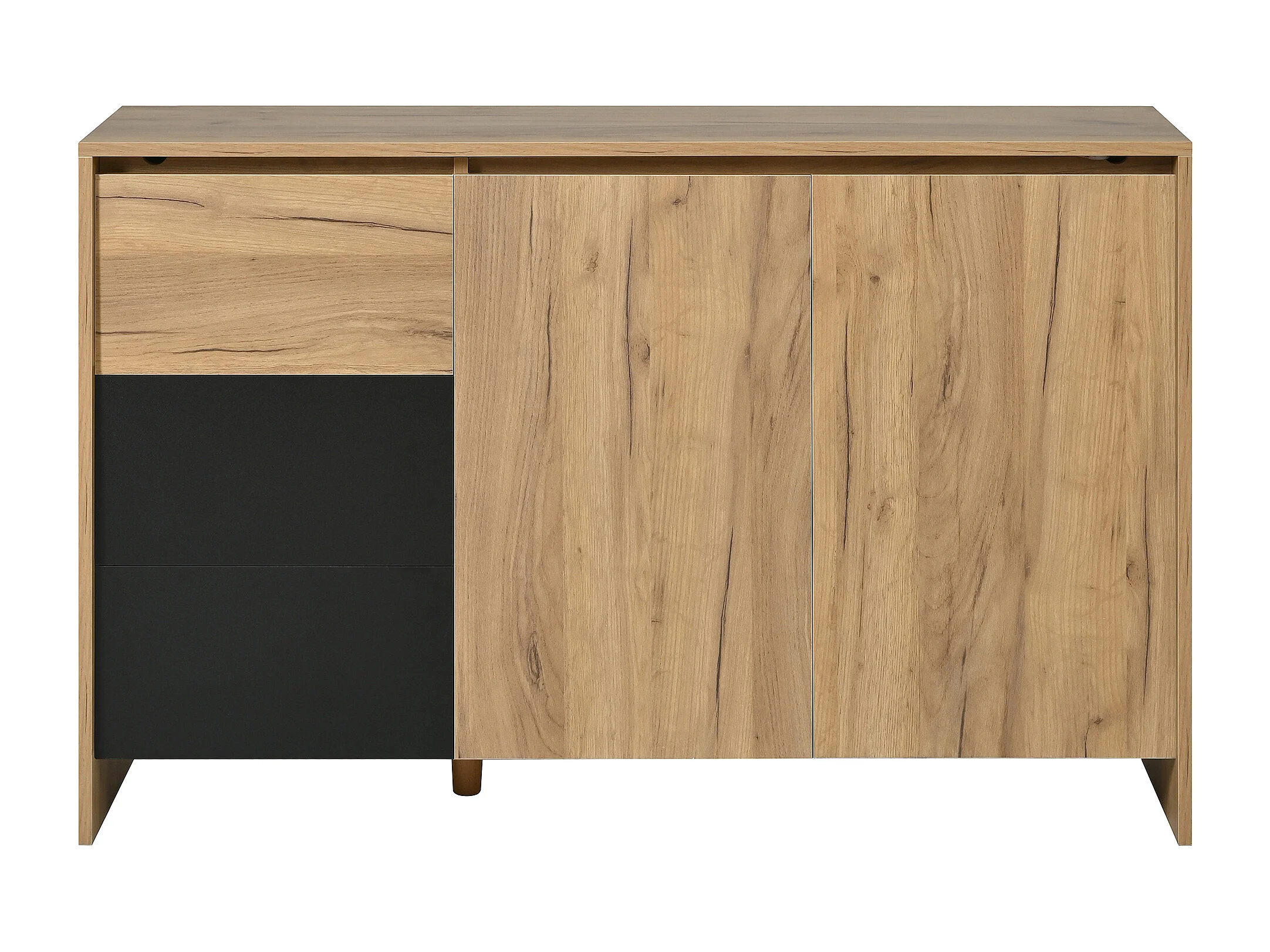 Nowoczesna i prosta komoda - 120 x 35 x 76 cm - z 1 drzwiami + 3 szufladami - do salonu - płyta wiórowa - kolor czarny + naturalny