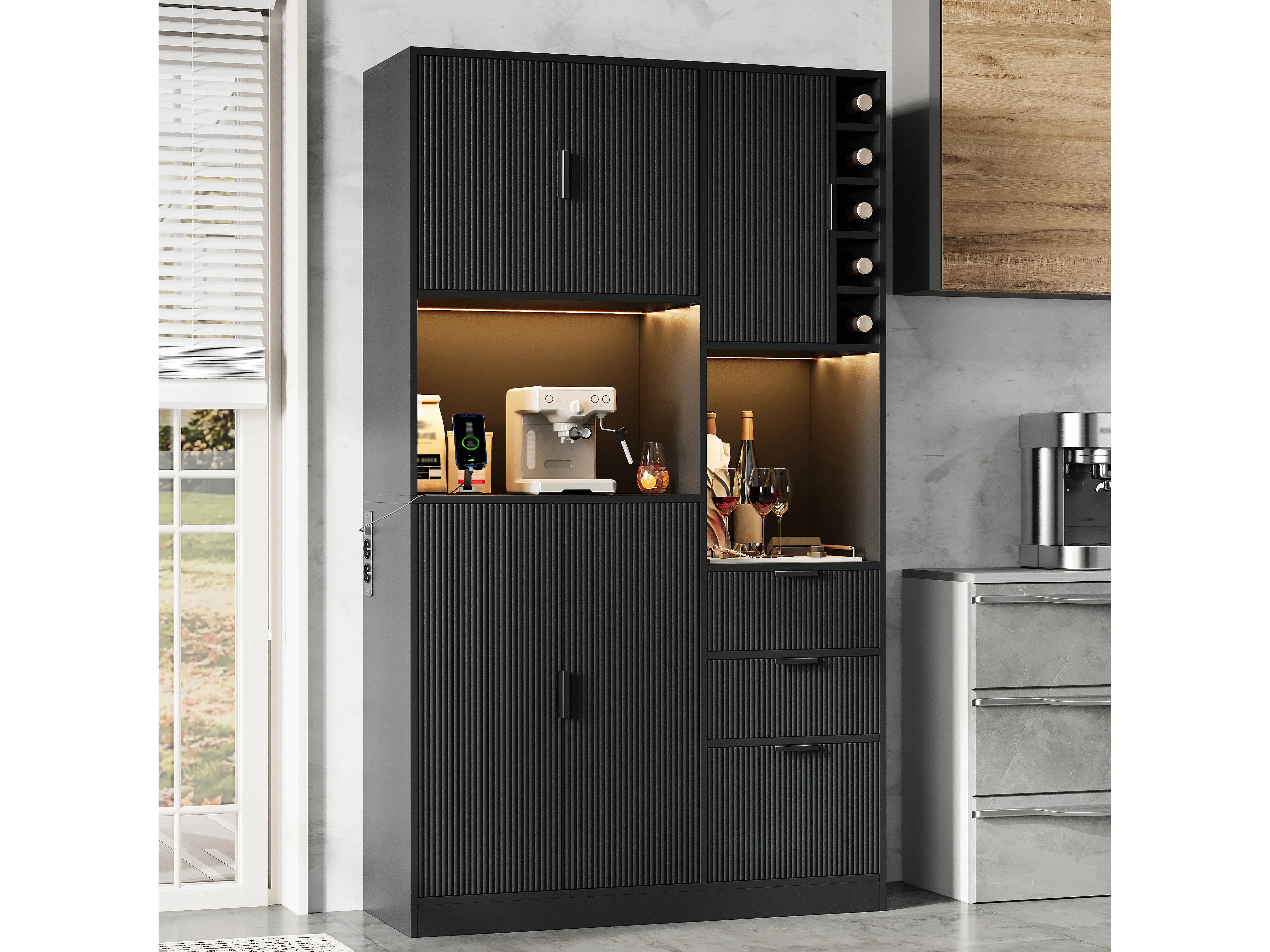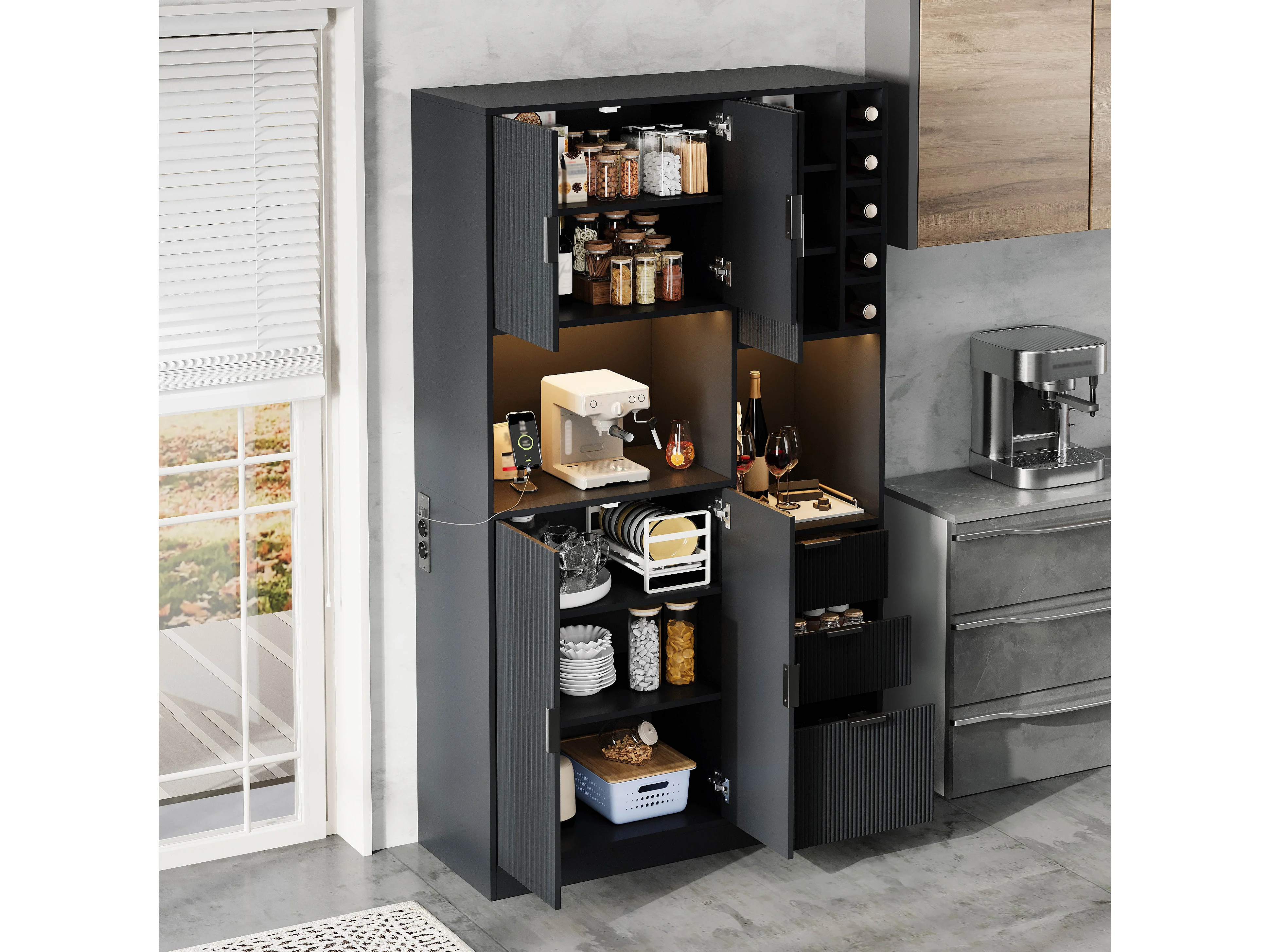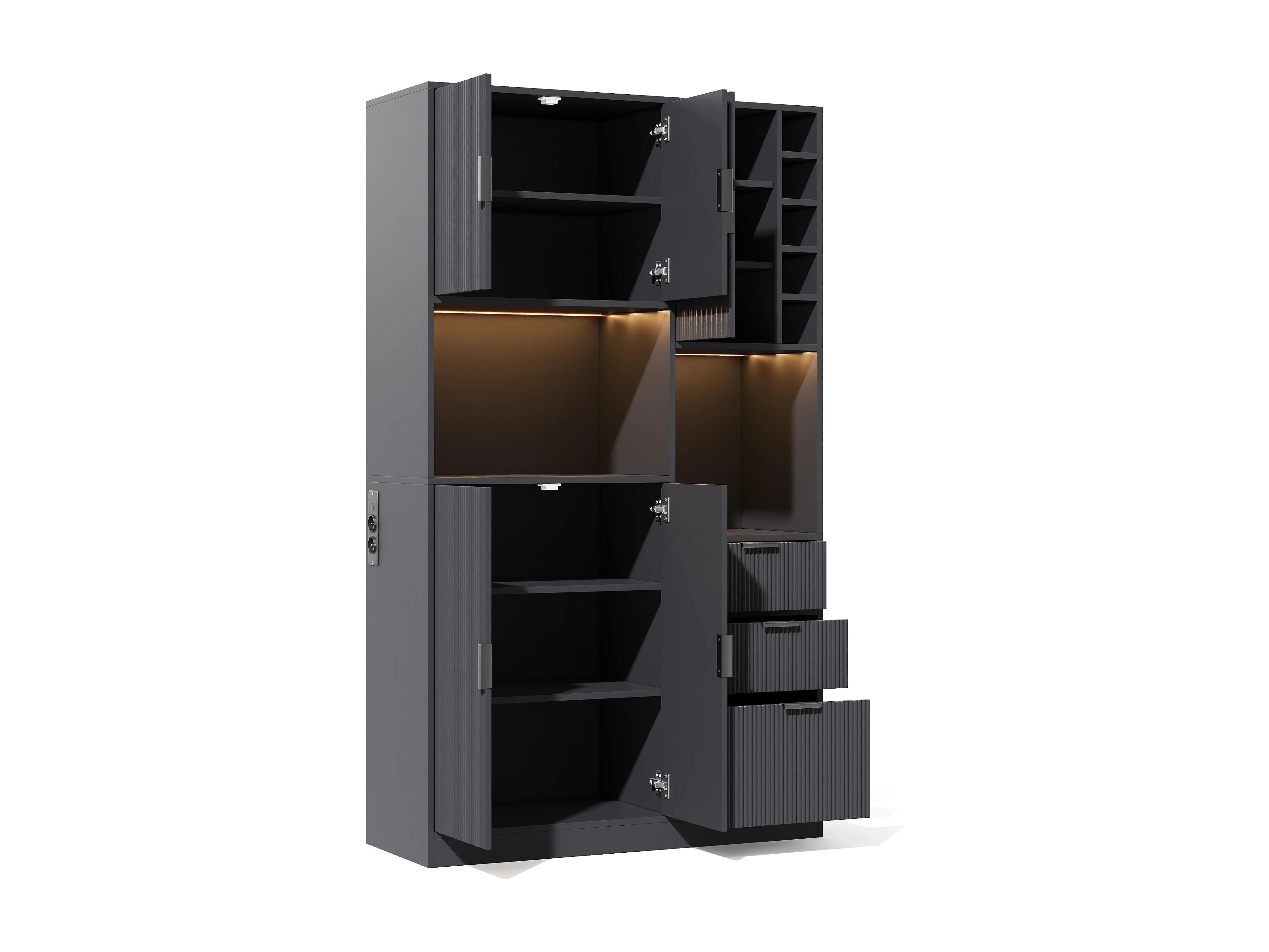 Nowoczesna komoda kuchenna - 105 x 40 x 180 cm - z półkami + 3 szufladami + stojakiem na wino + diodami LED + drzwiami - MDF - czarna