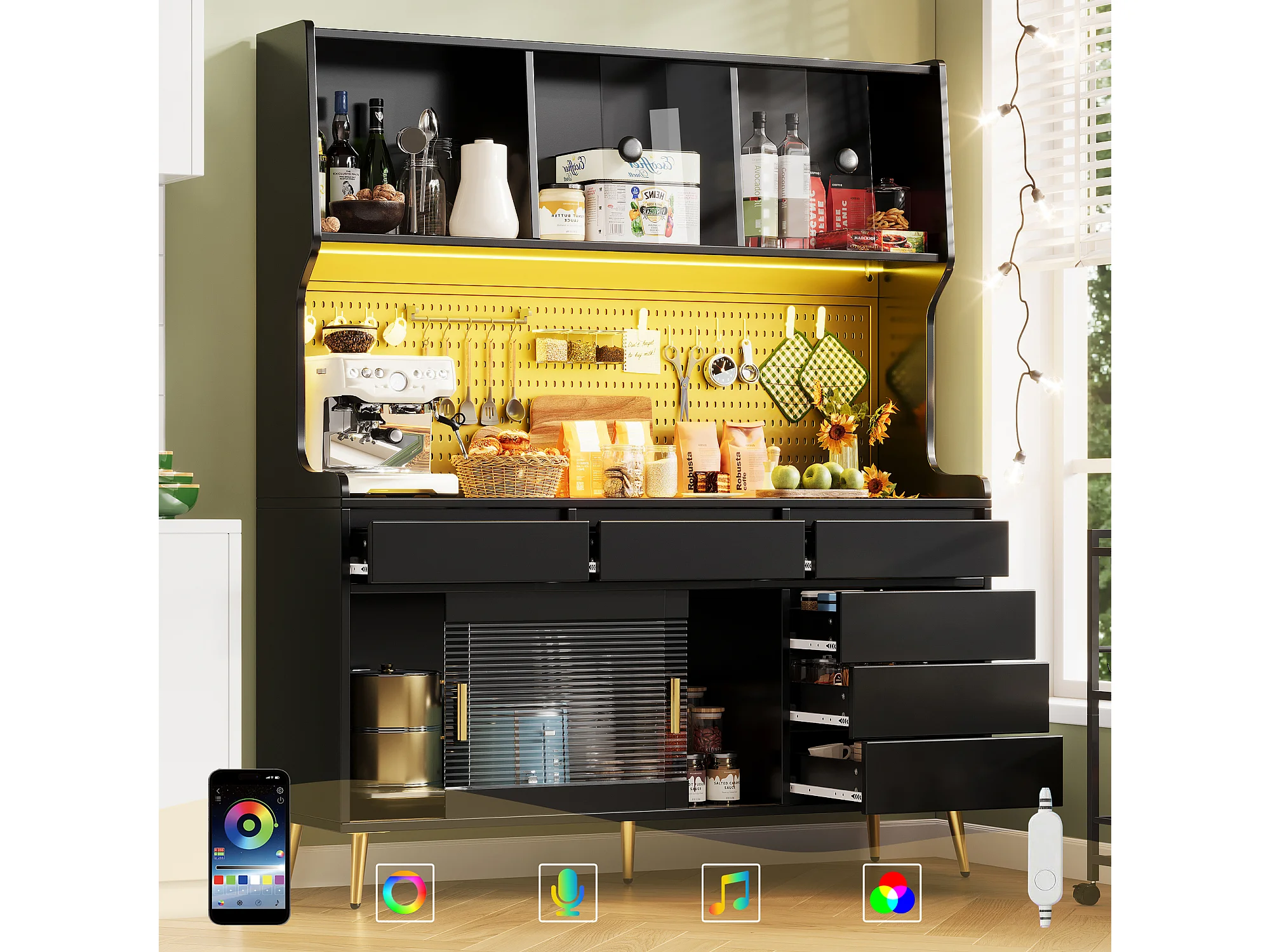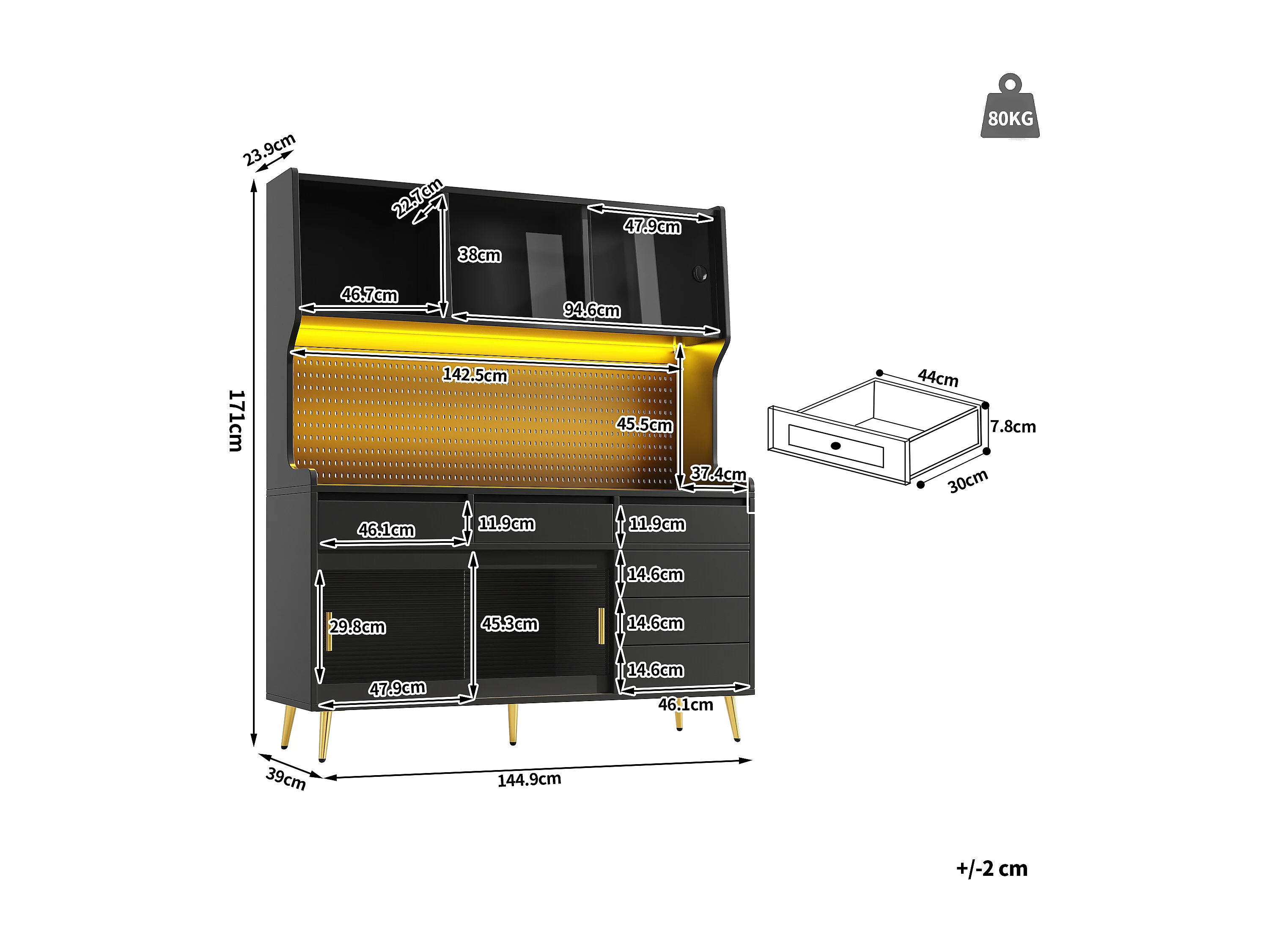 Nowoczesna komoda kuchenna - 145 x 39 x 171 cm - z diodami LED + 6 szuflad + drzwi + półka i perforowana ścianka - MDF + szkło - czarna
