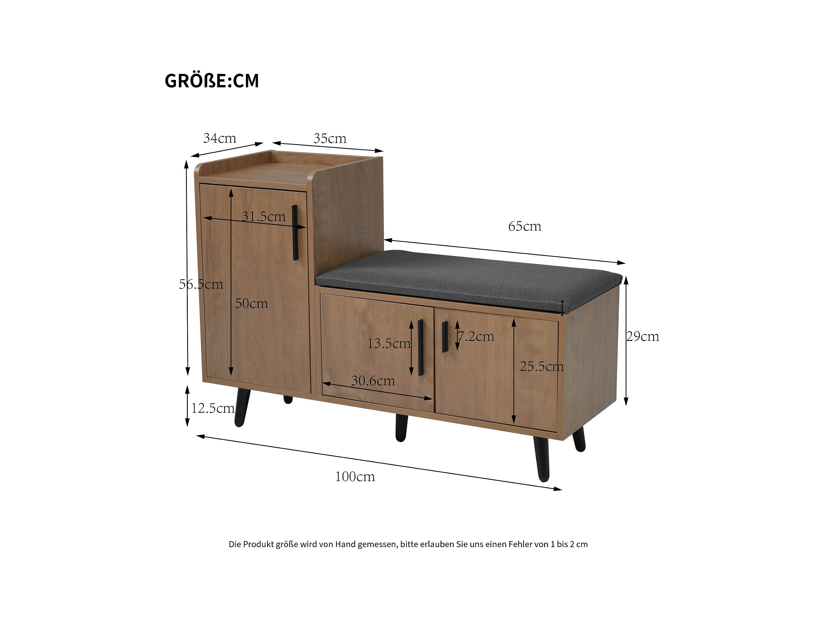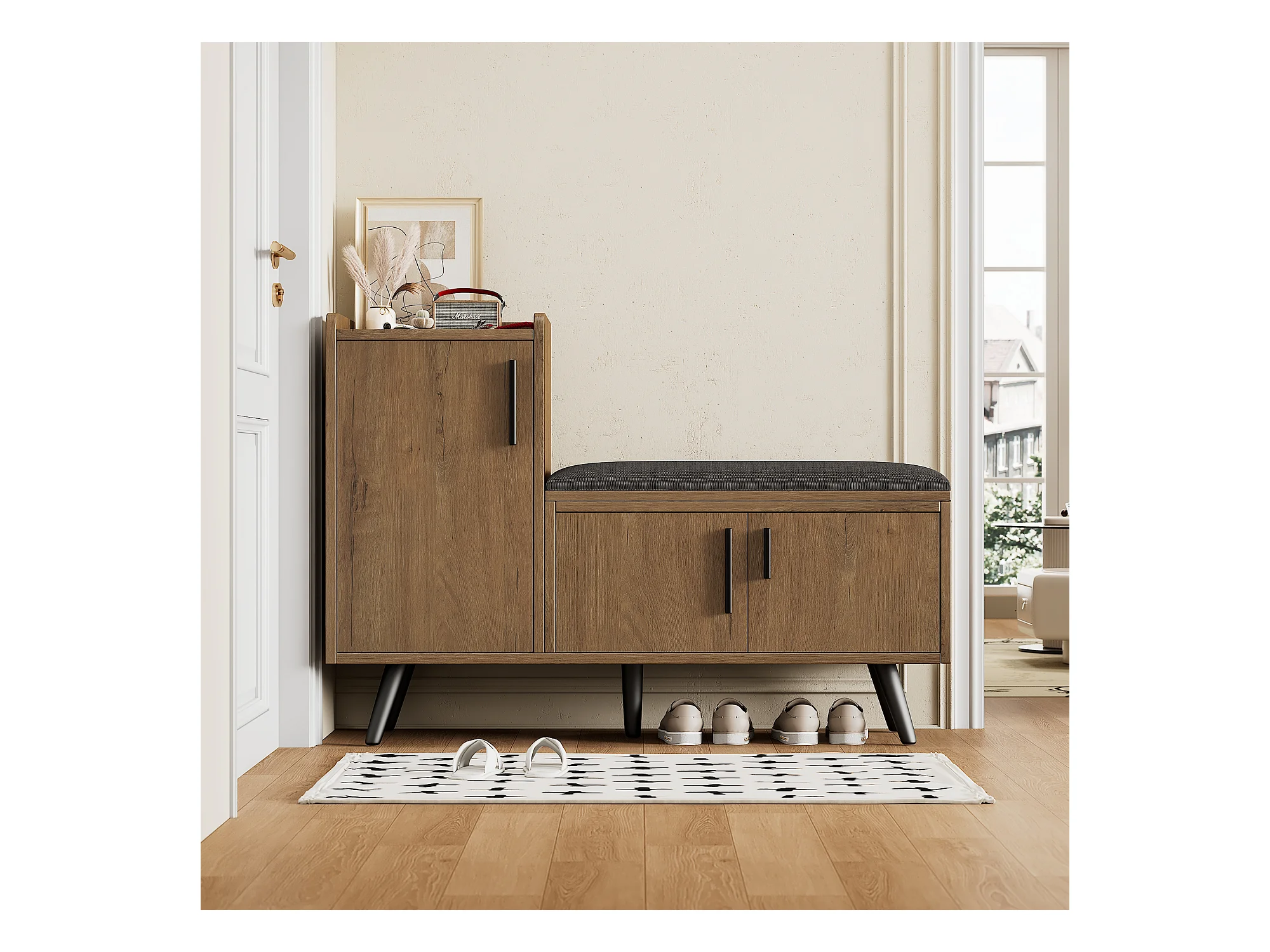 Nowoczesna ławka na buty z 3 drzwiami i poduszką - nogi i uchwyty metalowe - kolor naturalny - 100 x 34 x 69 cm