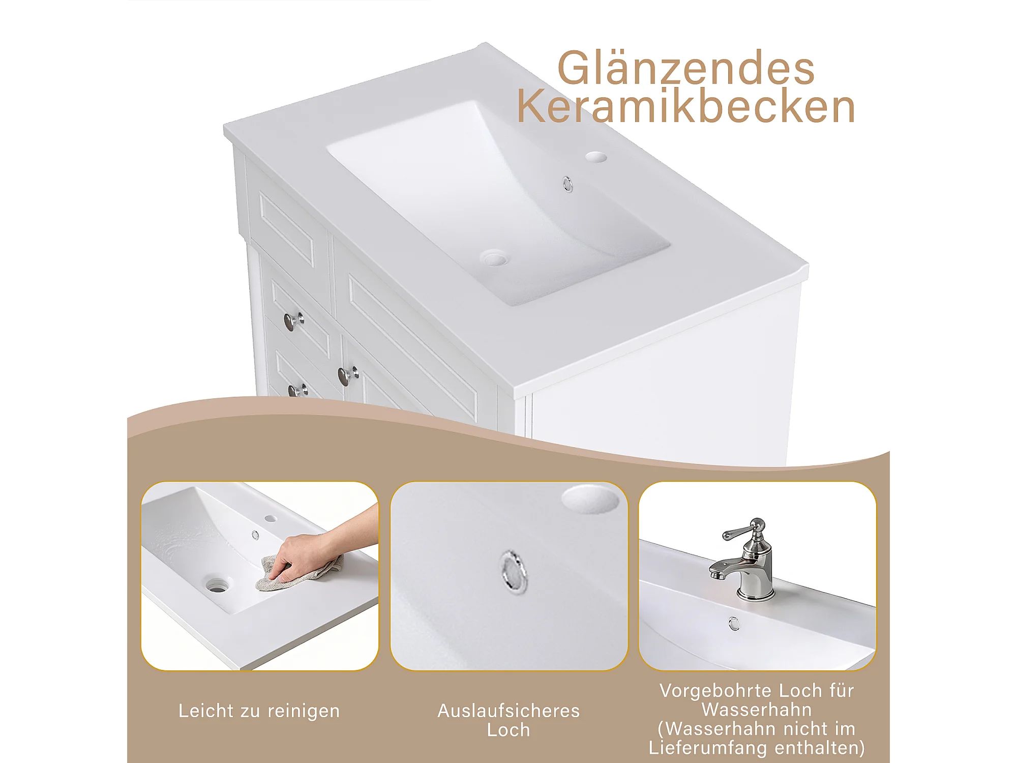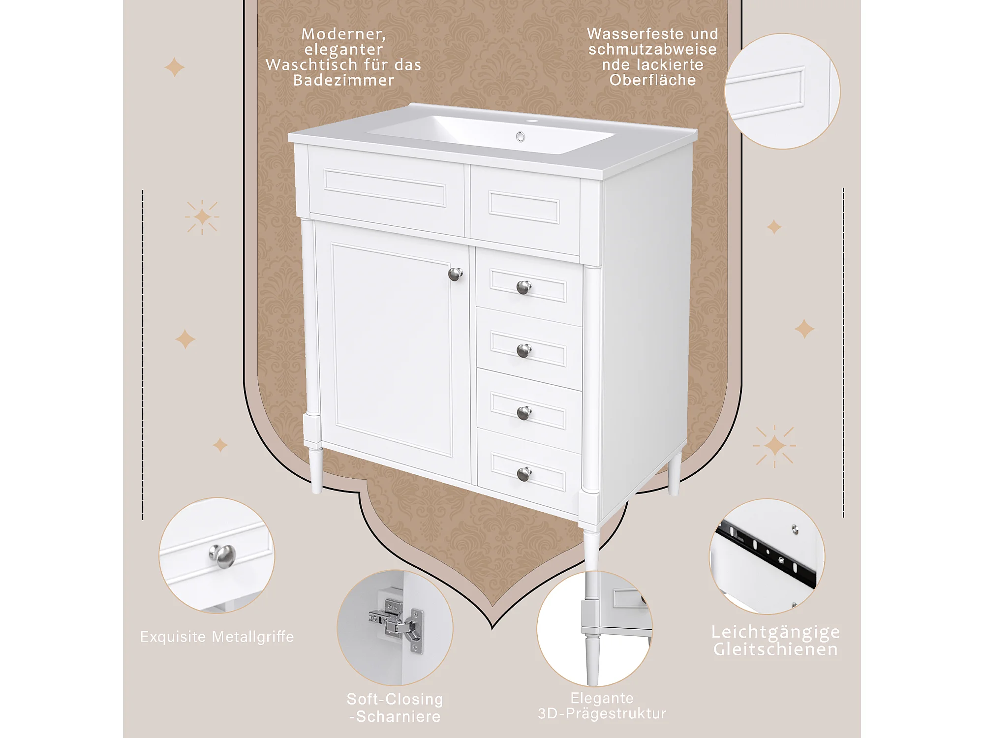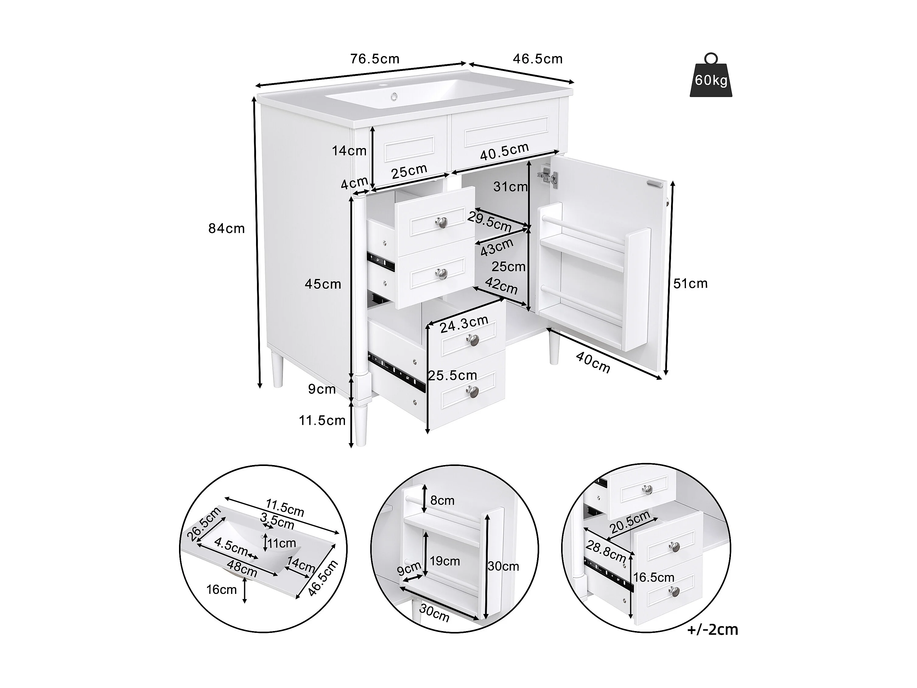 Nowoczesna wolnostojąca szafka pod umywalkę - 76,5 x 46,5 x 84 cm - z umywalką + 2 szufladami + drzwiami - Ceramika + MDF - biała