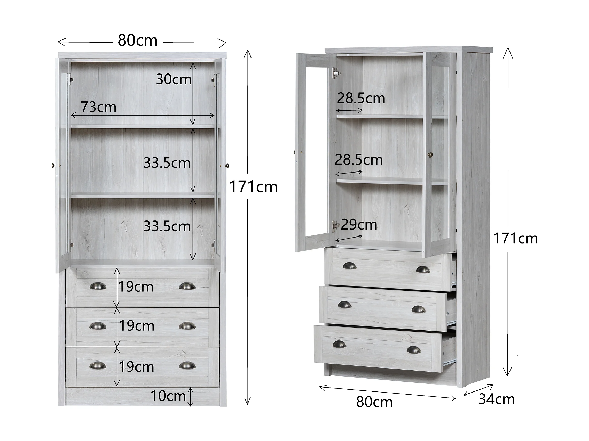 Witryna 80x34x171 cm - z 2 szklanymi drzwiami - 3 szuflady - szary + naturalny