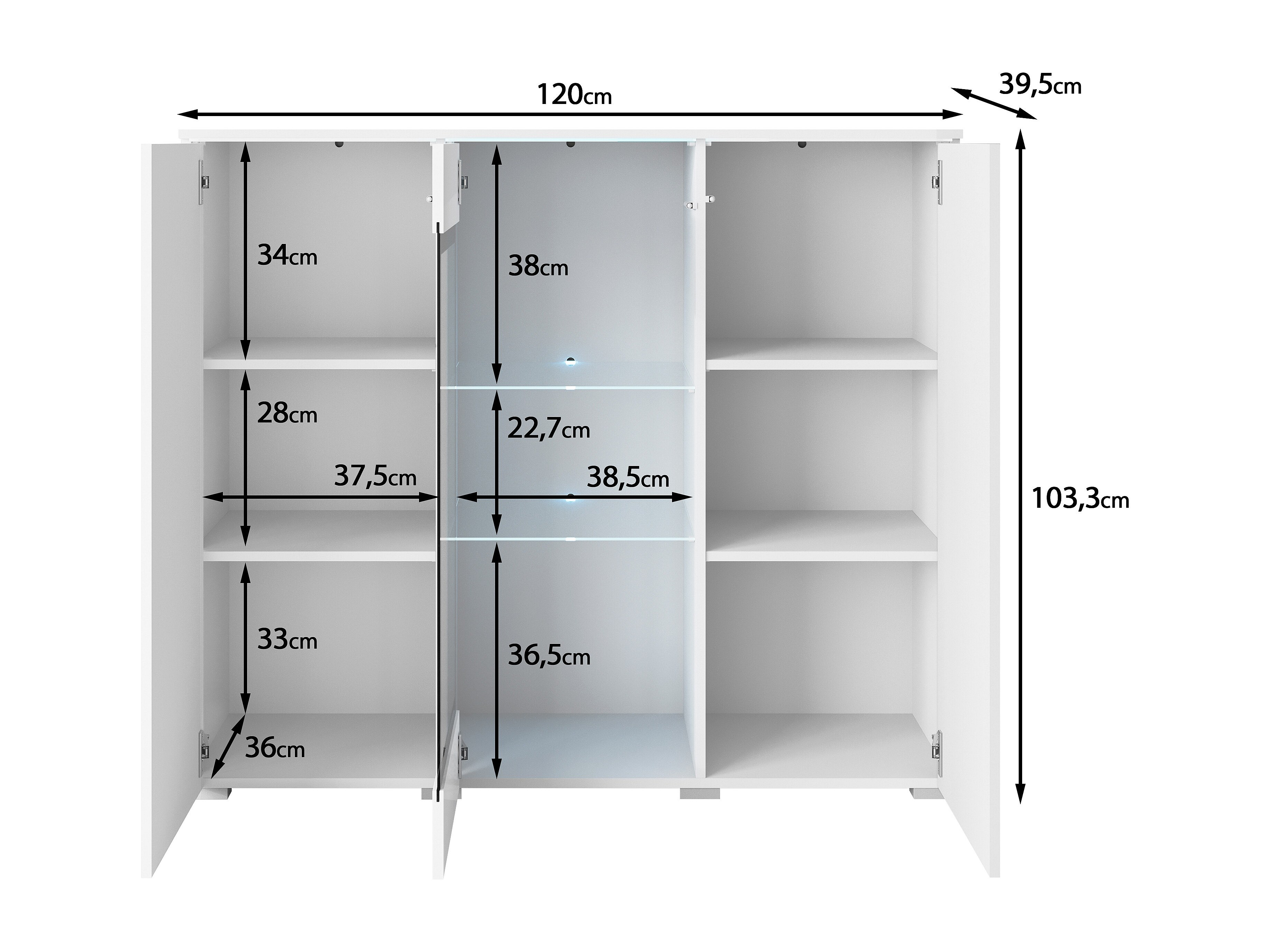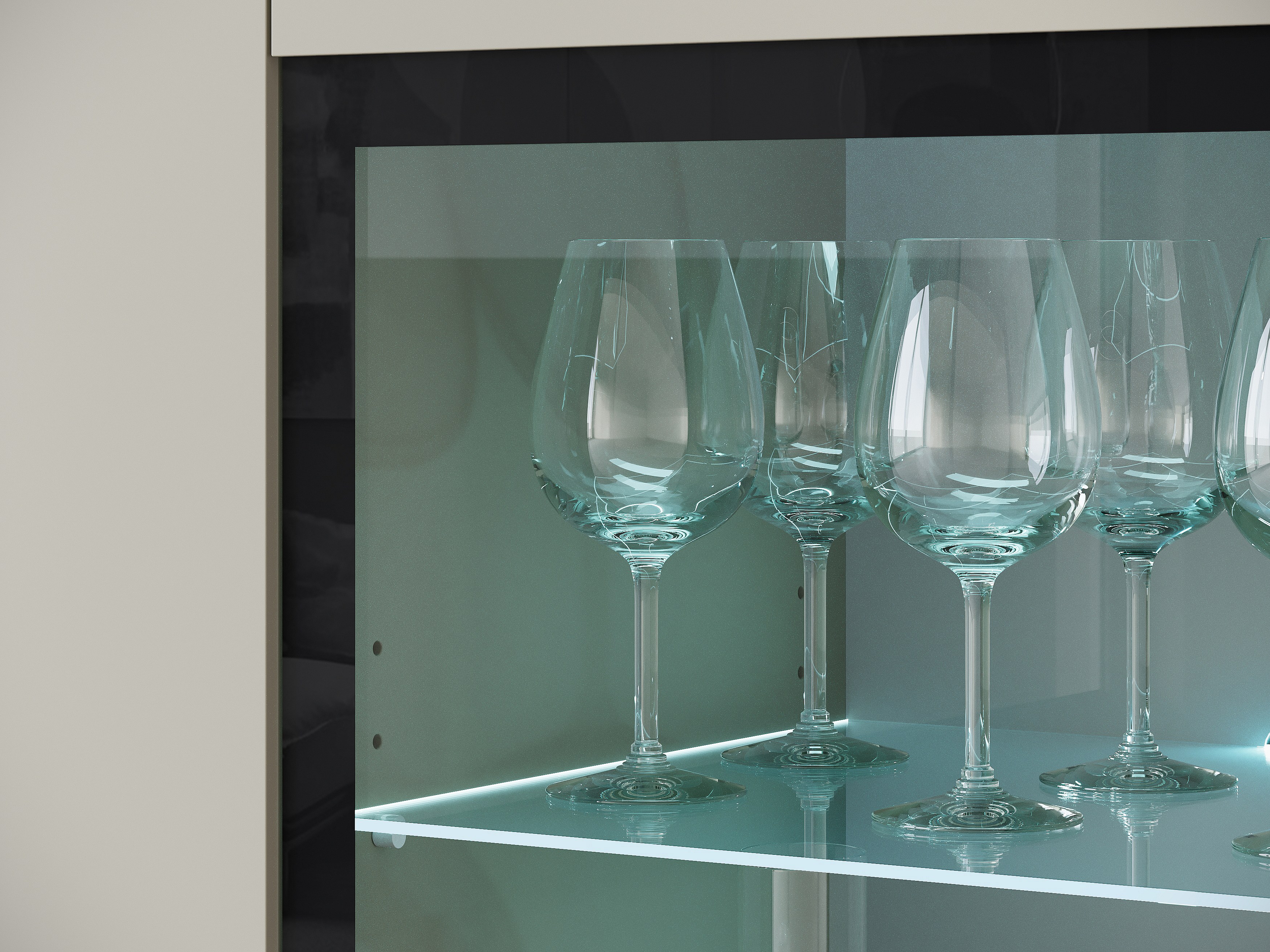 Nowoczesna wysoka witryna 120 cm do salonu z LED, 3-drzwiowa, kaszmirowy beż mat