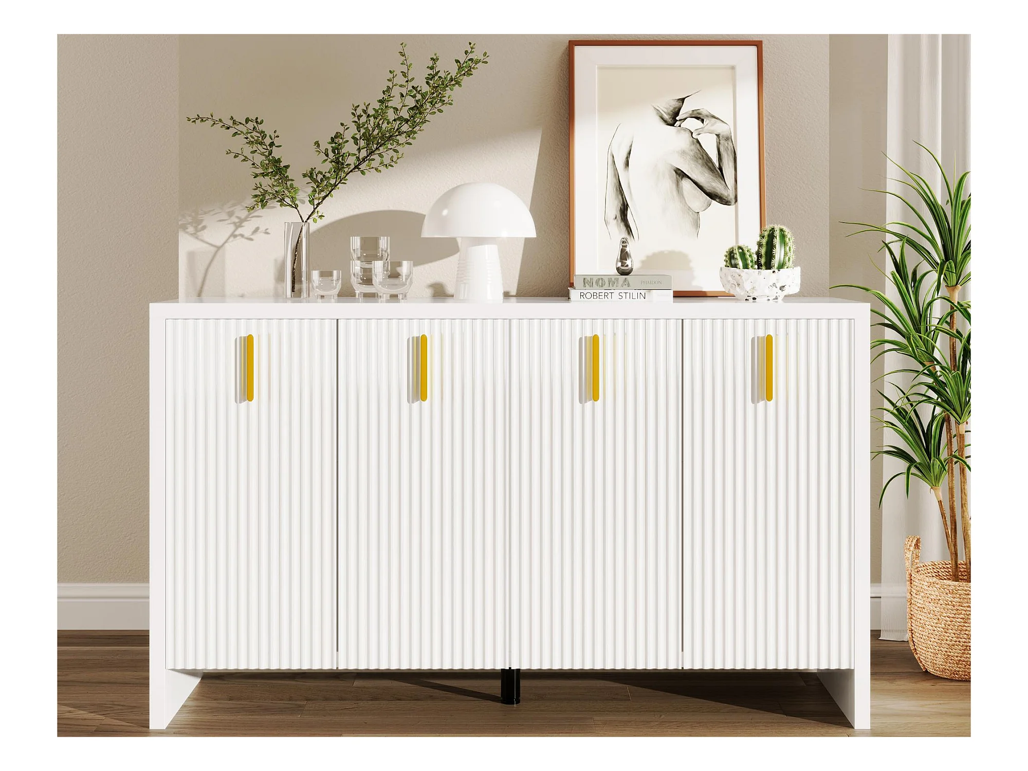 Nowoczesny niski kredens z 4 drzwiami - Złote uchwyty - Pionowy wzór pasów - Płyta wiórowa - Biały
