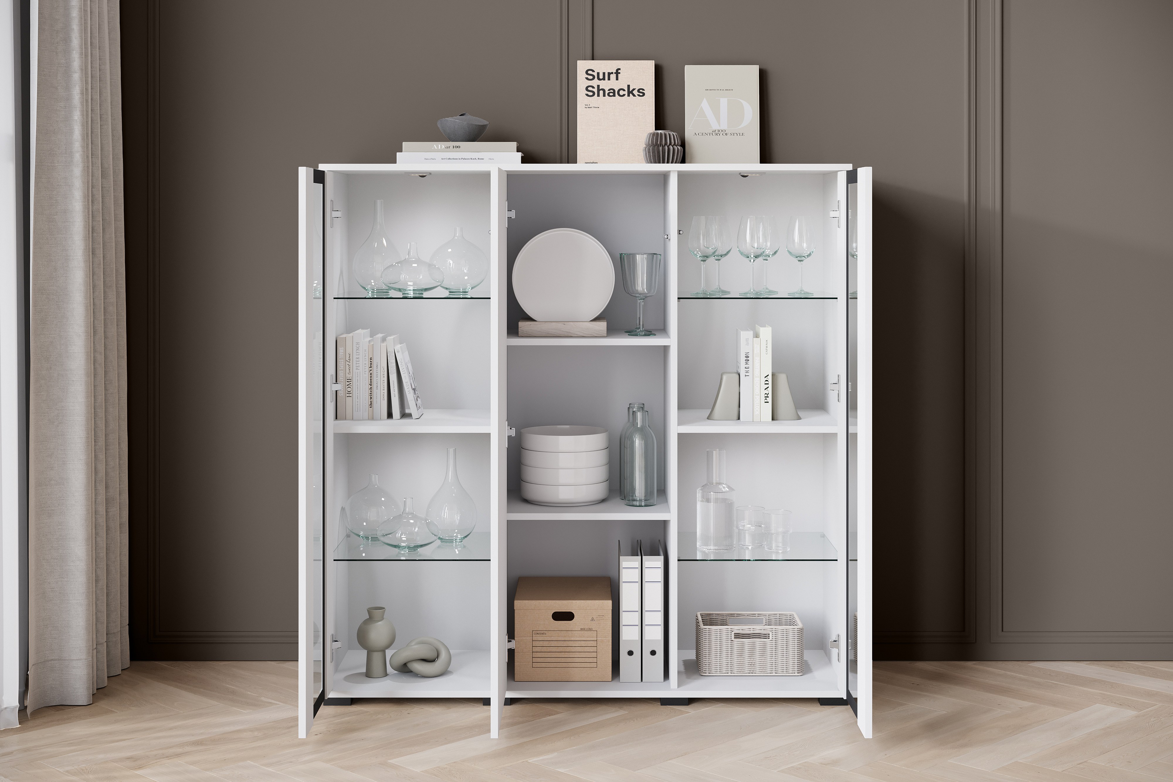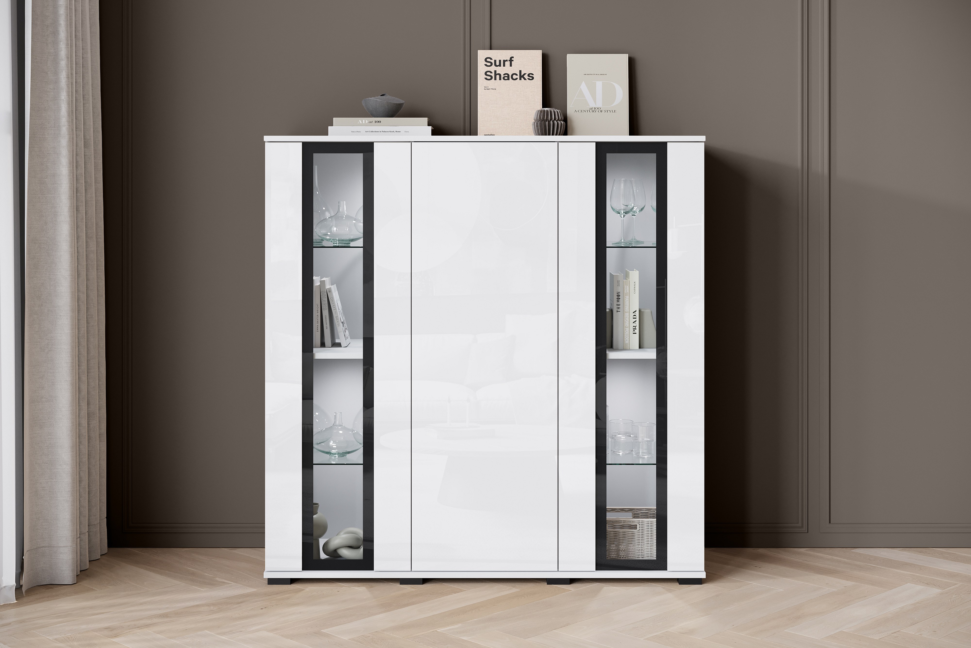 Nowoczesny highboard 120 cm z LED – wysoka witryna do salonu z przeszkleniami, korpus biały mat fronty biały połysk