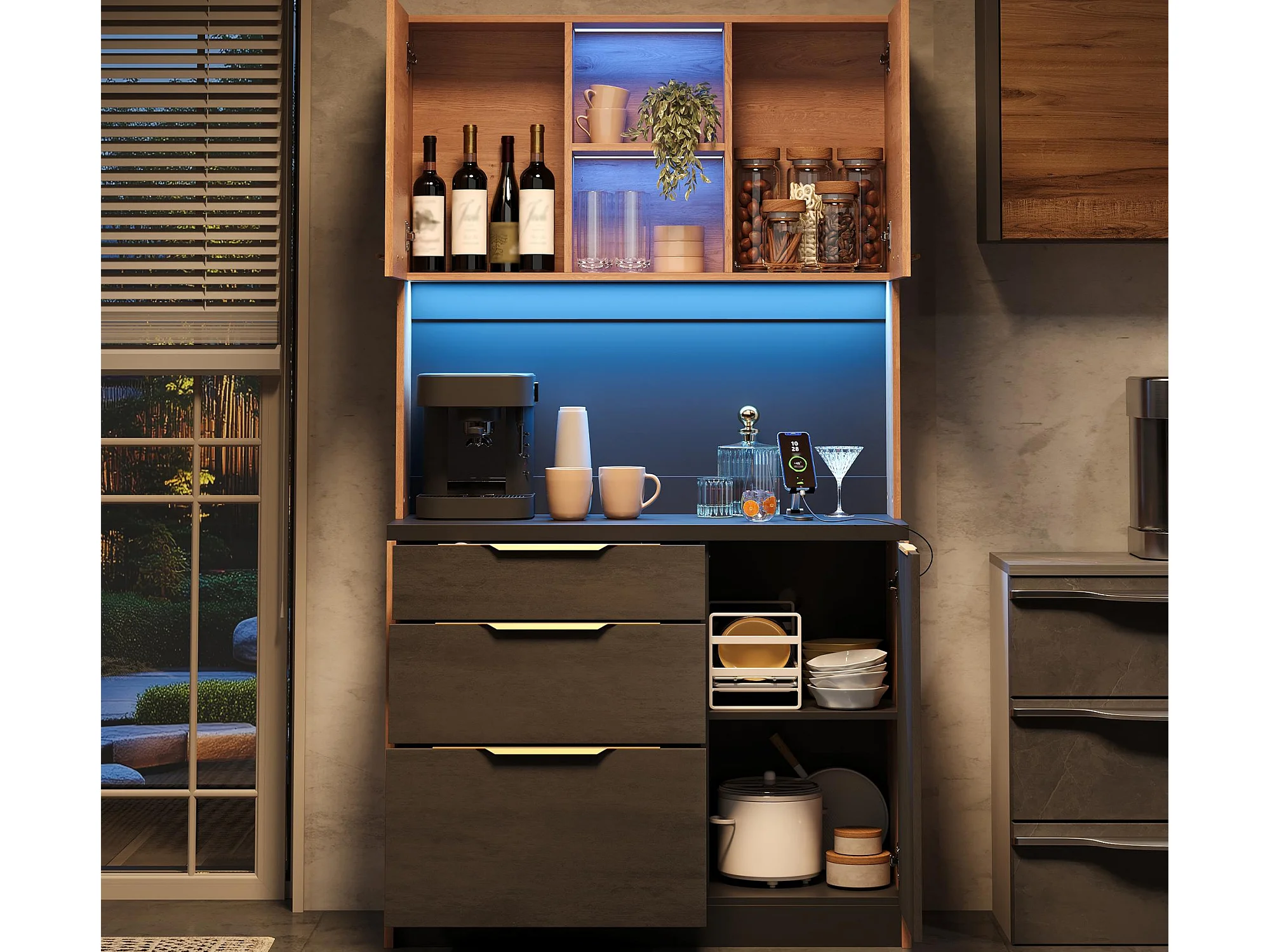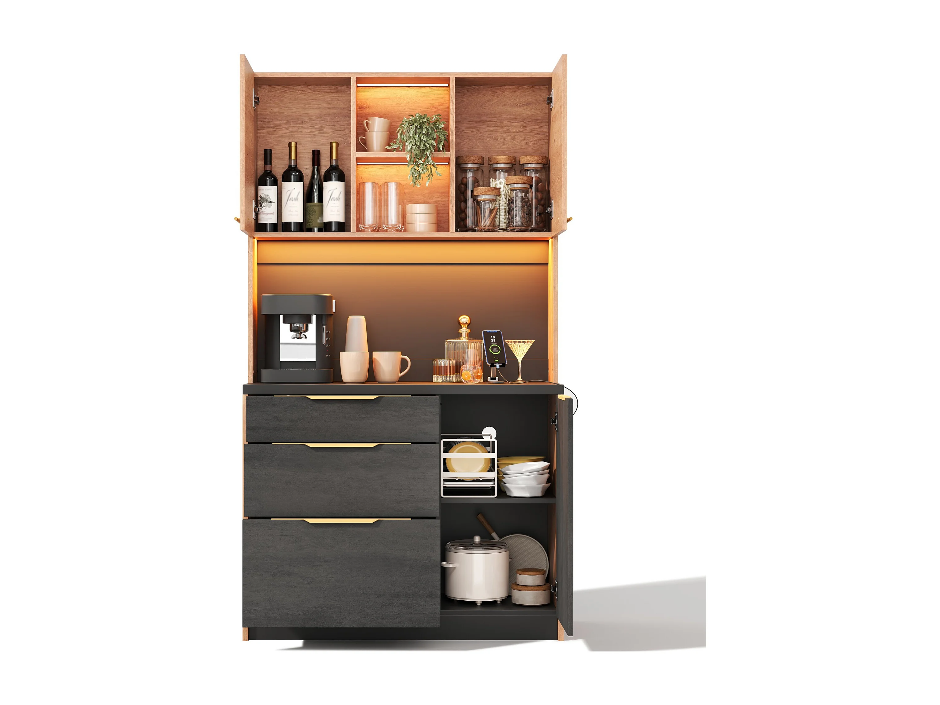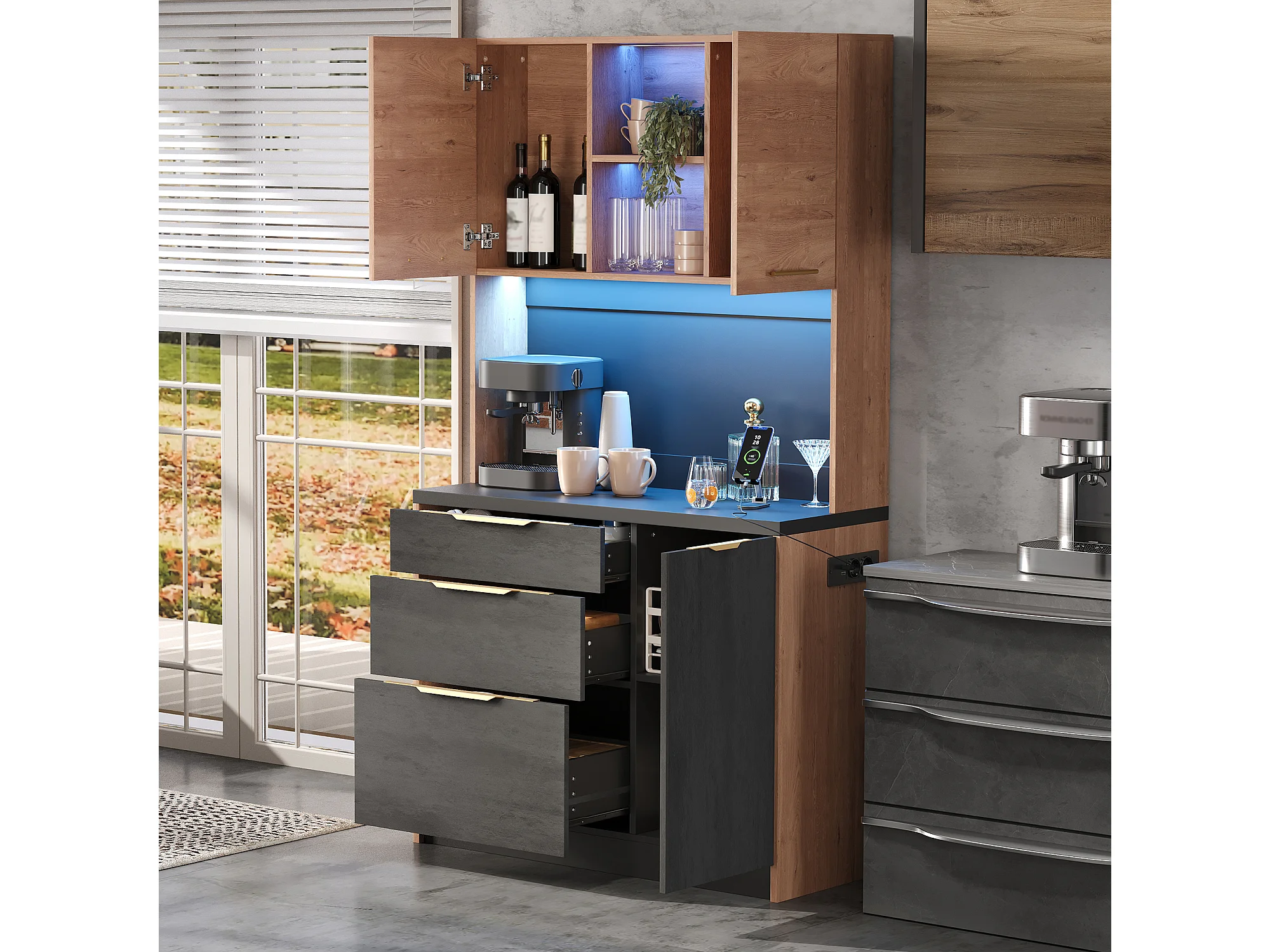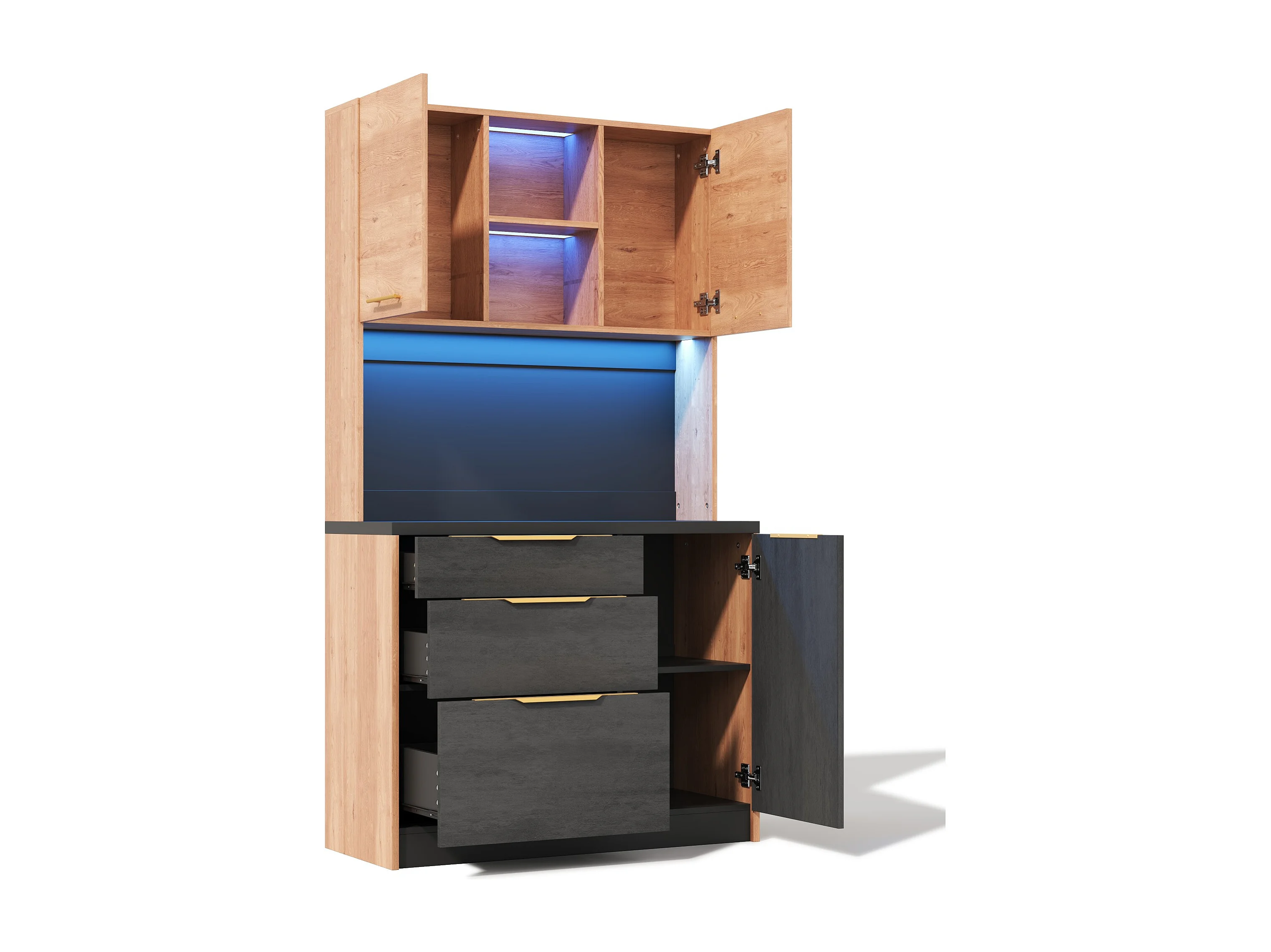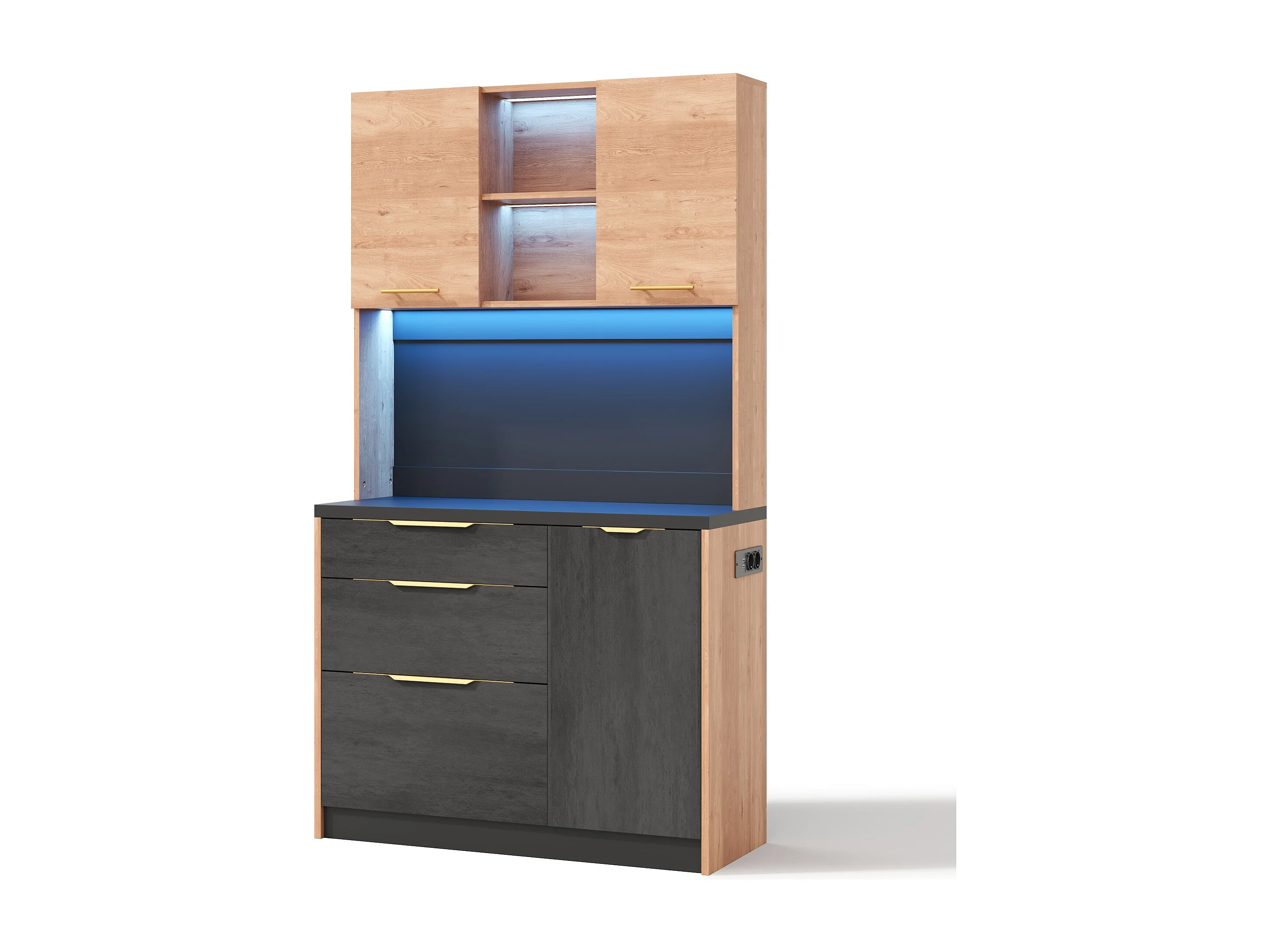 Nowoczesny kredens kuchenny 100x40x180cm - z gniazdkiem i LED - z 3 szufladami i 3 drzwiami - Naturalny + Czarny