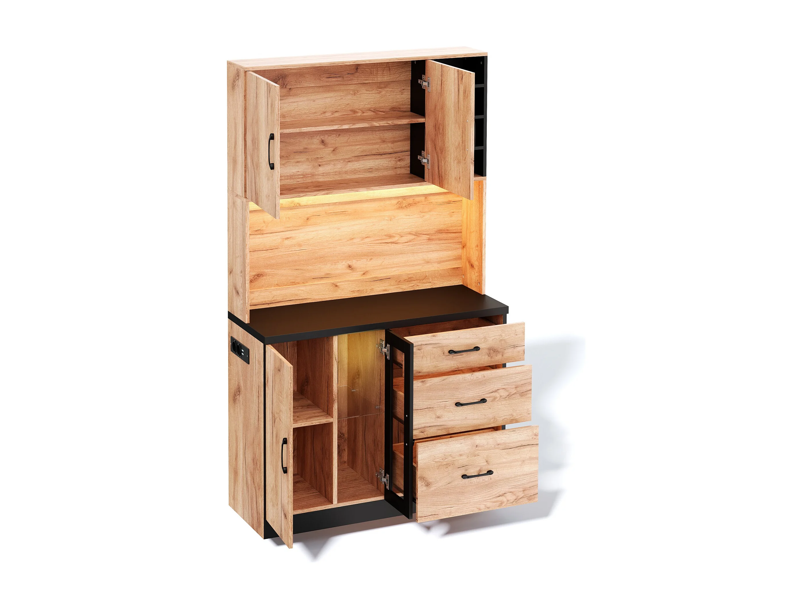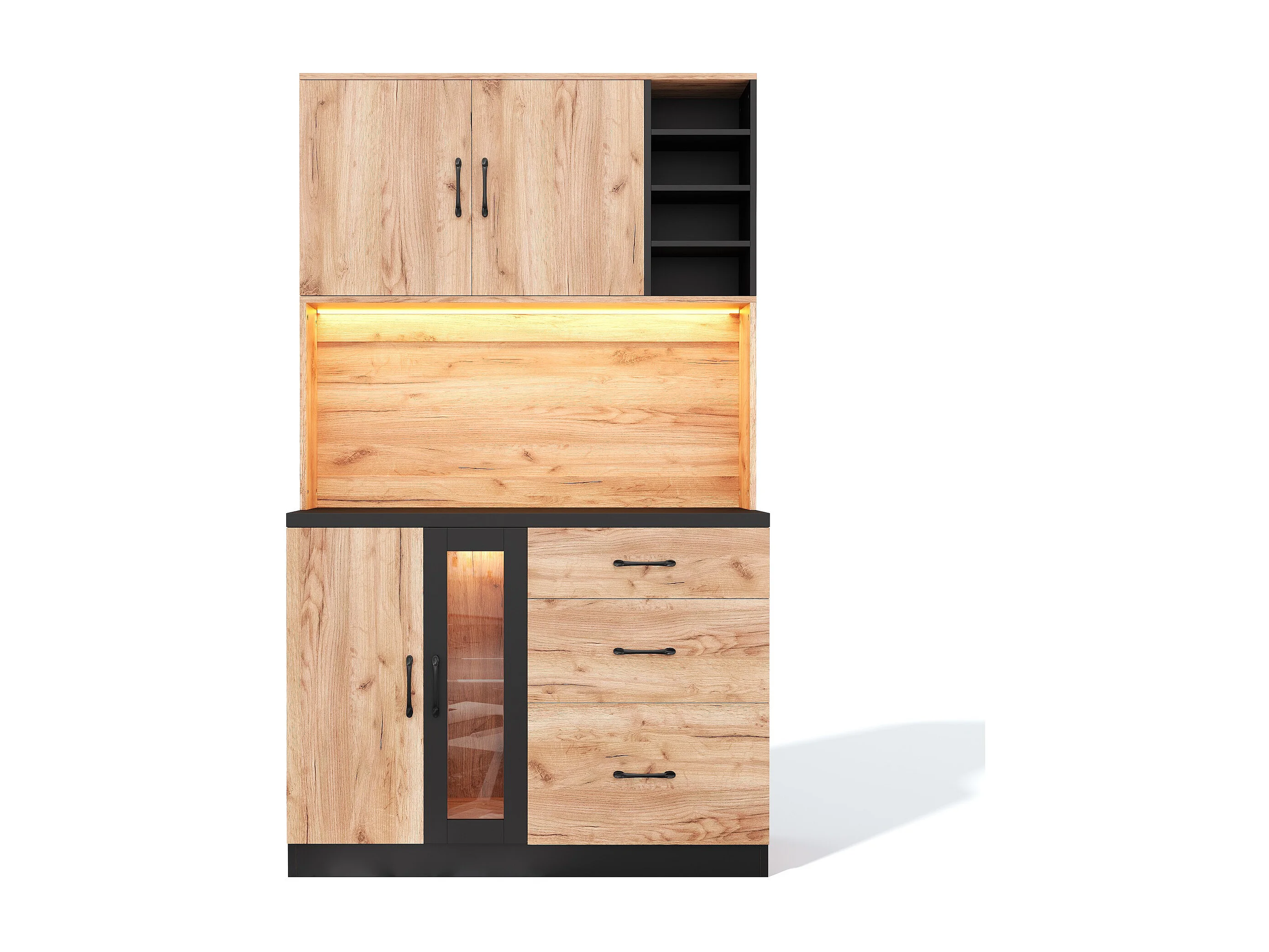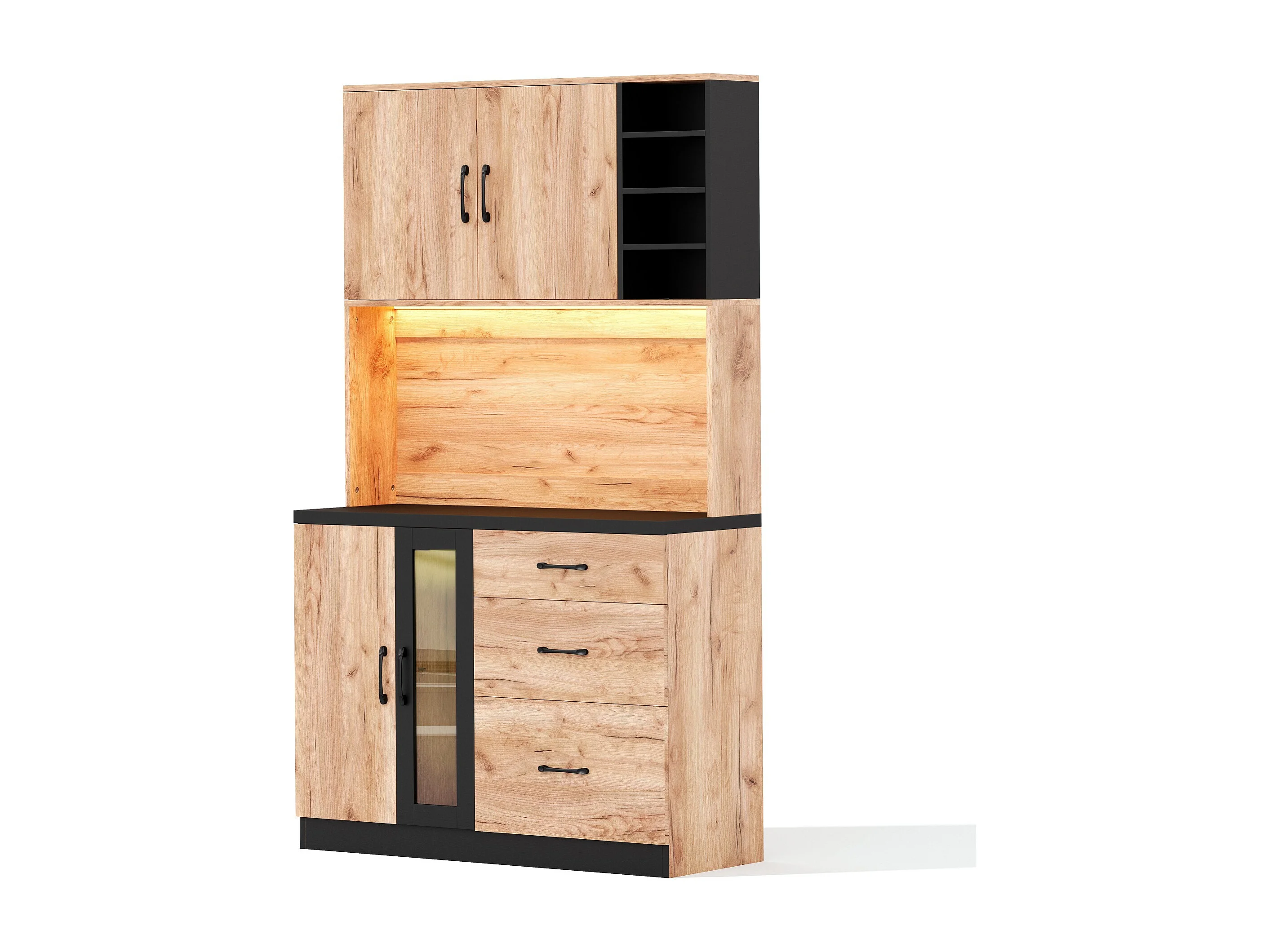 Nowoczesny kredens kuchenny 105x40x180cm - z gniazdkiem i LED - z 3 szufladami i 3 drzwiami - wygląd słojów drewna - Naturalny + Czarny