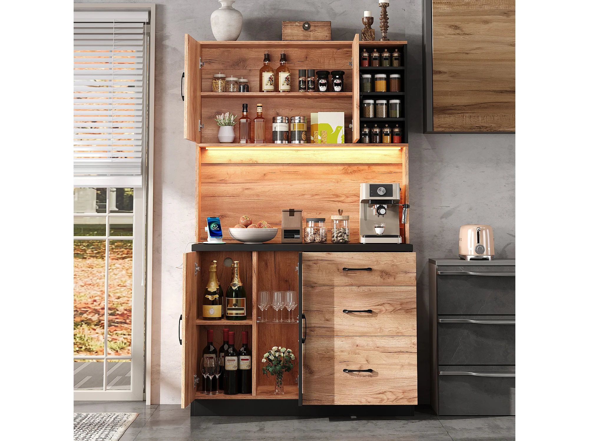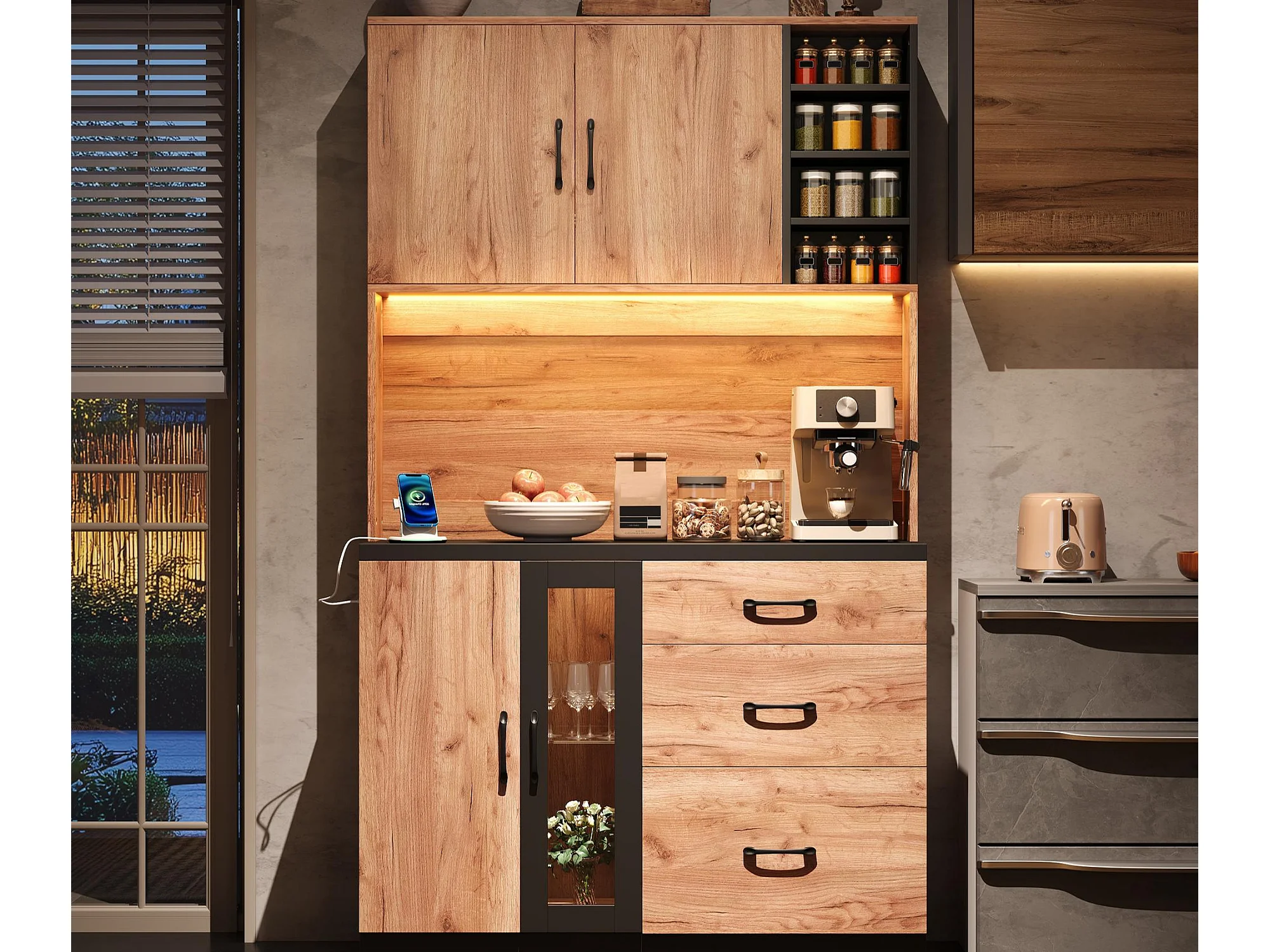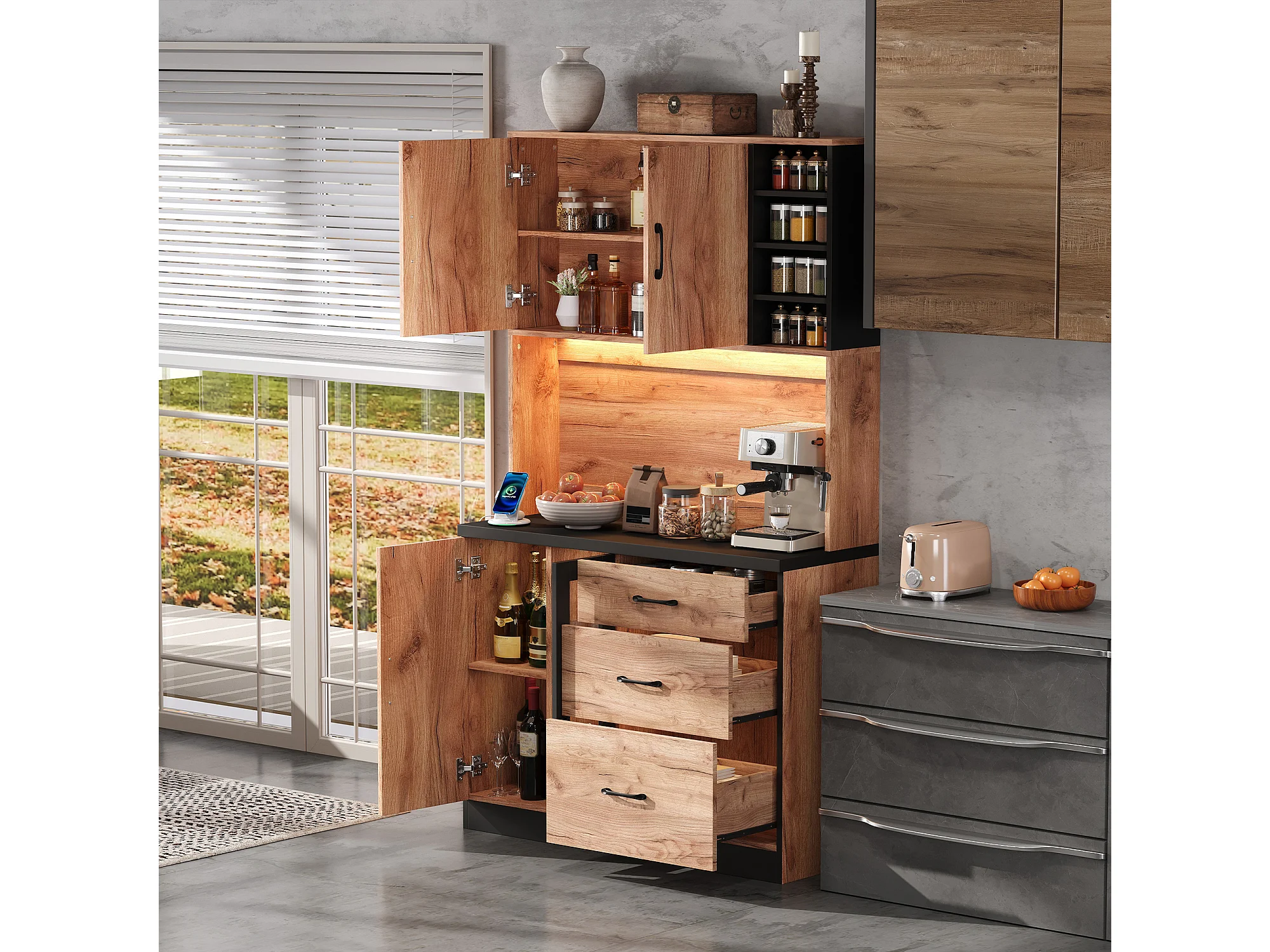 Nowoczesny kredens kuchenny 105x40x180cm - z gniazdkiem i LED - z 3 szufladami i 3 drzwiami - wygląd słojów drewna - Naturalny + Czarny
