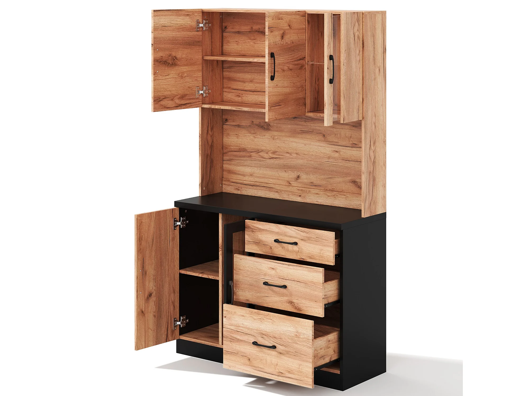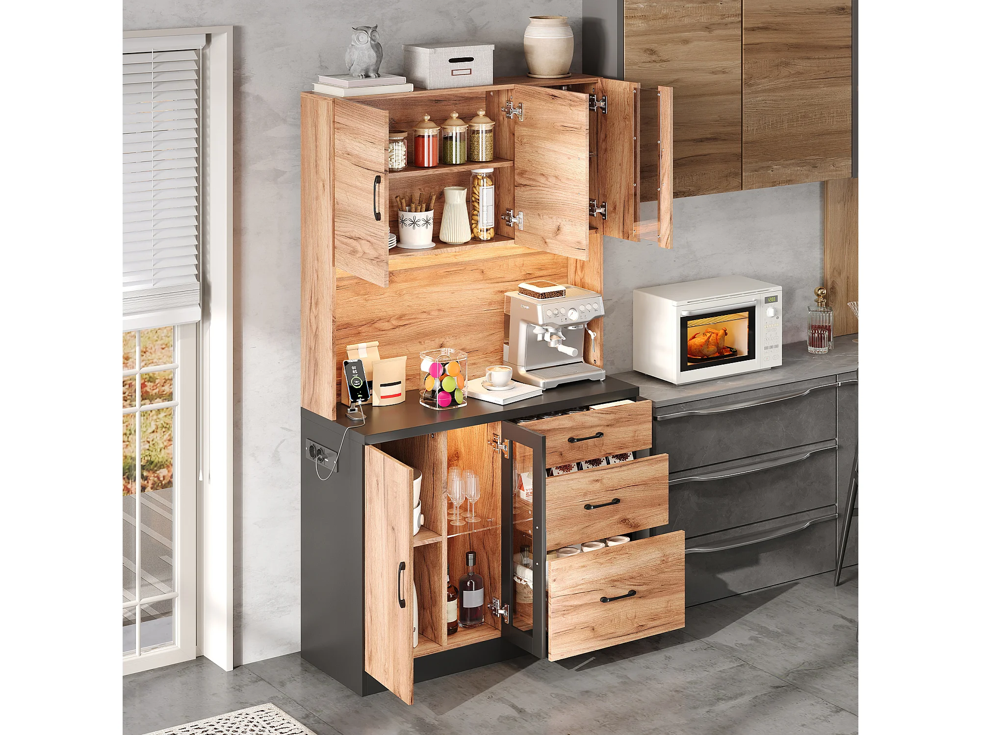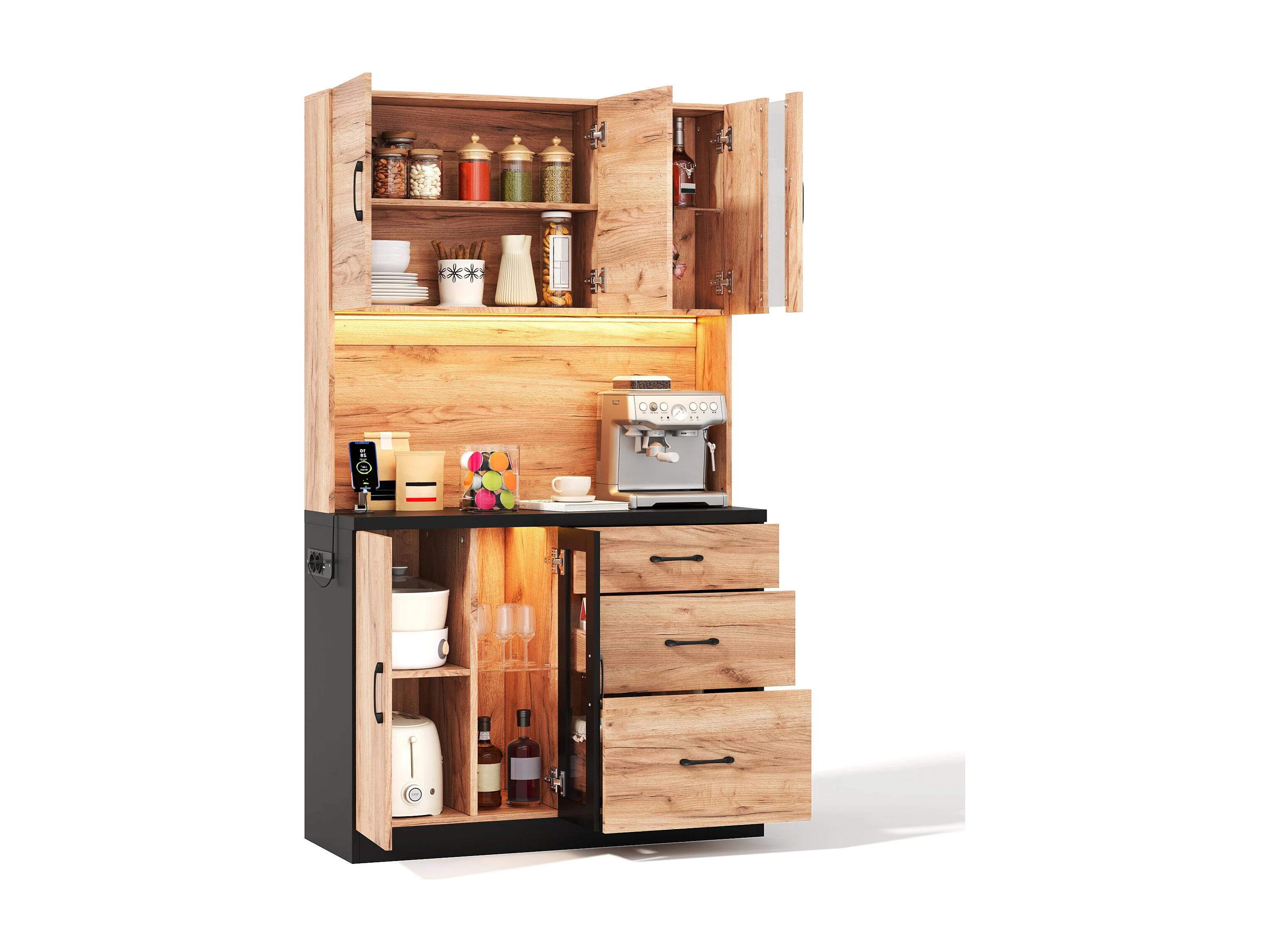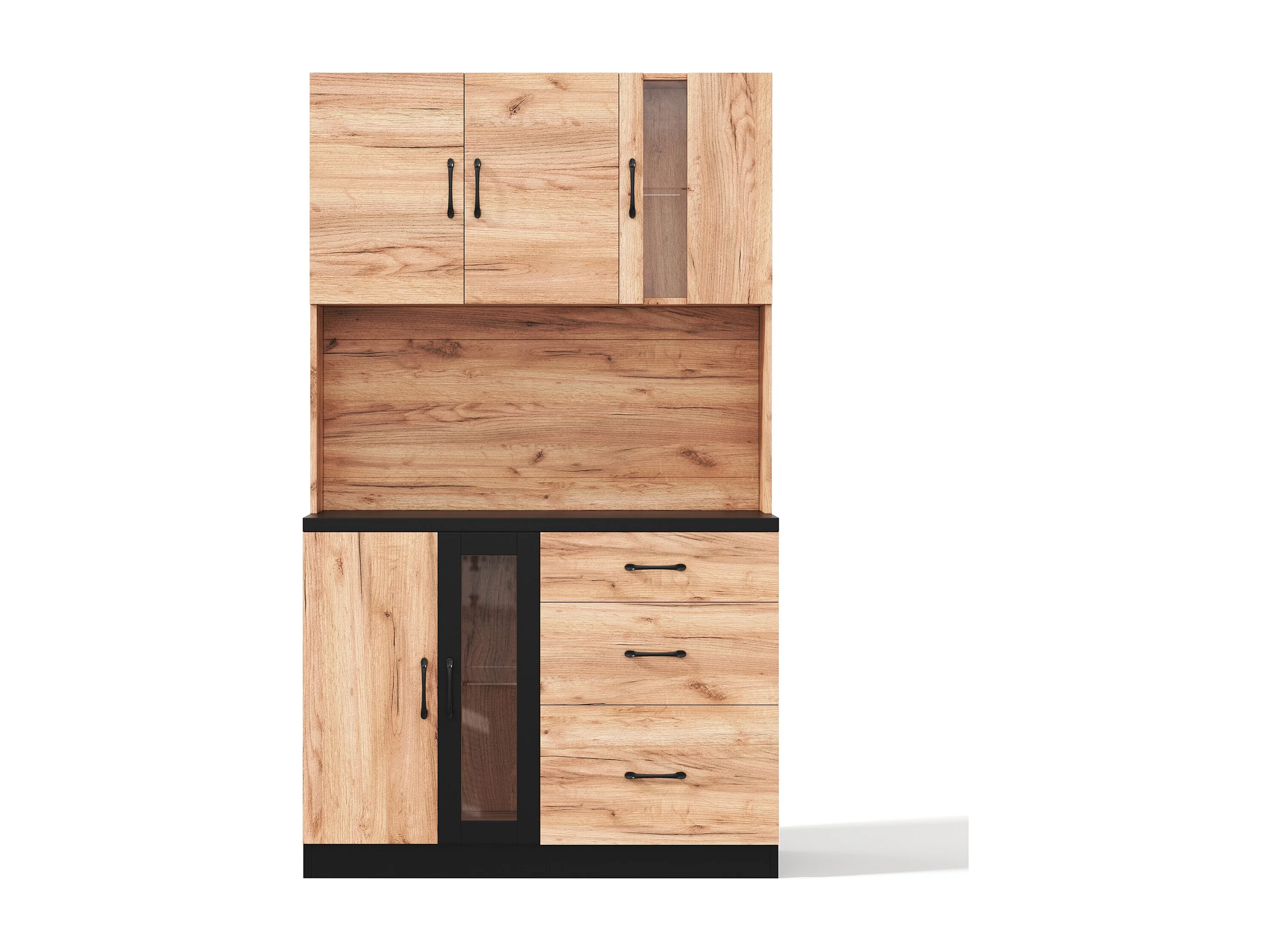Nowoczesny kredens kuchenny 105x40x180cm - z gniazdkiem i LED - z 3 szufladami i 4 drzwiami - wygląd słojów drewna - Naturalny + Czarny