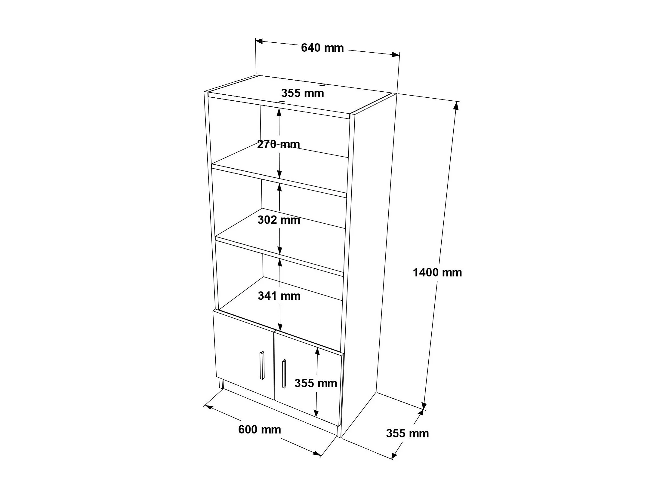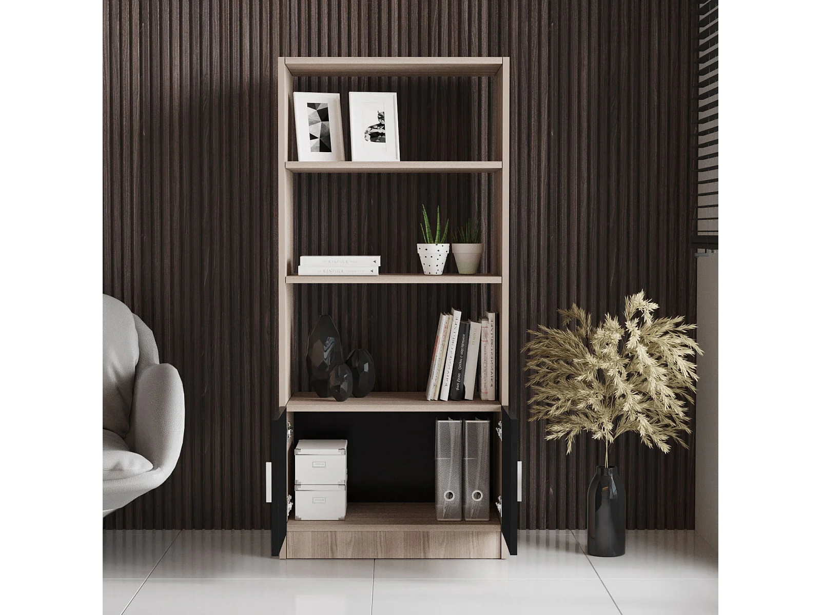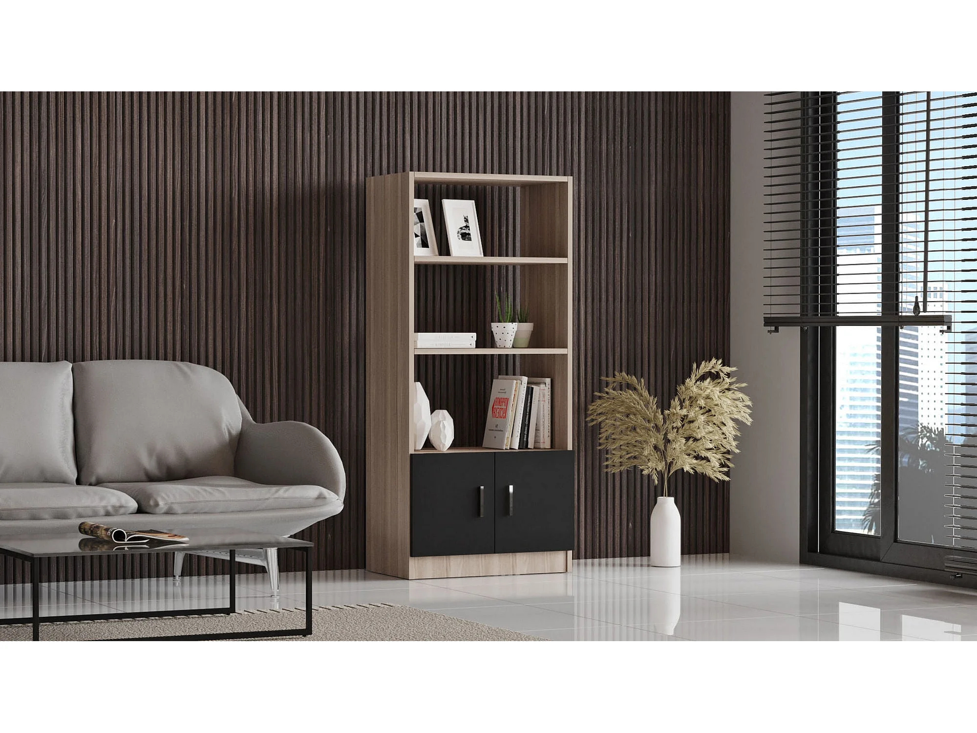 Nowoczesny regał na książki w kolorze dębu i czerni, szer. 25" x wys. 55" x gł. 15" | Płyta wiórowa pokryta melaminą w 100%, grubość 0,75" |