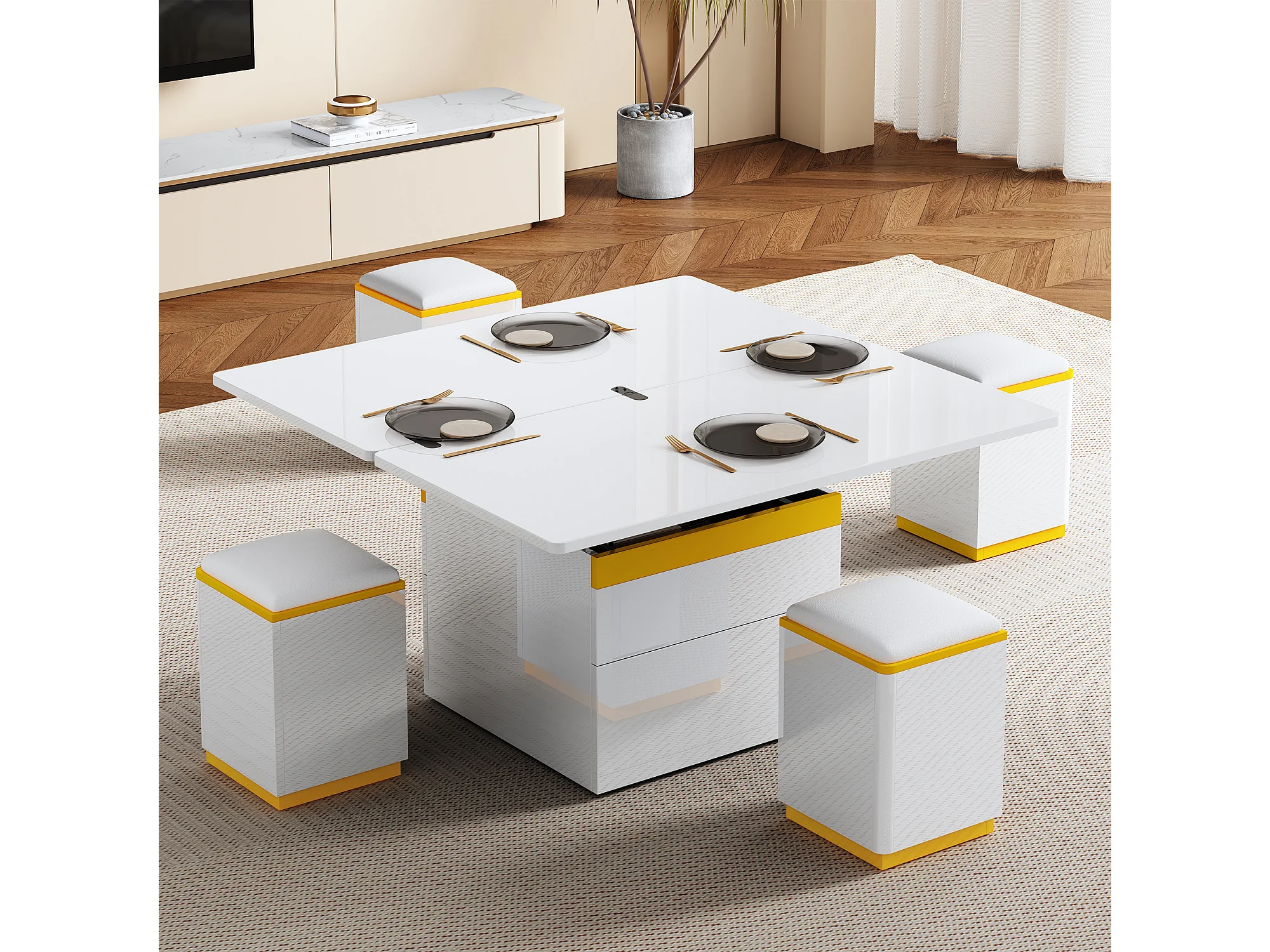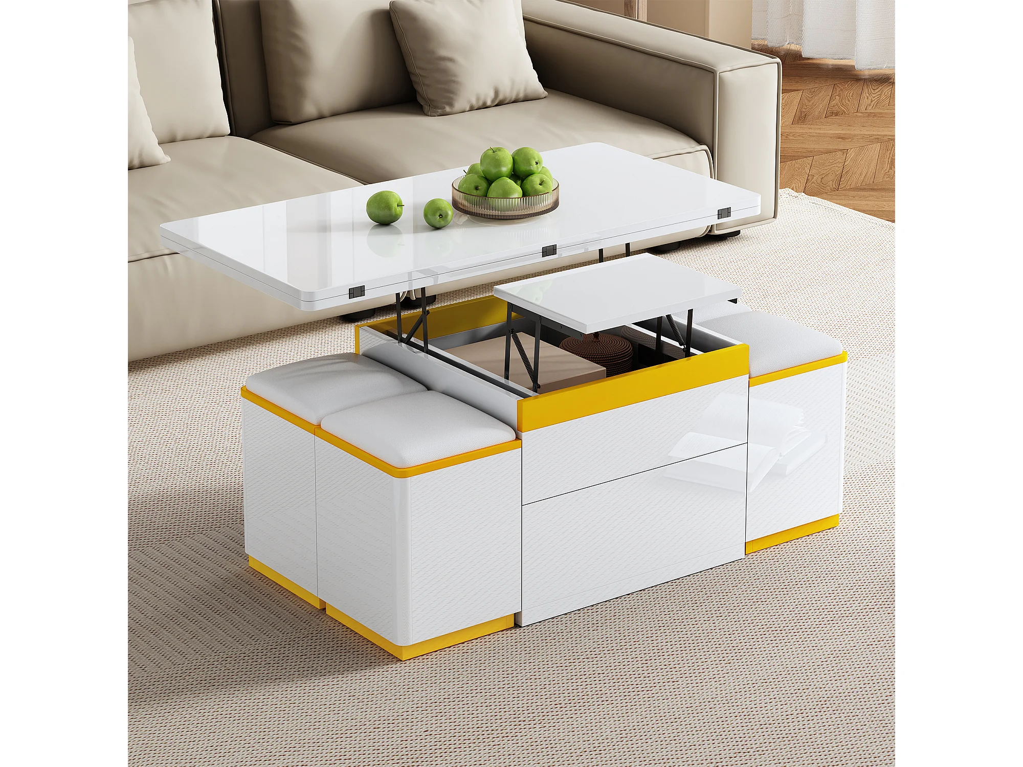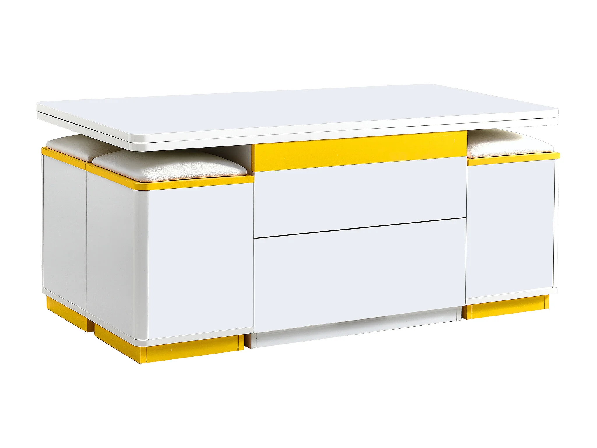 Nowoczesny stolik kawowy regulowany 100x50x43cm - z 4 taborecikami do przechowywania - 1 szuflada - Biały