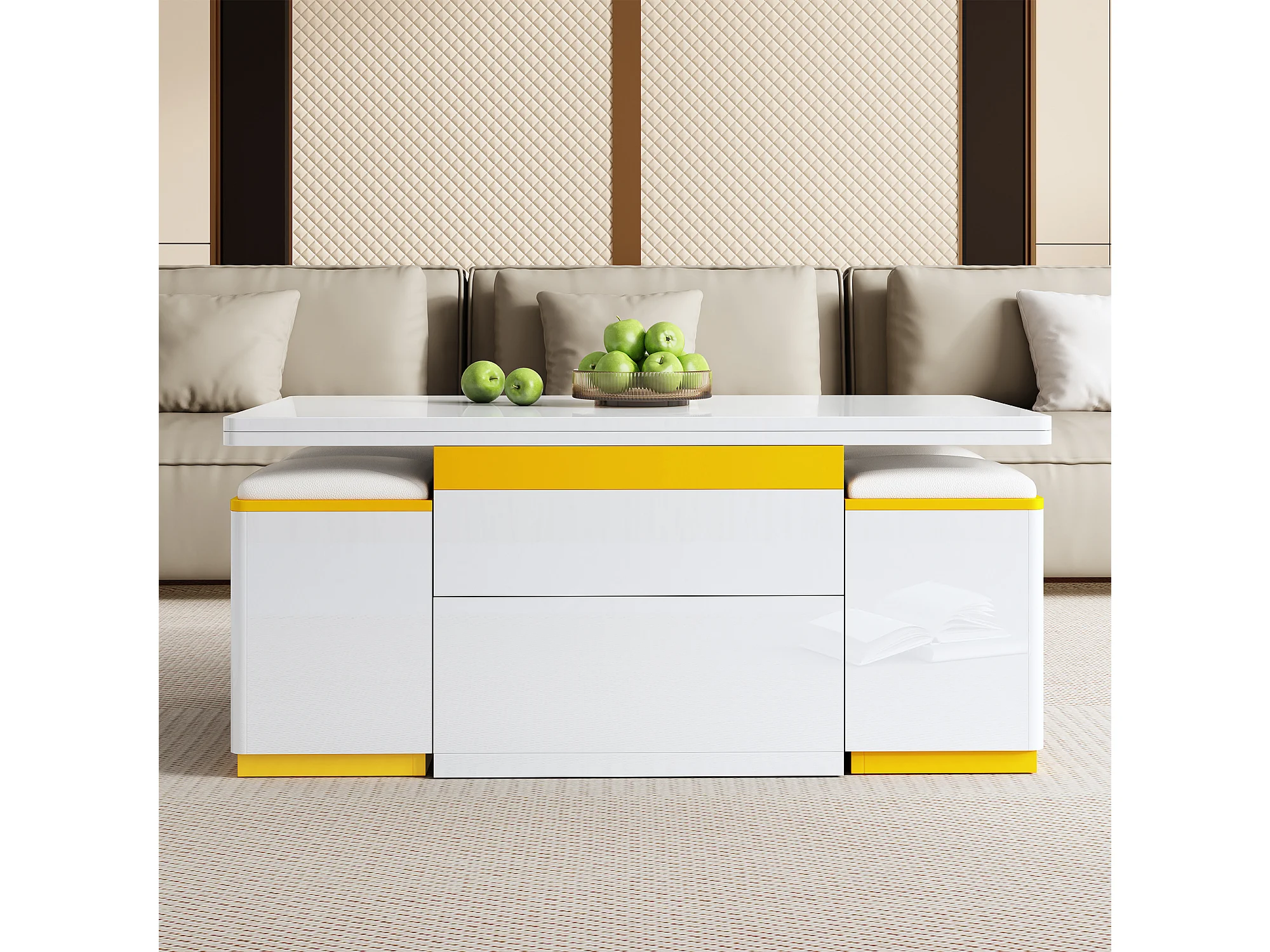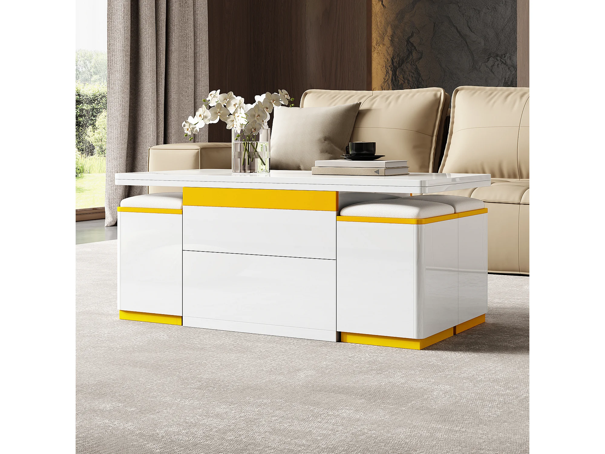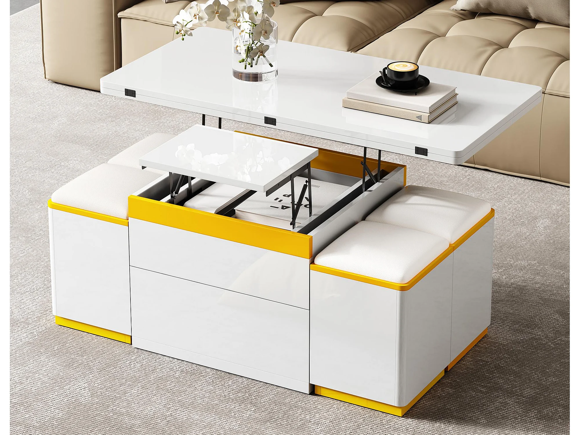 Nowoczesny stolik kawowy regulowany 100x50x43cm - z 4 taborecikami do przechowywania - 1 szuflada - Biały