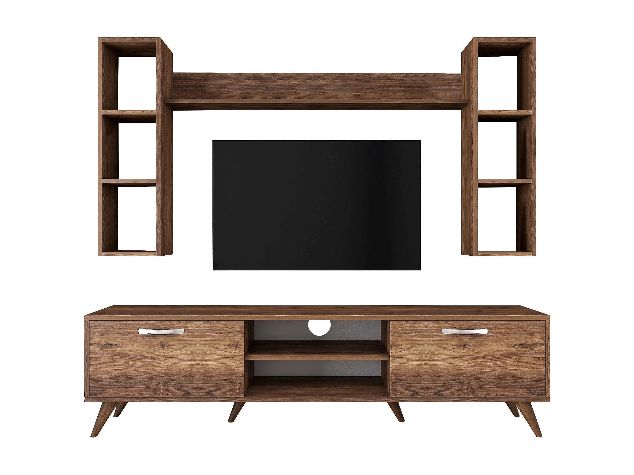 Nowoczesna szafka pod telewizor – 180 x 143 x 30 cm – Kolor biały i orzechowy – Płyta wiórowa pokryta melaminą