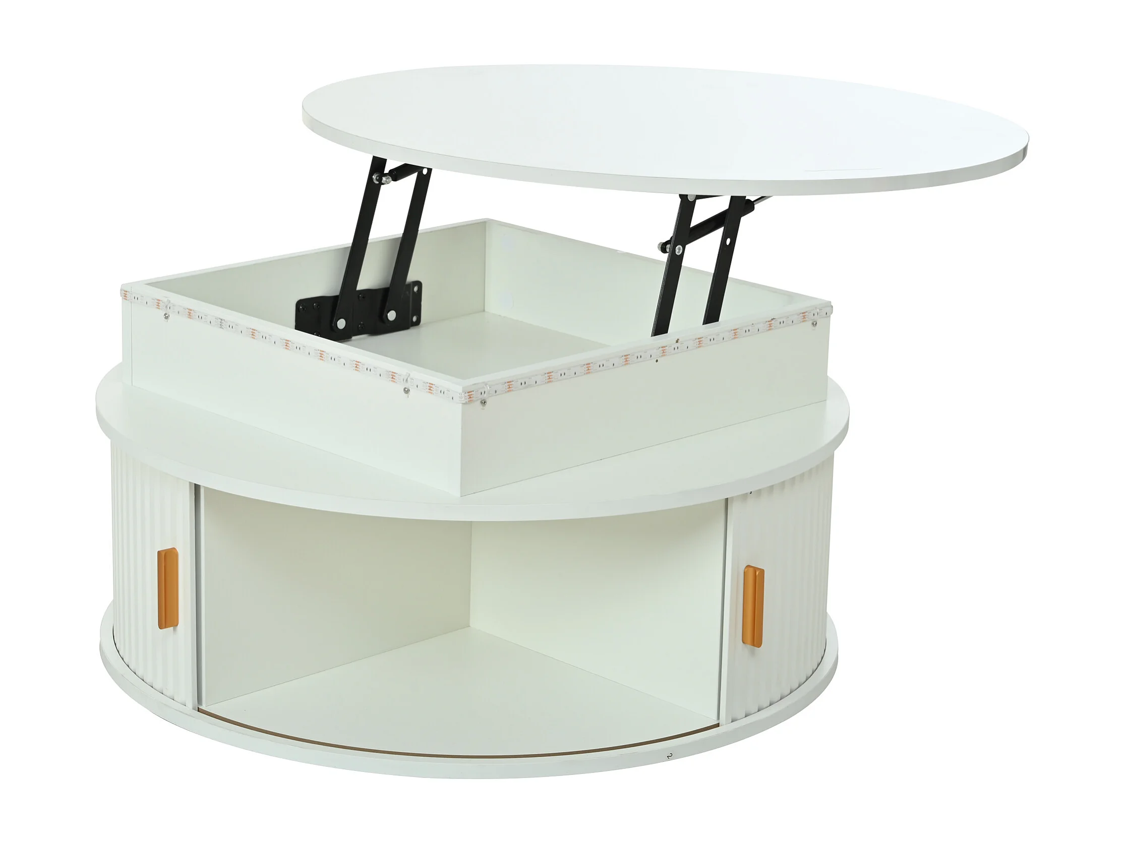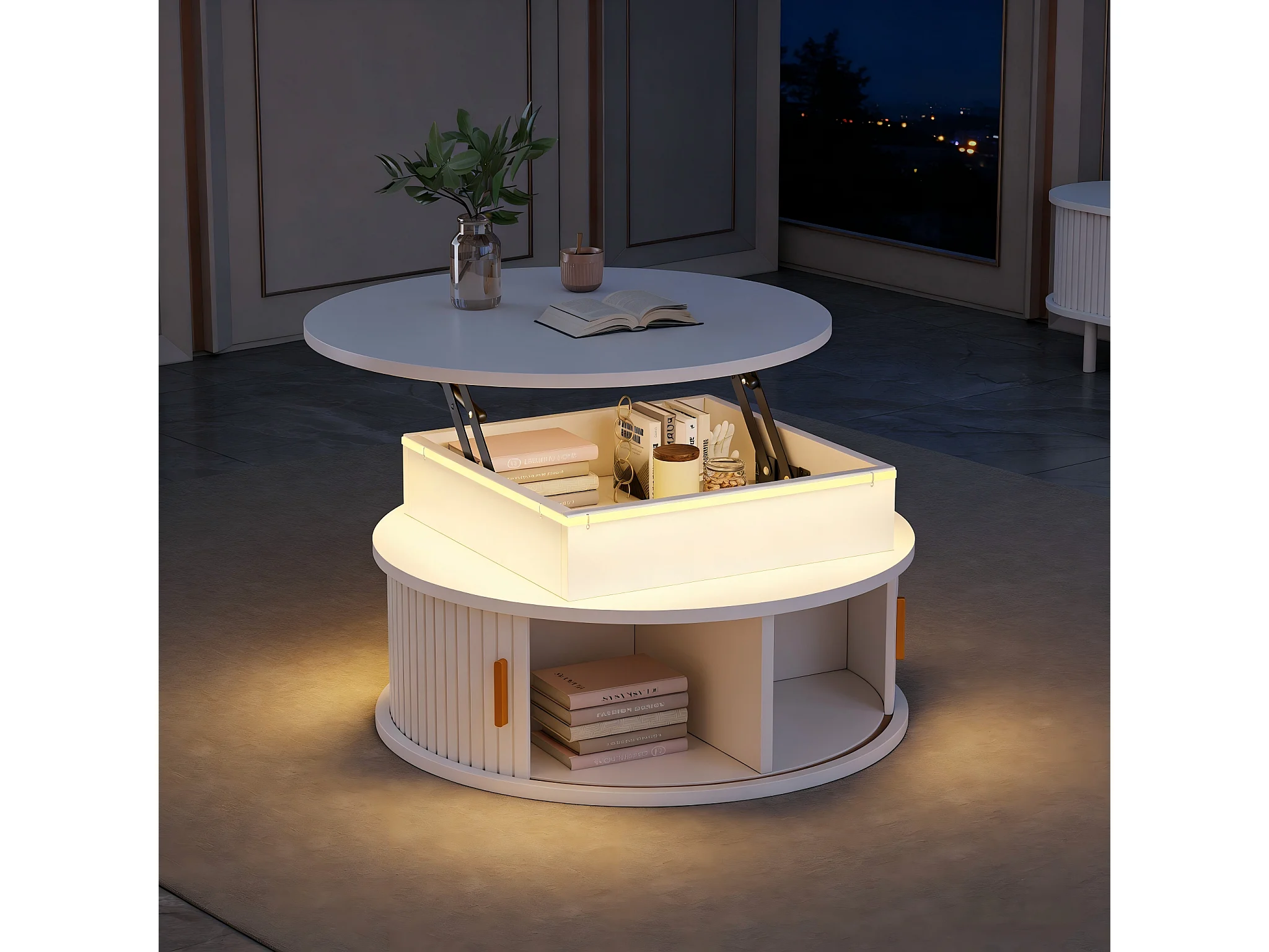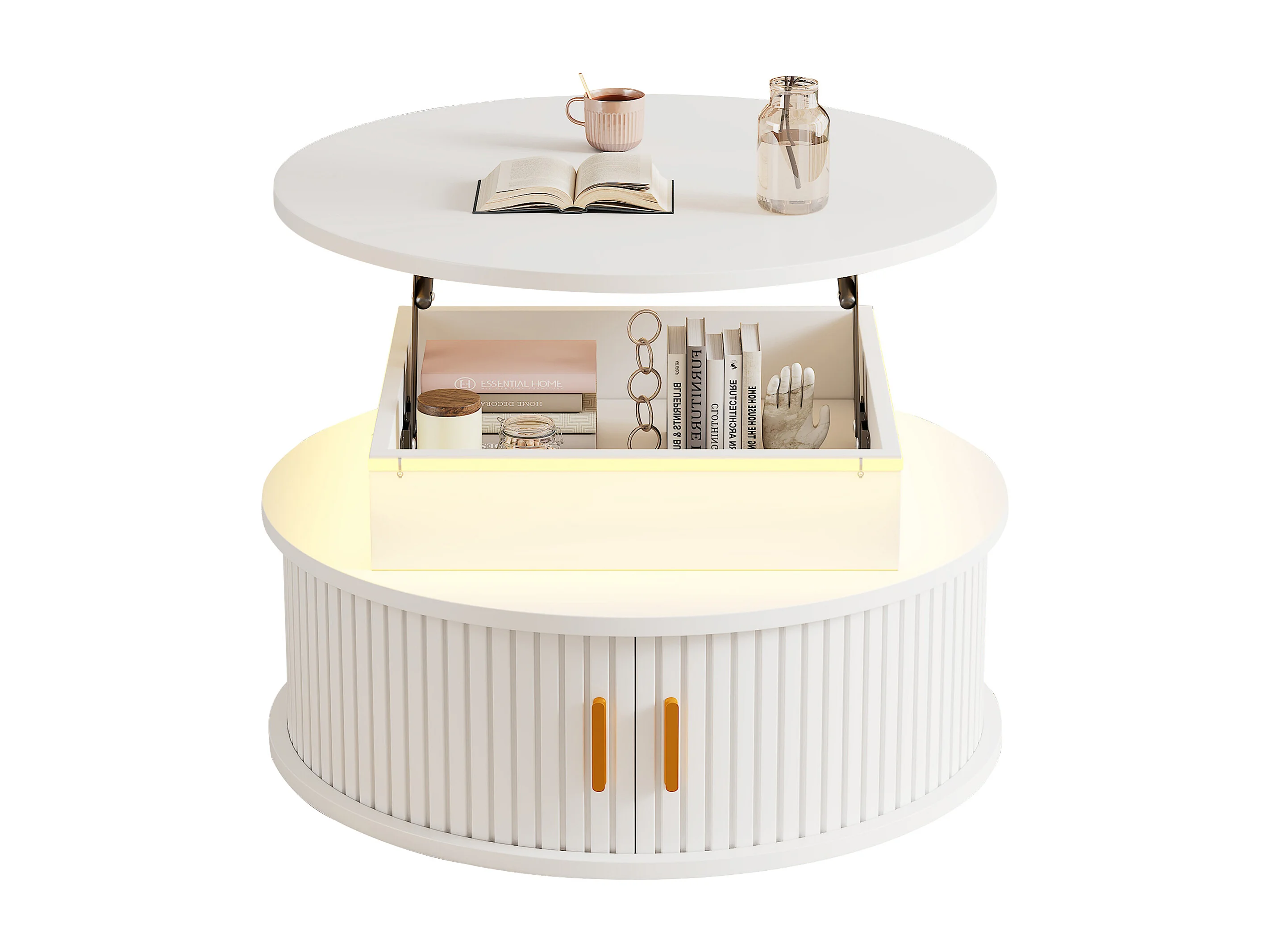 Okrągły podnoszony stolik kawowy 75x75x52 cm - z oświetleniem LED - 2 drzwi - przegródki do przechowywania - biały