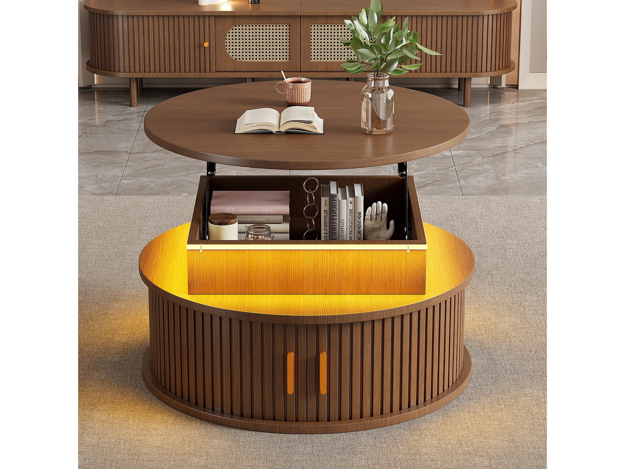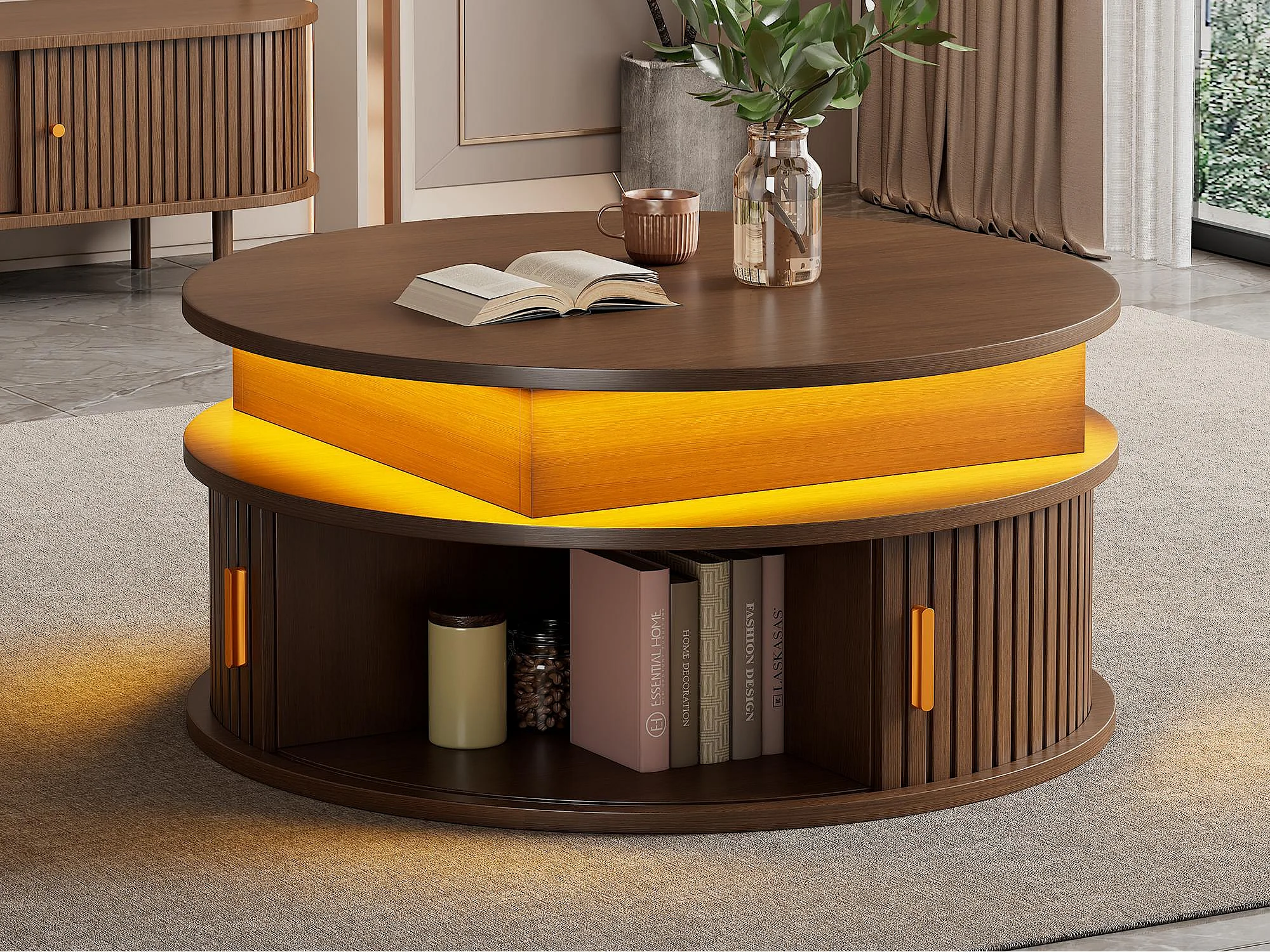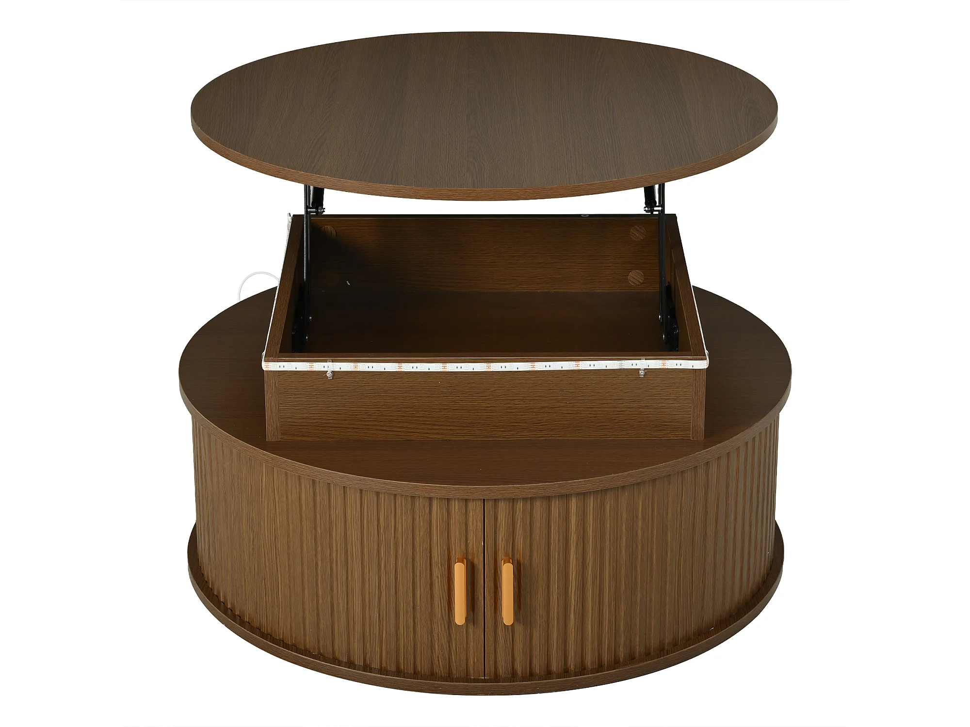 Okrągły podnoszony stolik kawowy 75x75x52 cm - z oświetleniem LED - 2 drzwi - przegródki do przechowywania - kolor orzechowy