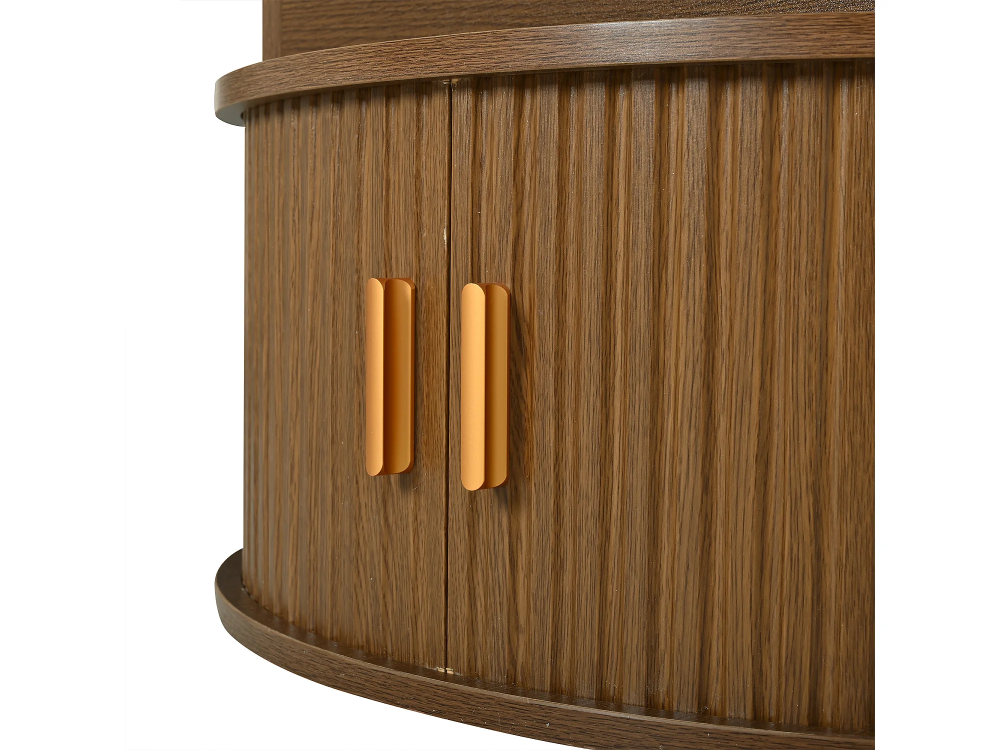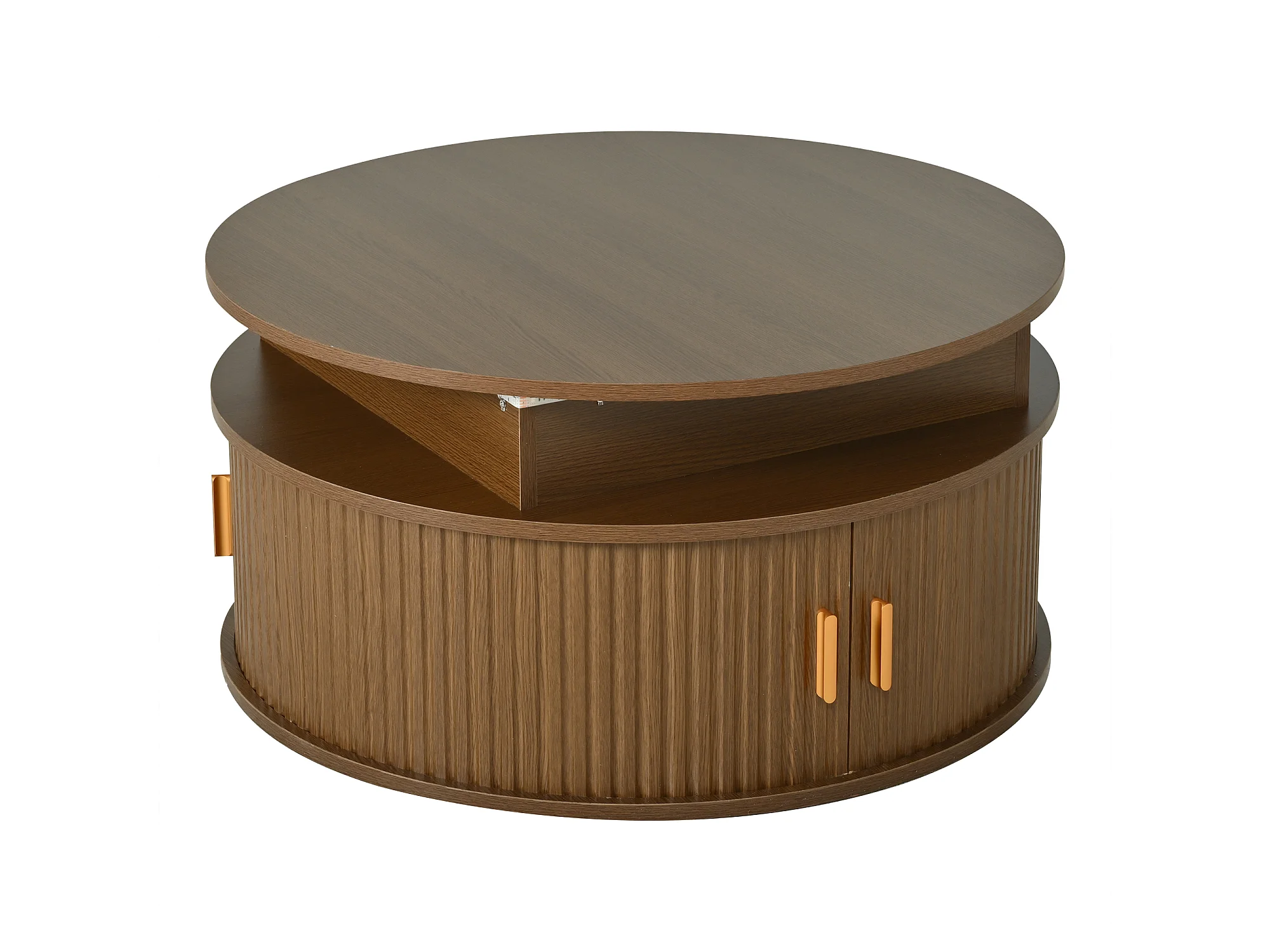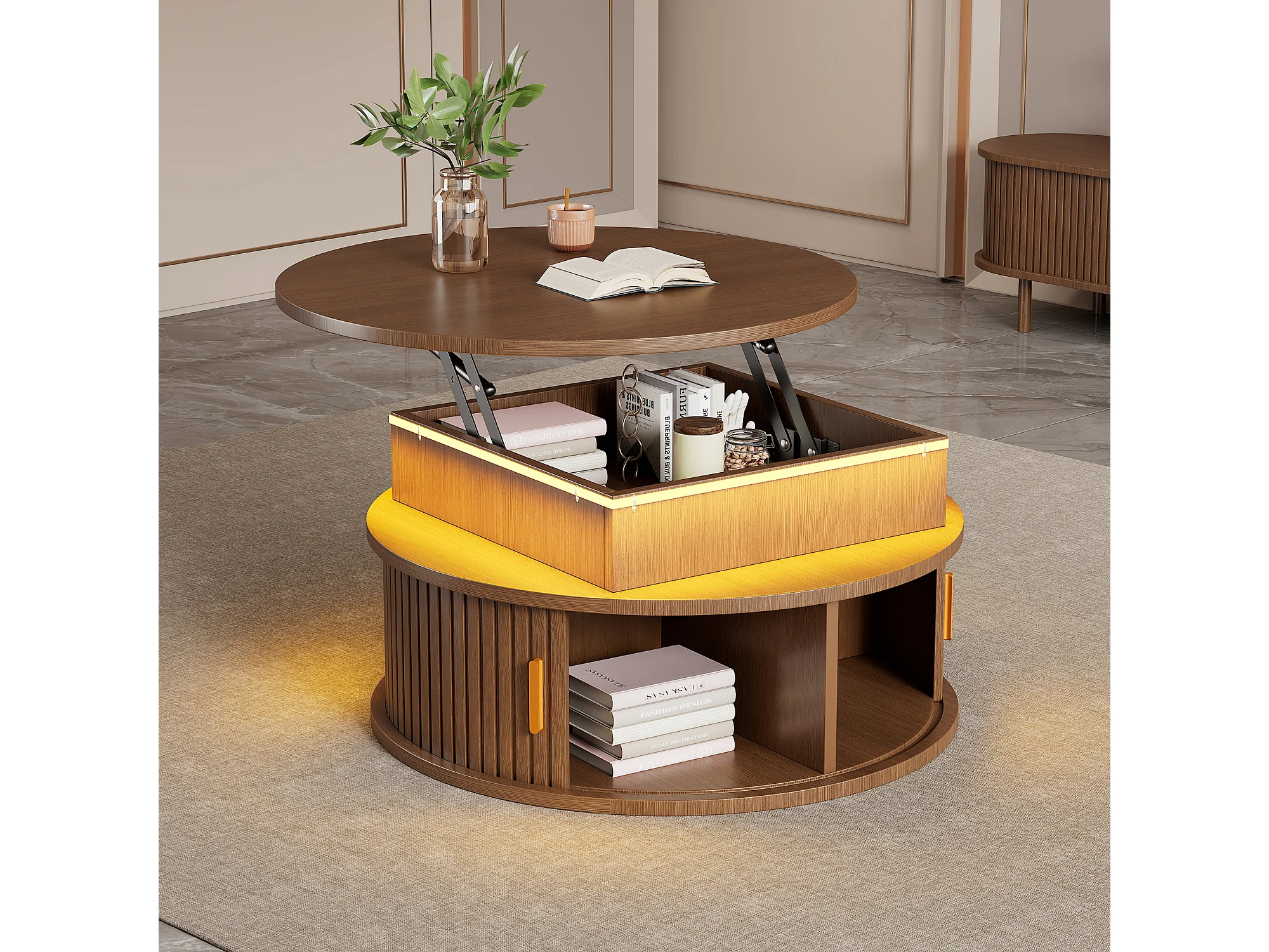 Okrągły podnoszony stolik kawowy 75x75x52 cm - z oświetleniem LED - 2 drzwi - przegródki do przechowywania - kolor orzechowy