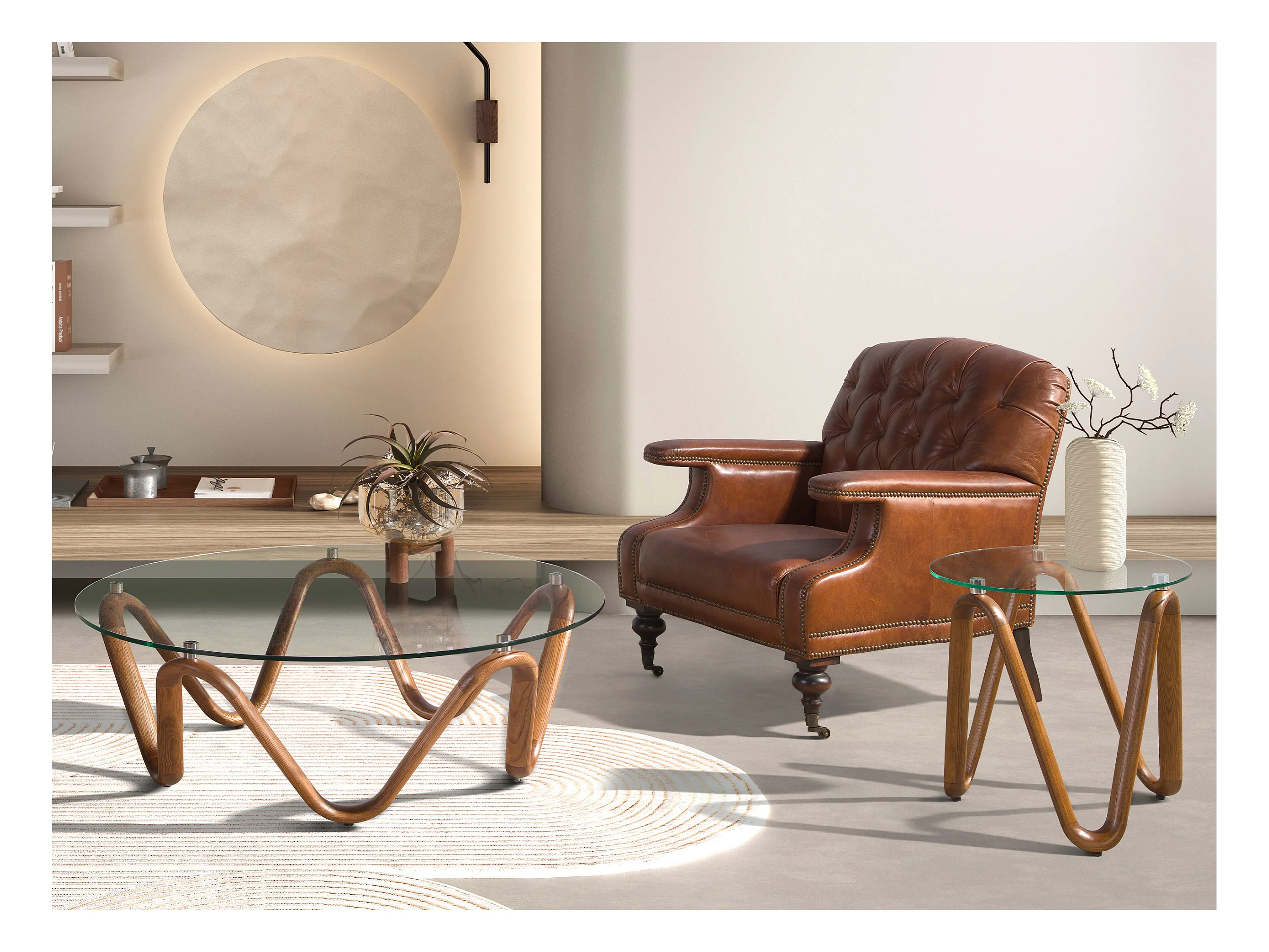 Okrągły stolik narożny ze szkła hartowanego i orzecha włoskiego