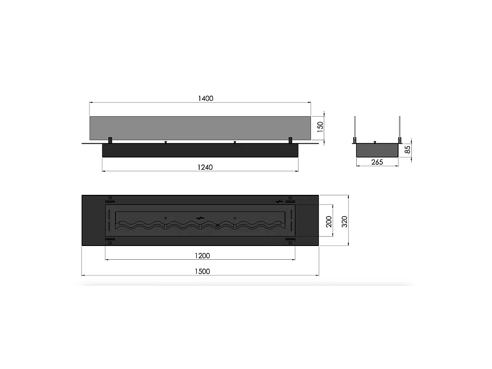 150 cm czarny, stalowy, wbudowany lub wolnostojący, 5-litrowy palnik na bioetanol z dołączonym szkłem