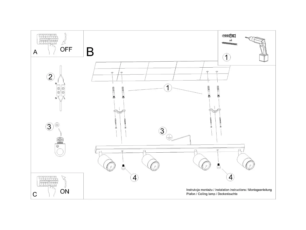 Plafony nowoczesny Torim, stal - 4 źródło światła 3000K - L.100 x H.20 cm - czarny