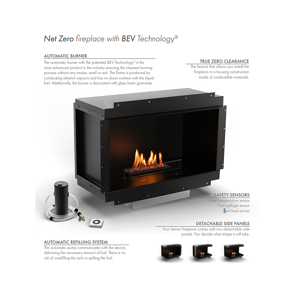 Planika - Kominek bioetanolowy Senso Fireplace BEV bez odpowietrznika, pilot zdalnego sterowania, stal, zdejmowane panele boczne