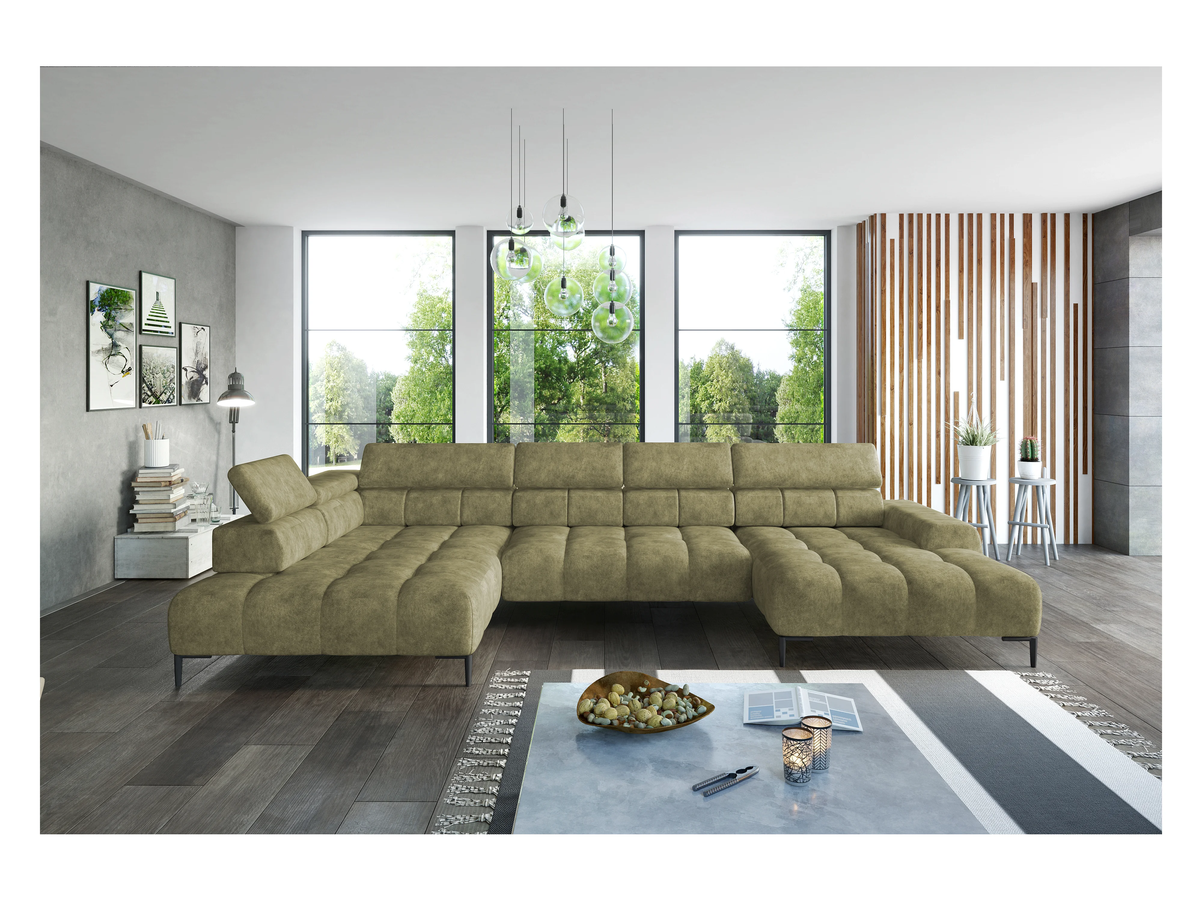 Plaza Sofa Narożna w układzie "U" - Lewa, Funkcja spania, Regulowane zagłówki i siedzisko, 385x216 cm, Jesionowa