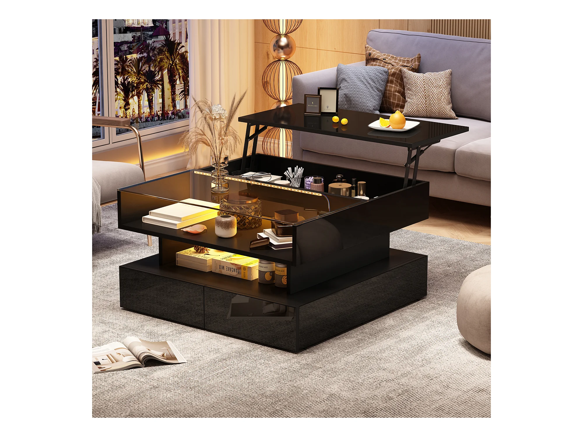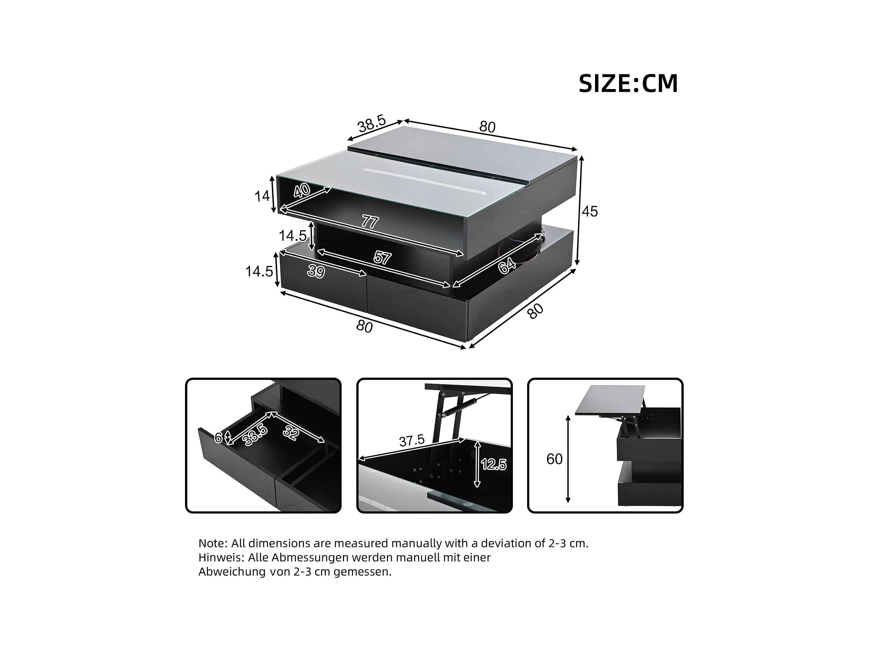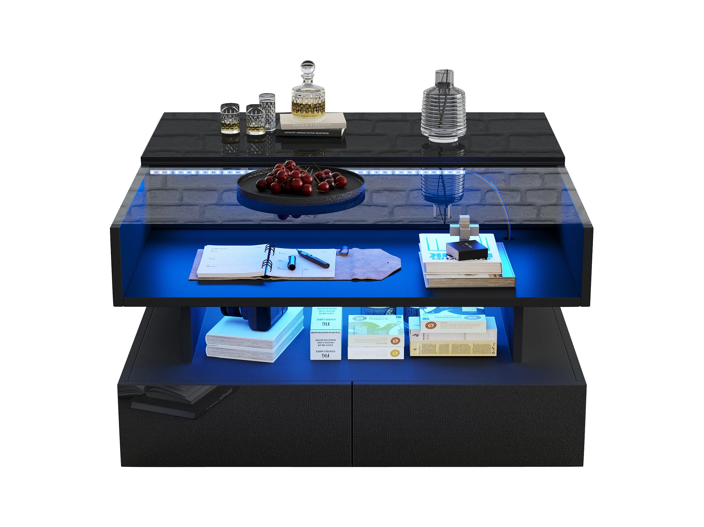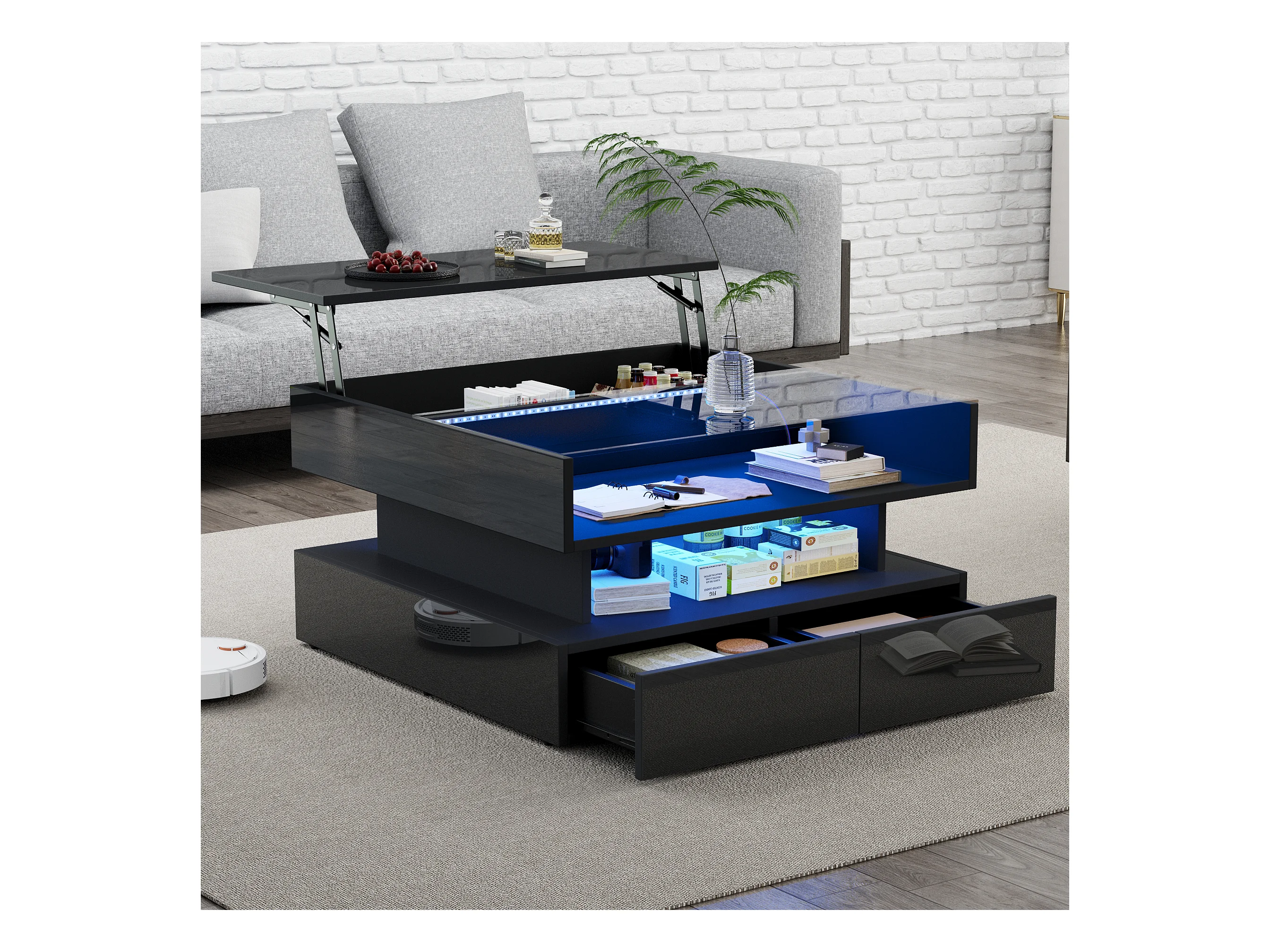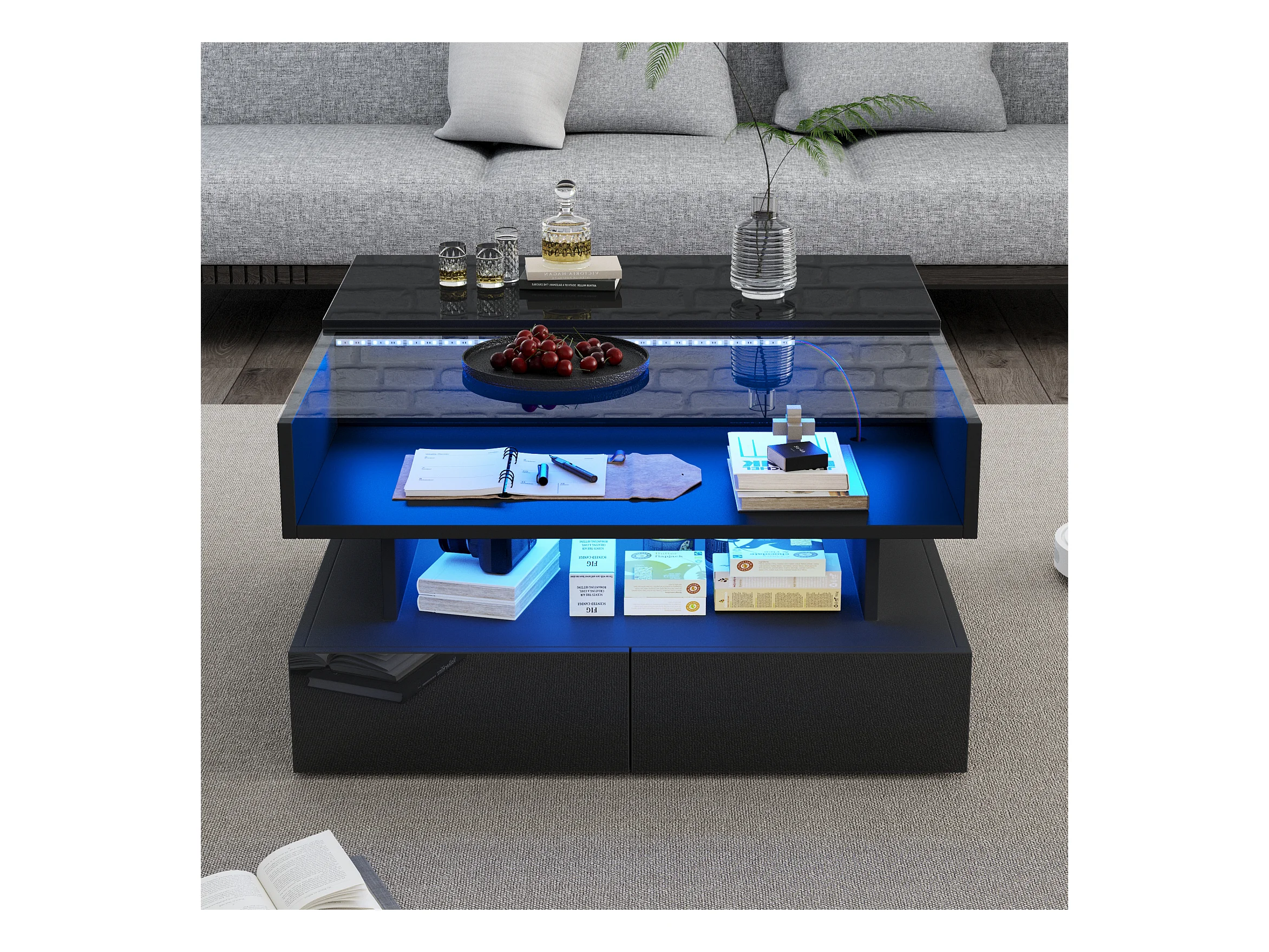 Podnoszony stolik kawowy - 80 x 80 x 45 cm - z ukrytym schowkiem + 2 szuflady + diody LED - płyta wiórowa + szkło hartowane - czarny