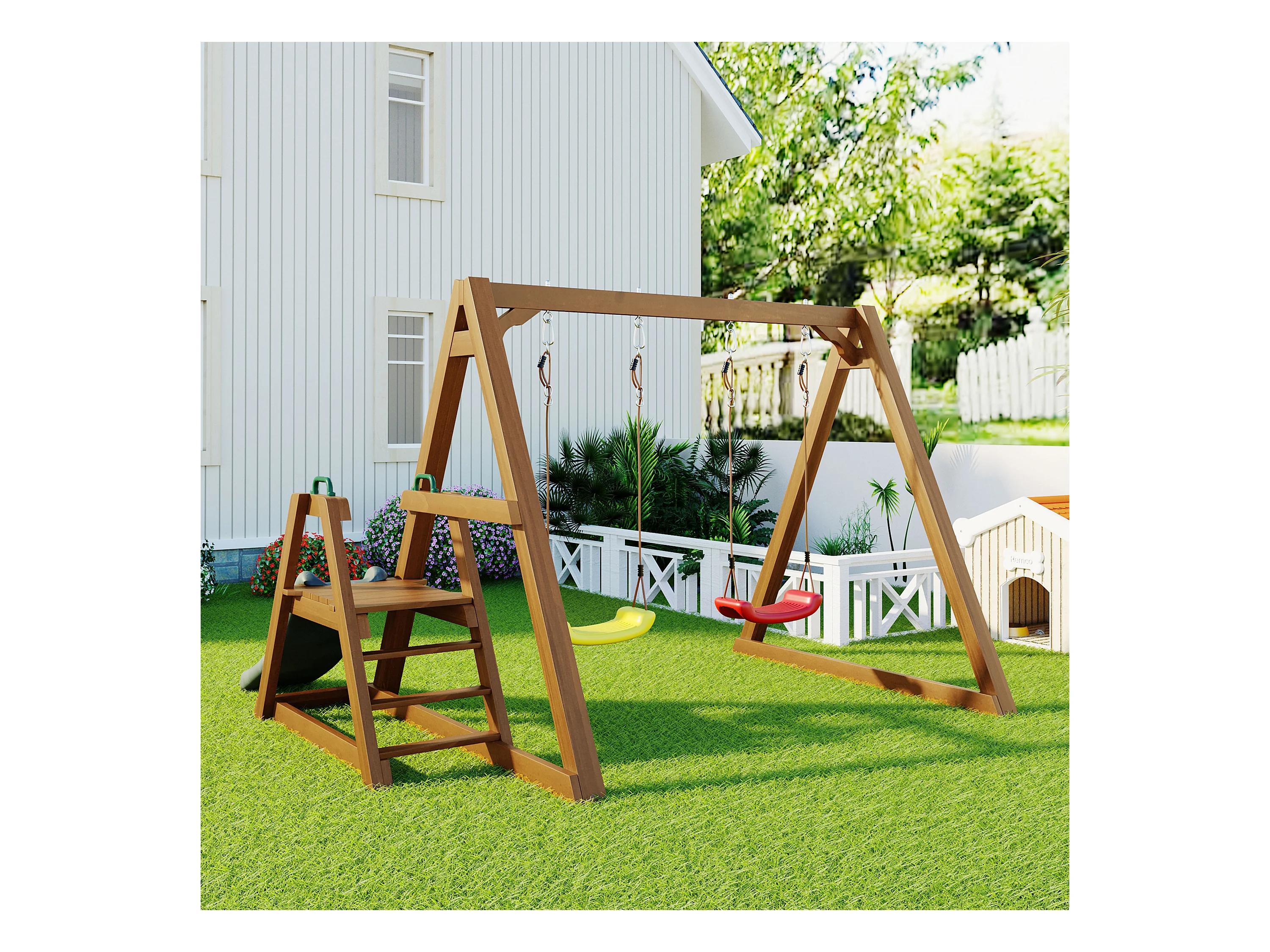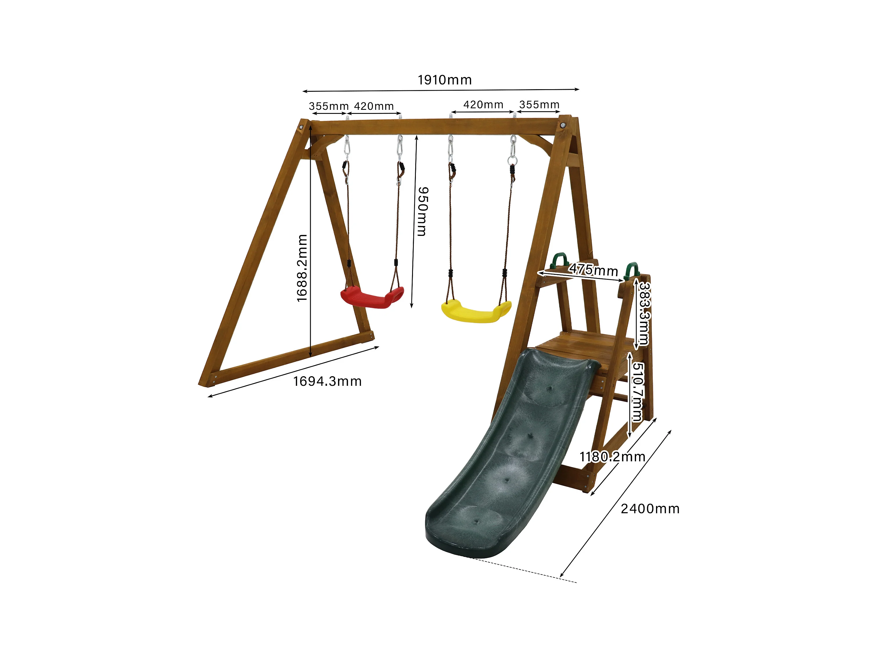 Podwójna huśtawka dla dzieci - 239 x 240 x 169cm - wykonana z drewna - ze zjeżdżalnią i drabinką - Naturalna
