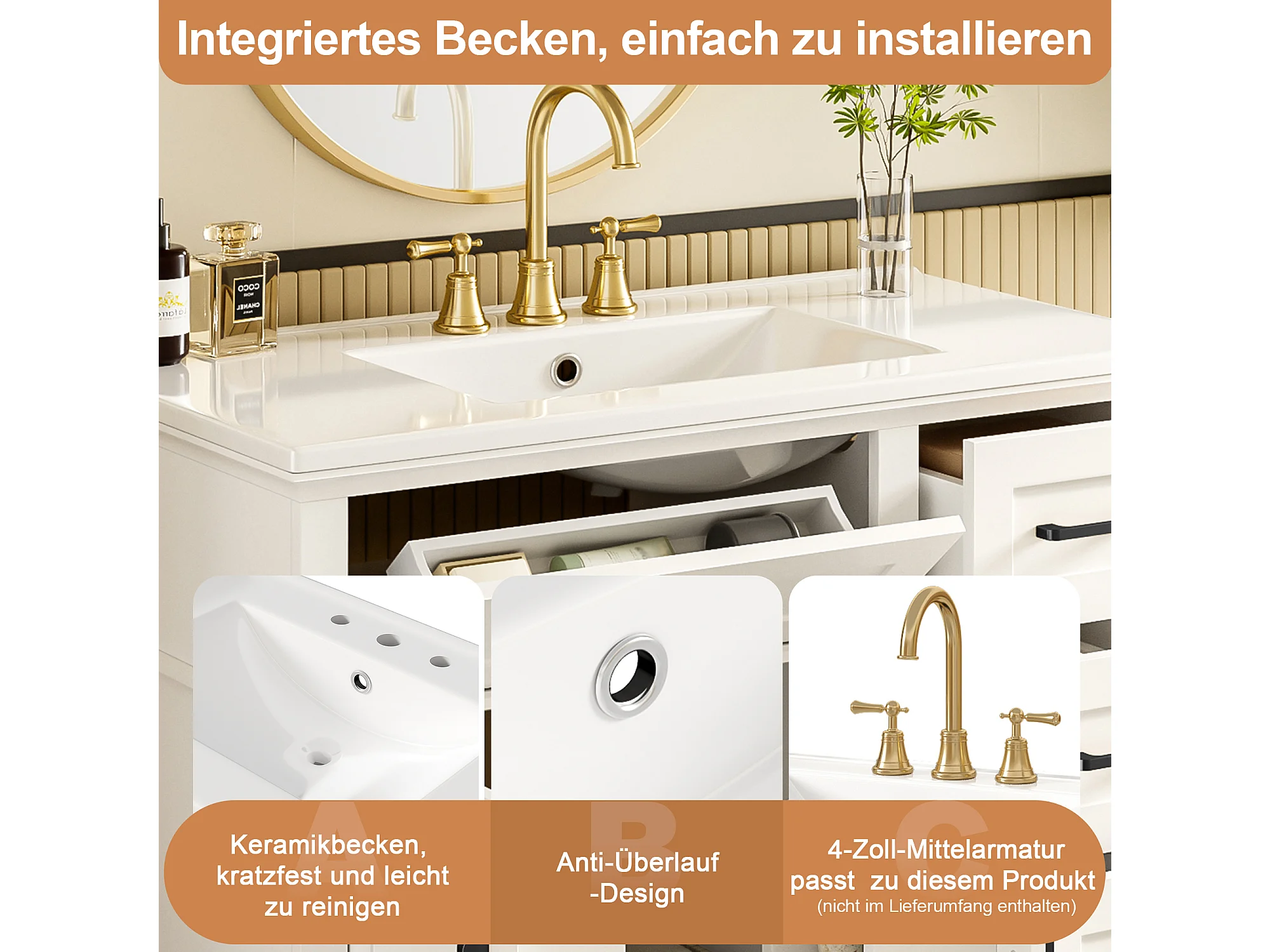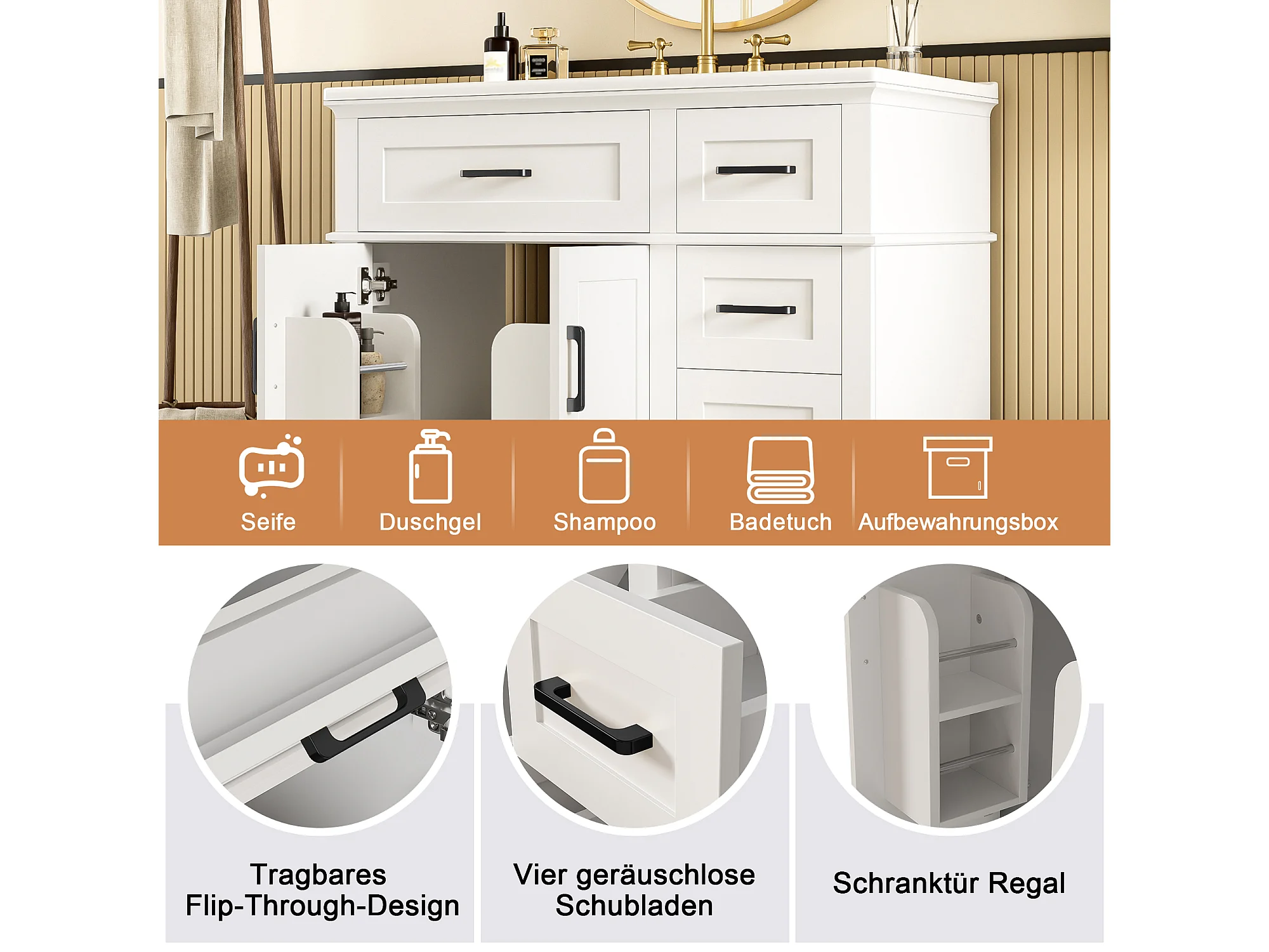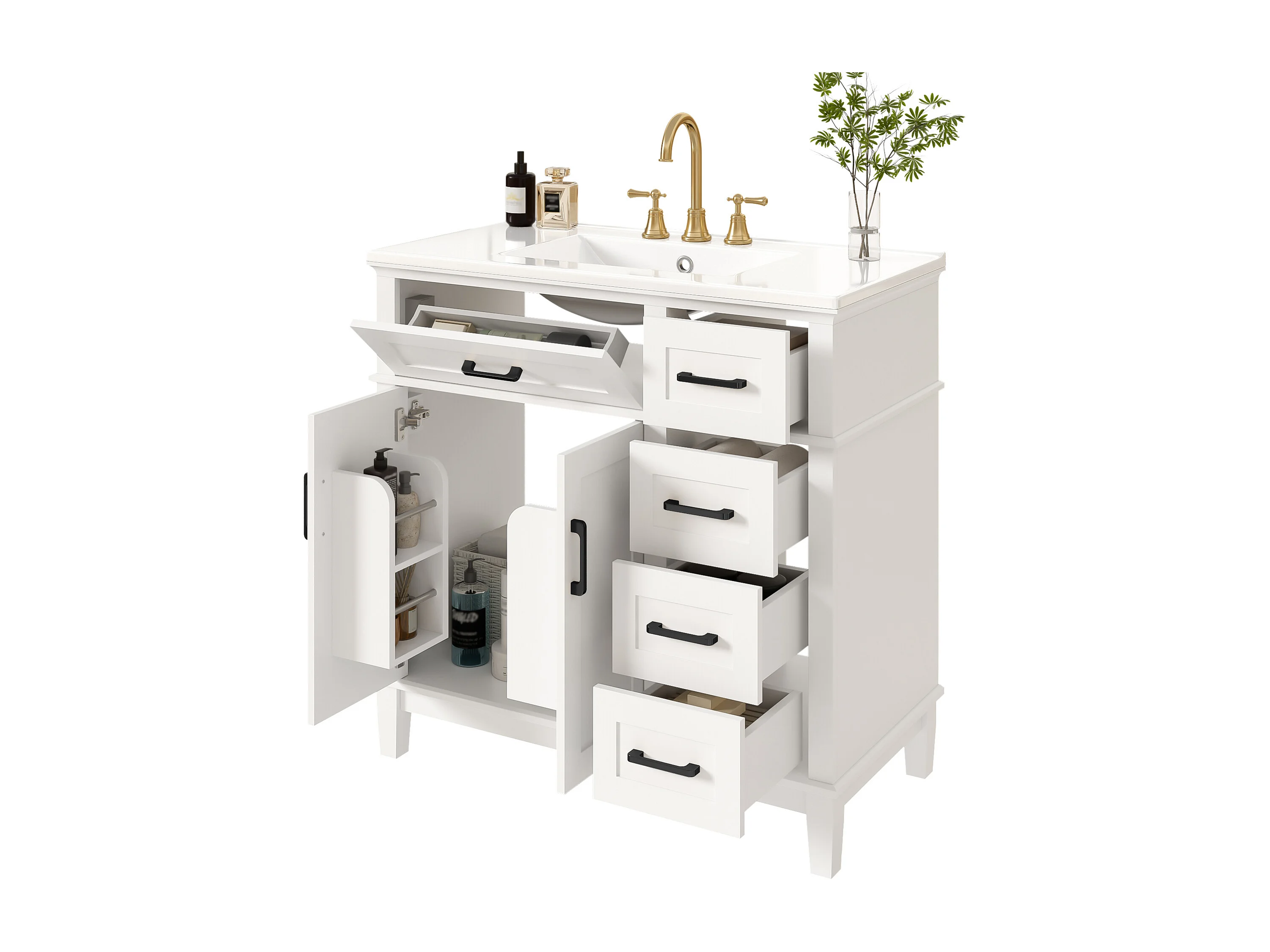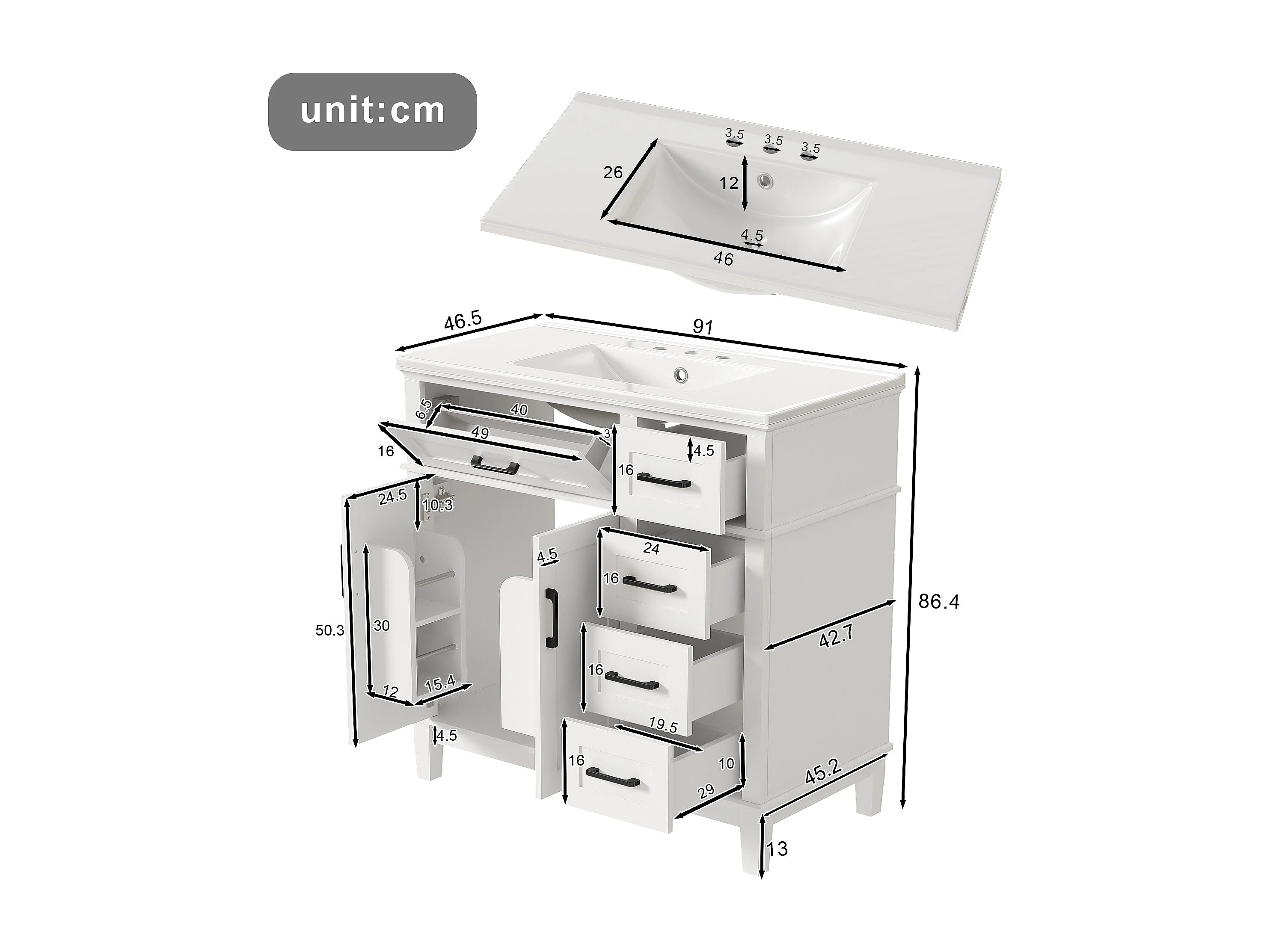 Pojedyncza ceramiczna szafka pod umywalkę stojąca - 90 x 46 x 87 cm - z 4 szufladami + 2 drzwiami - Ceramika + MDF - biała