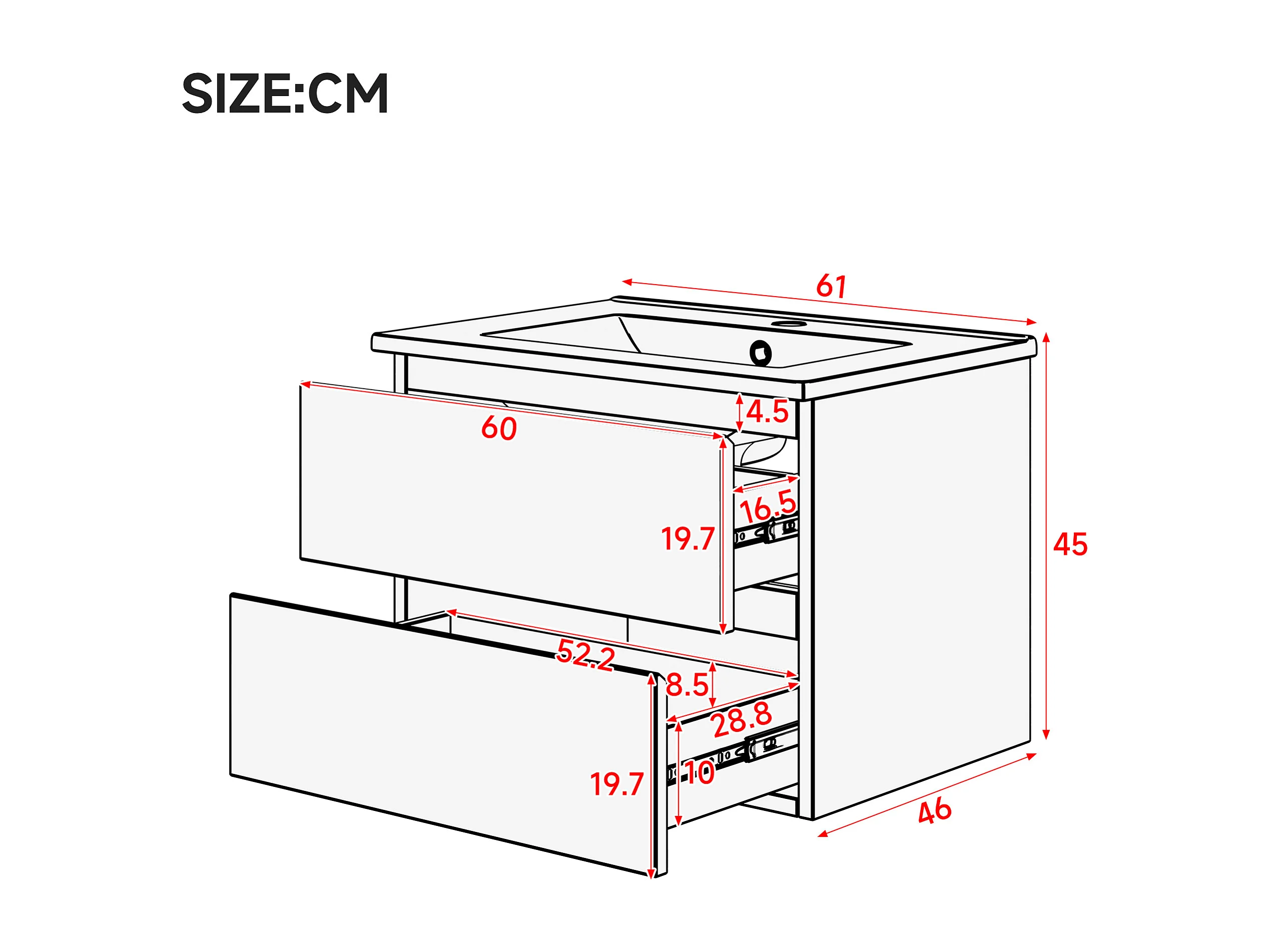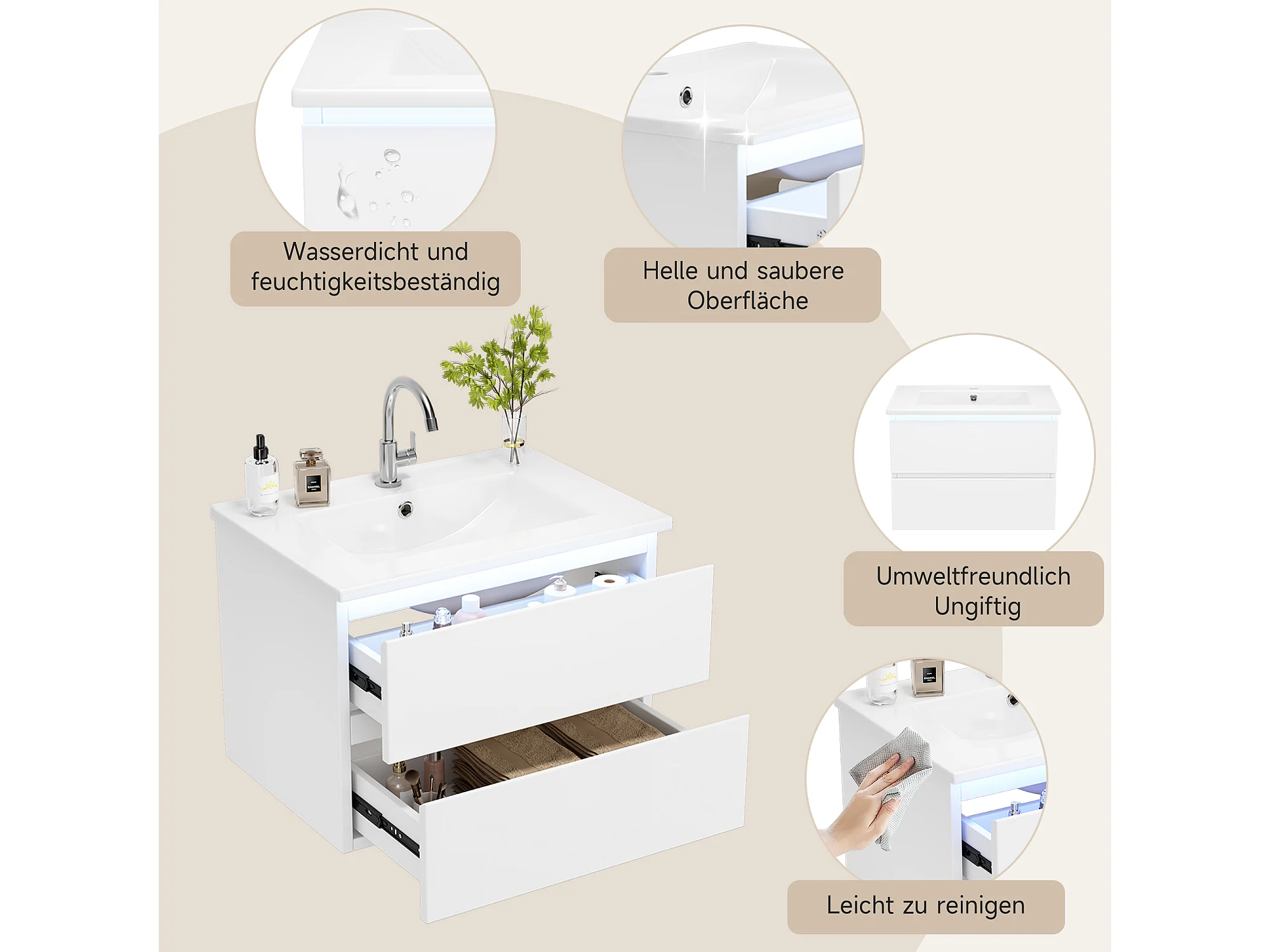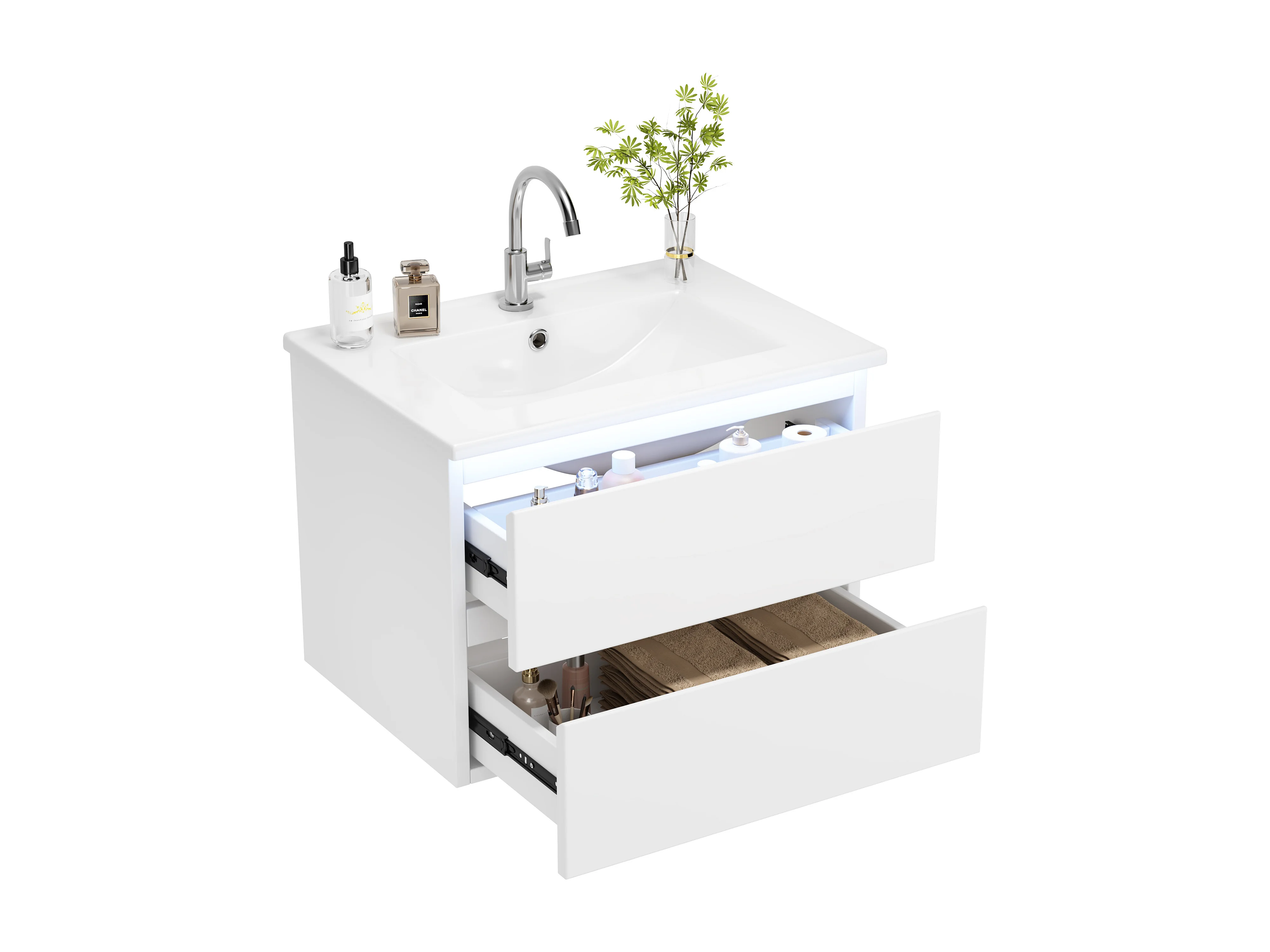 Pojedyncza umywalka ceramiczna pod umywalkę wiszącą - 61 x 46 x 45 cm - wykończenie lakierowane - z diodami LED + 2 szuflady - ceramika + MDF - biały