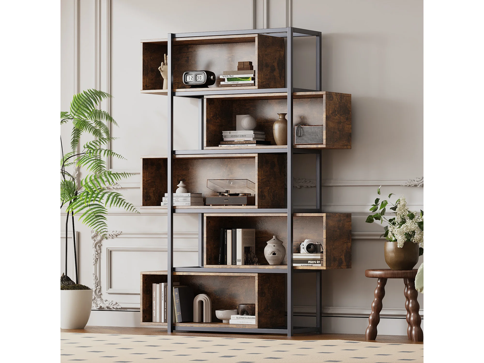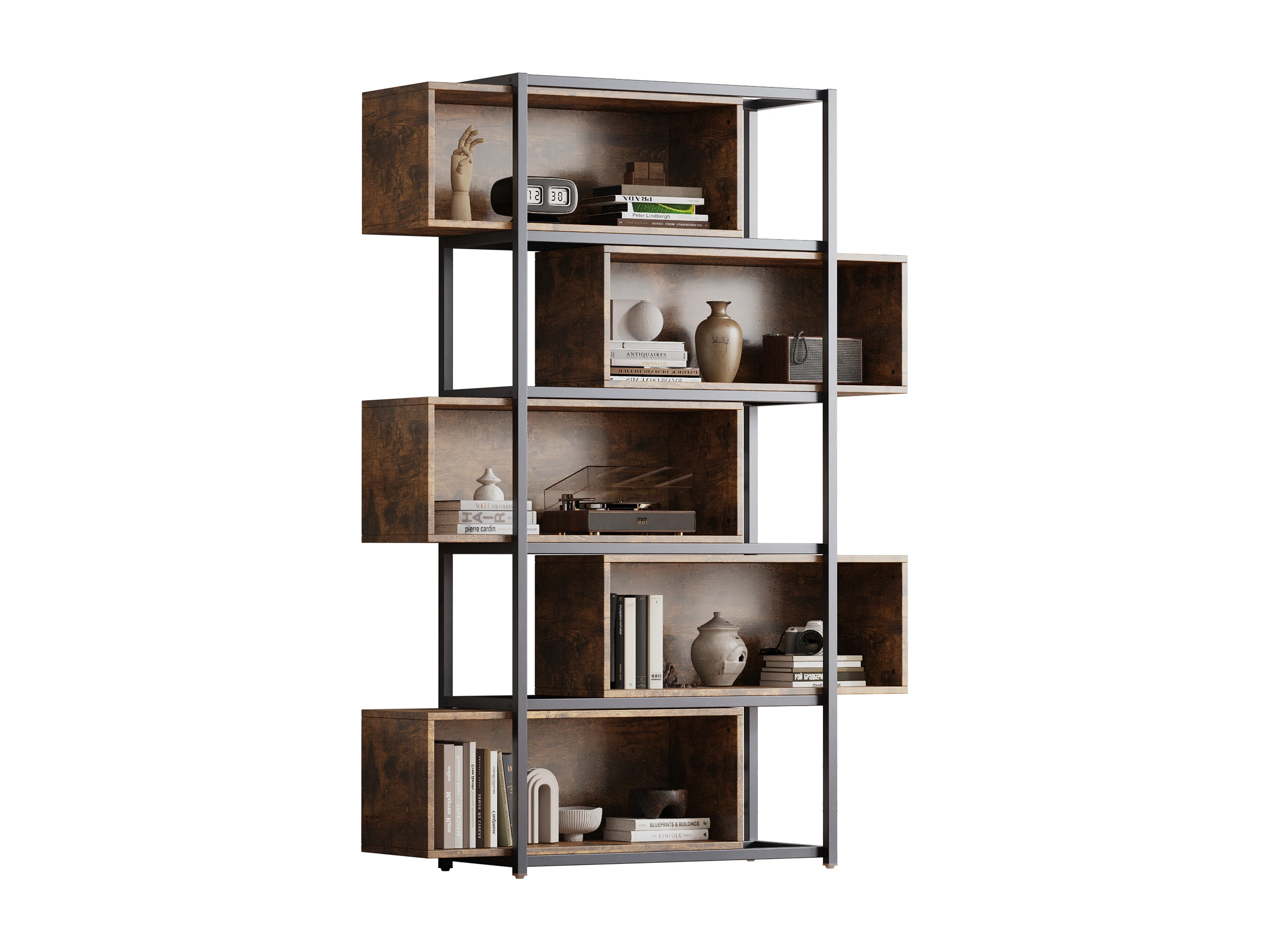 Regał biblioteczny 5-poziomowy z półkami - 121 x 35 x 176 cm - drewno MDF i rura stalowa - Brązowy