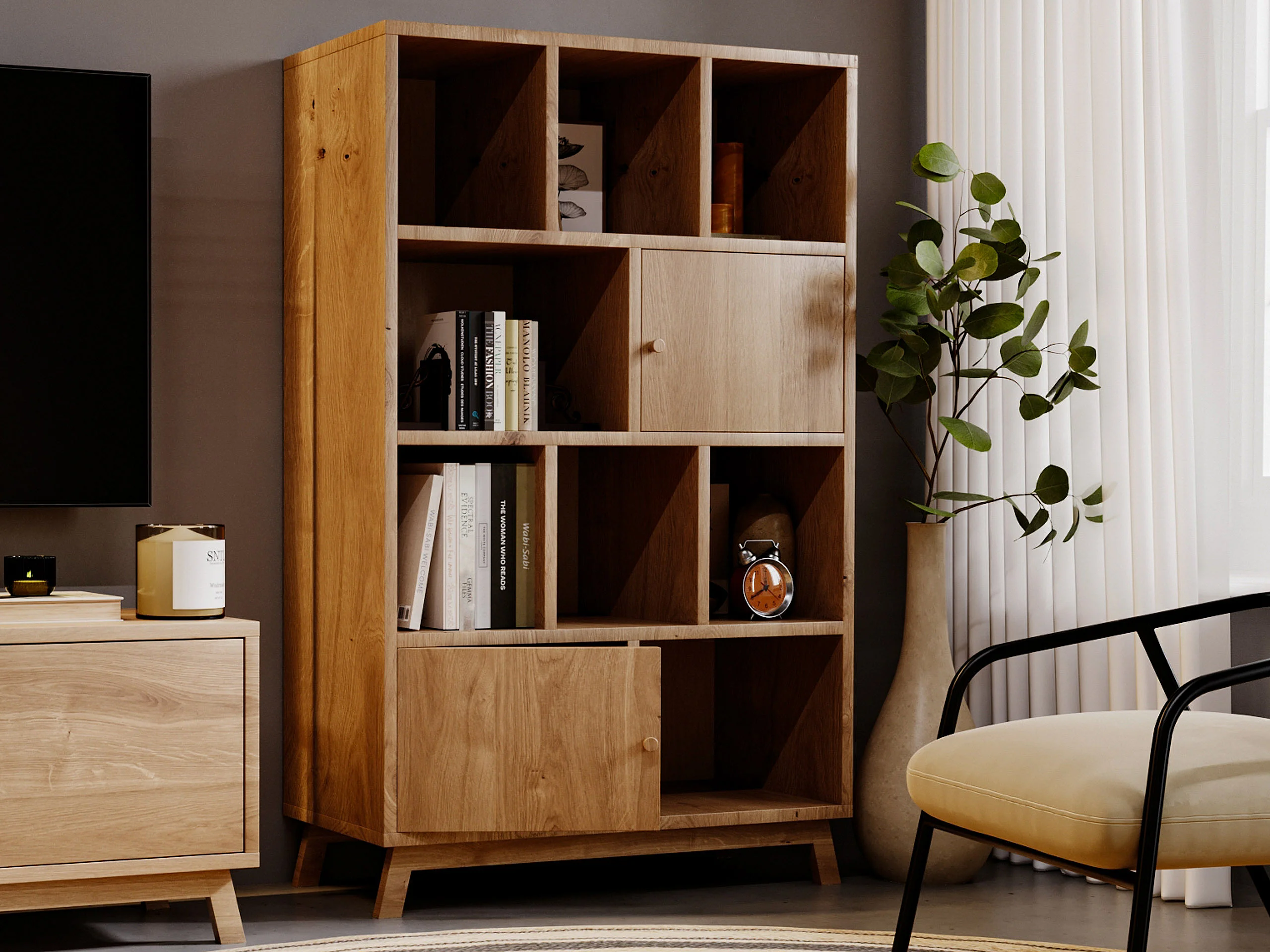 Regał drewniany z drzwiczkami i półkami Modern III, kolor kasztan