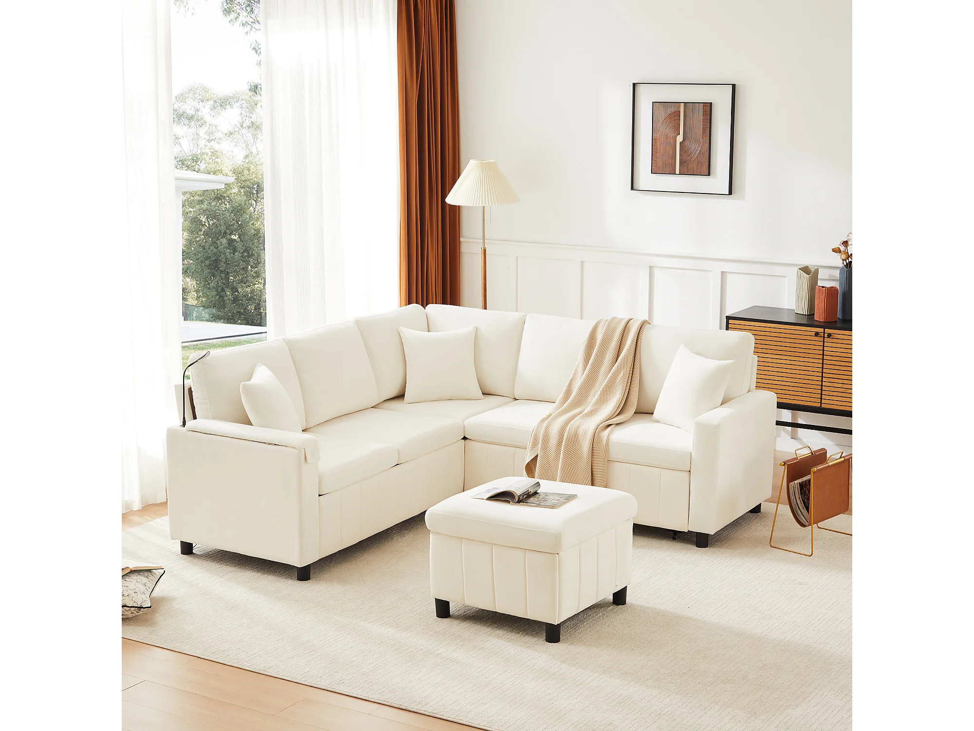 Rozkładana sofa rozkładana - 205 x 205 x 85 cm - z pufem ze schowkiem + lampką do czytania + portem USB-C + ukrytym stolikiem bocznym - nadruk szenilowy - beżowy