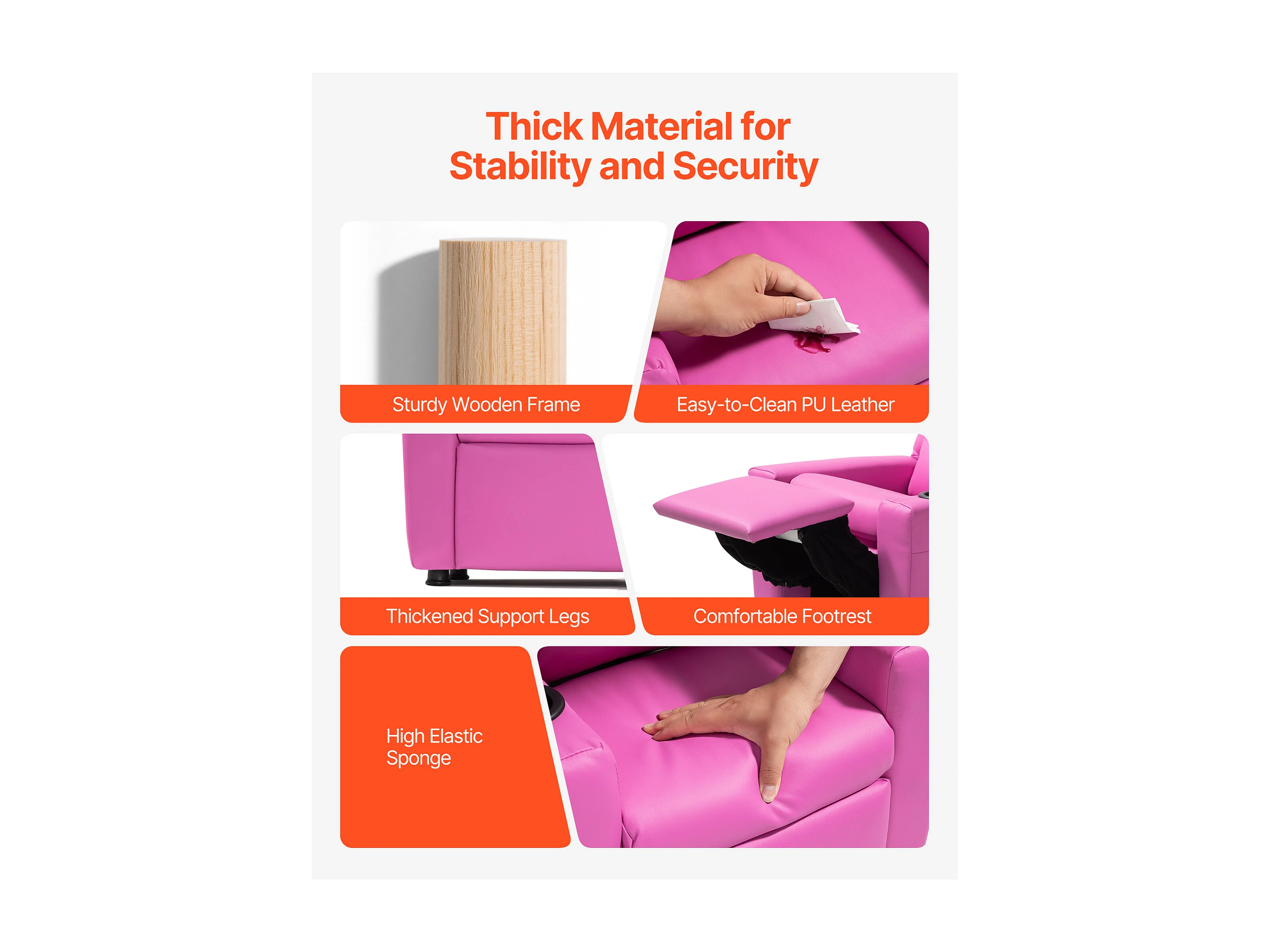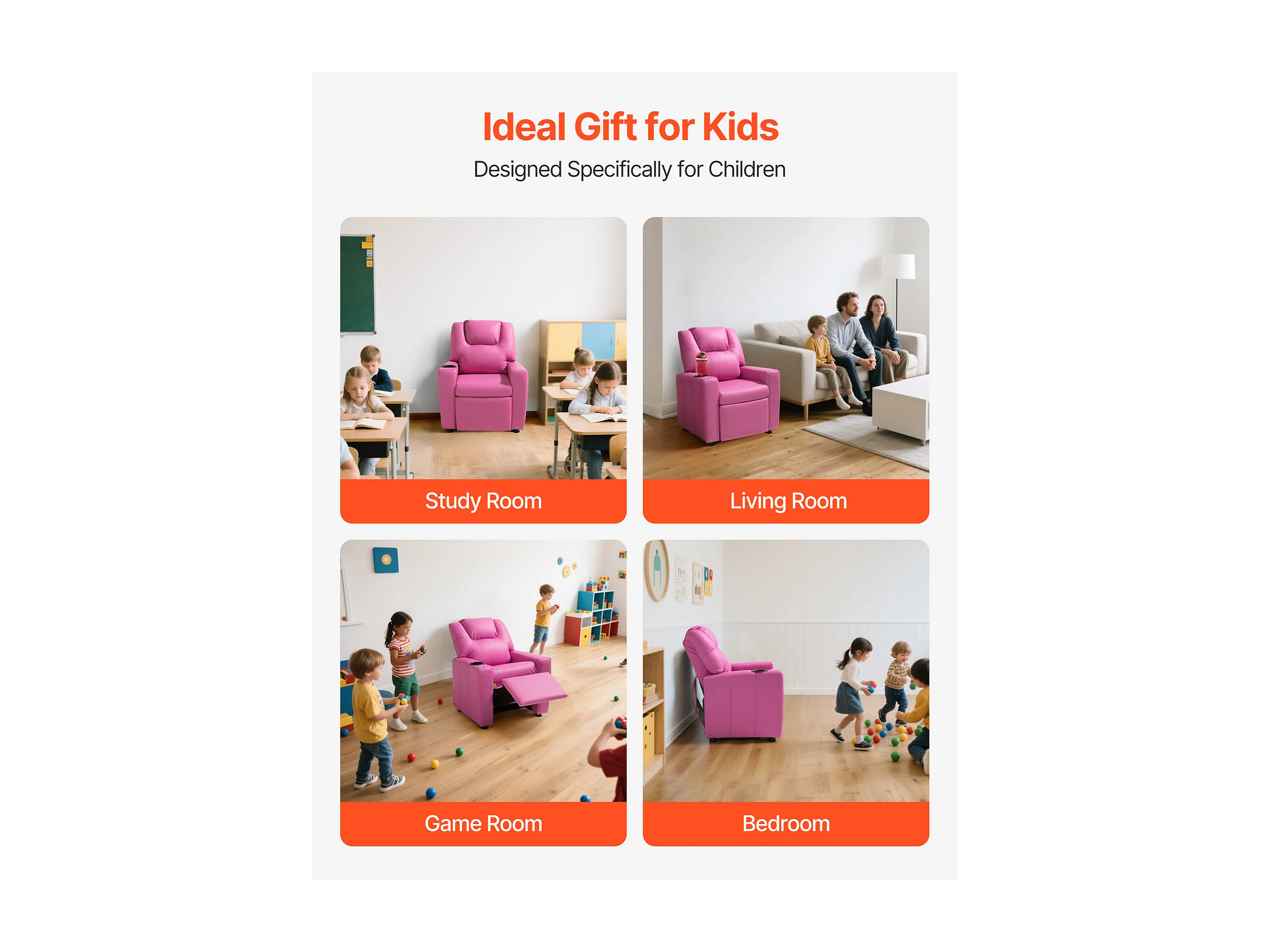 Rozkładany Fotel SucceBuy dla Dzieci, Ergonomiczne Krzesło Relaksacyjne, z Uchwytami na Kubki i Kieszeniami, Regulowane Oparcie w Zakresie 101° do 121°, Różowy