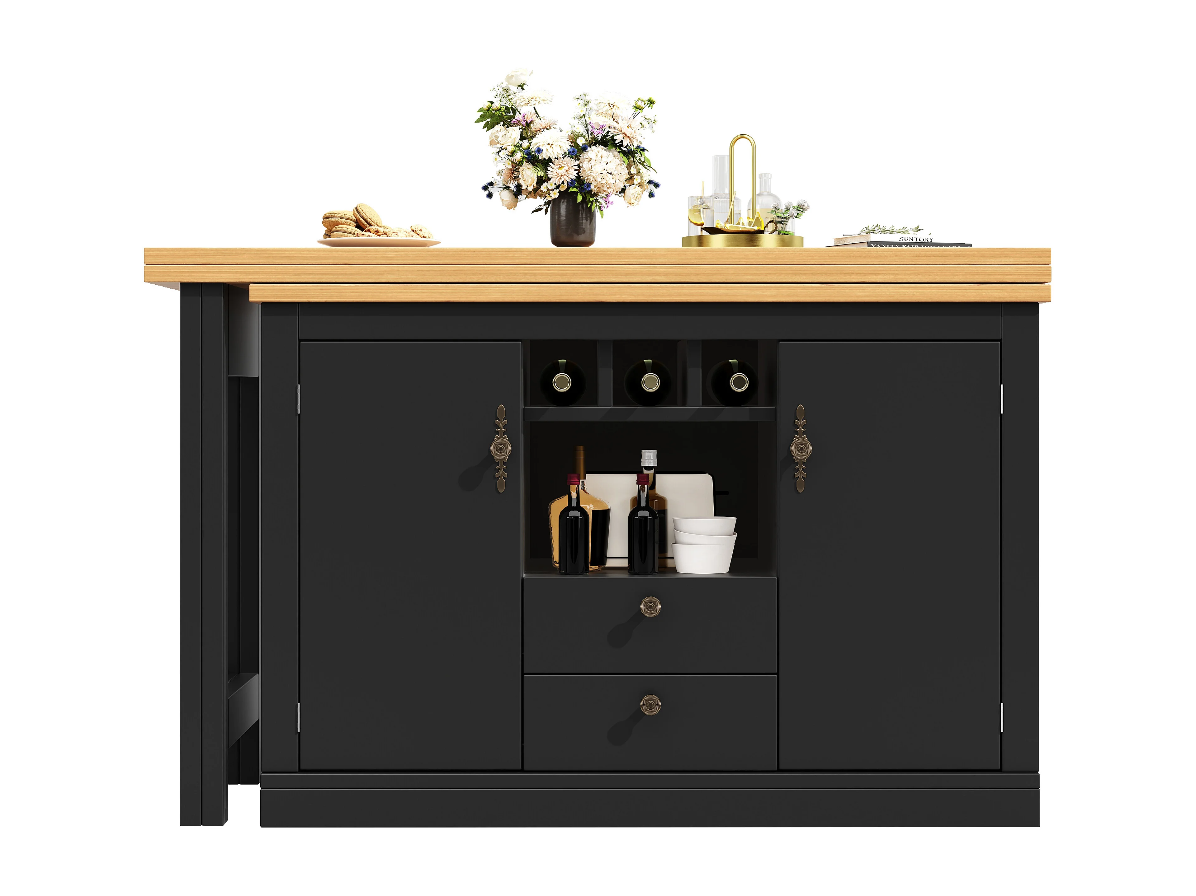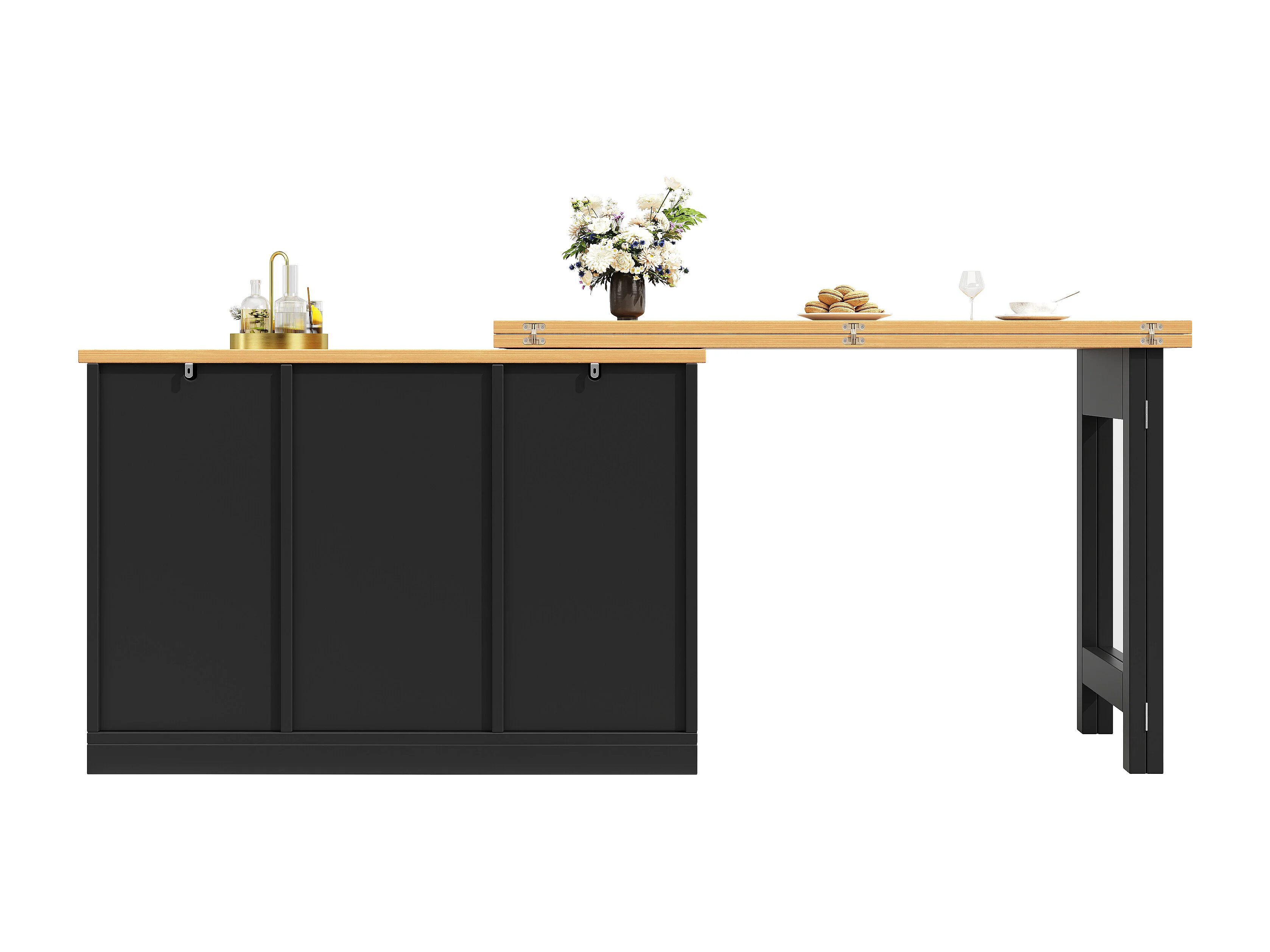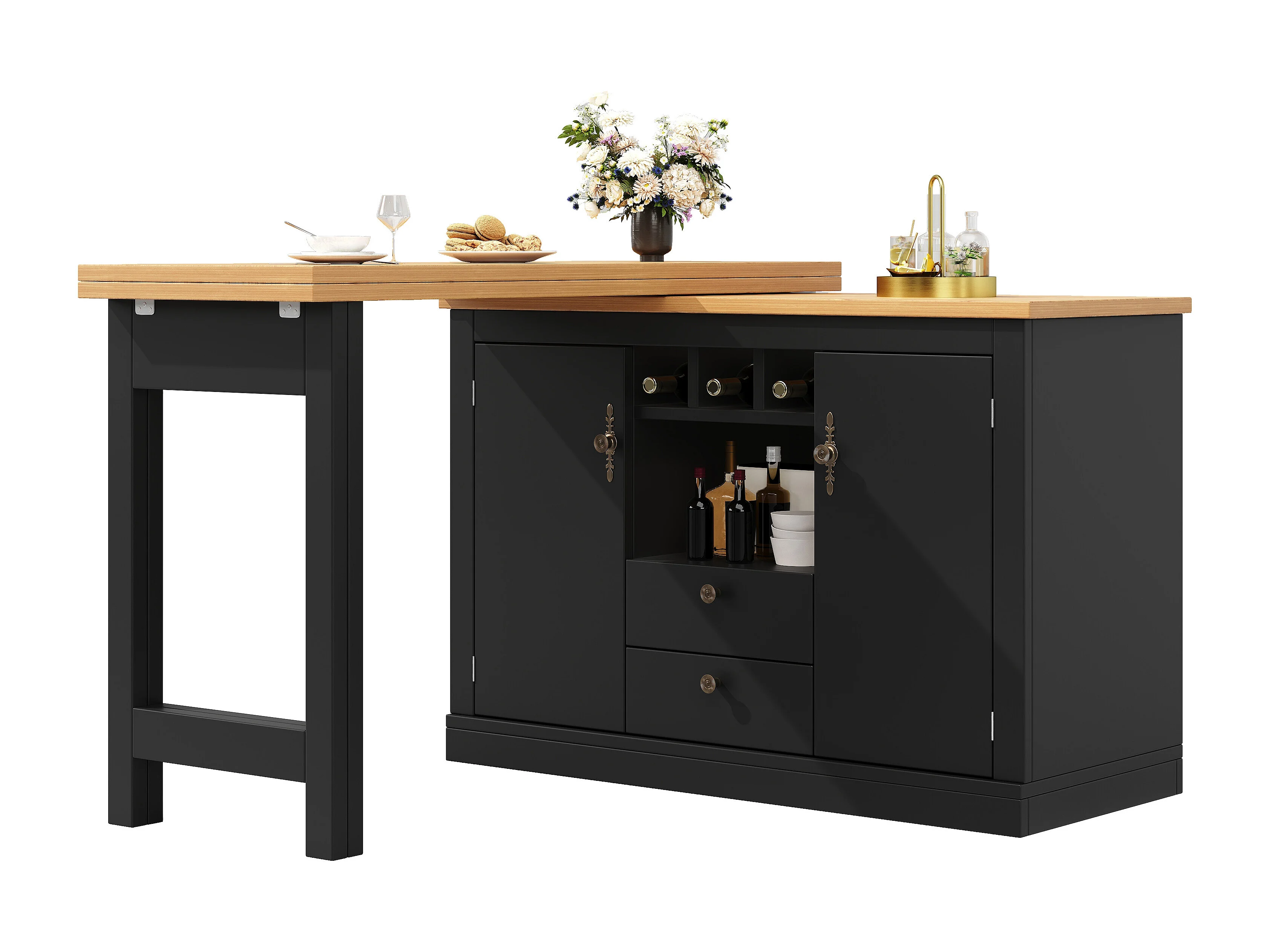 Rozkładany stół barowy - 120/180 x 76 cm - z diodami LED + 2 drzwi + 2 szuflady - obrotowy 360° - MDF - czarny