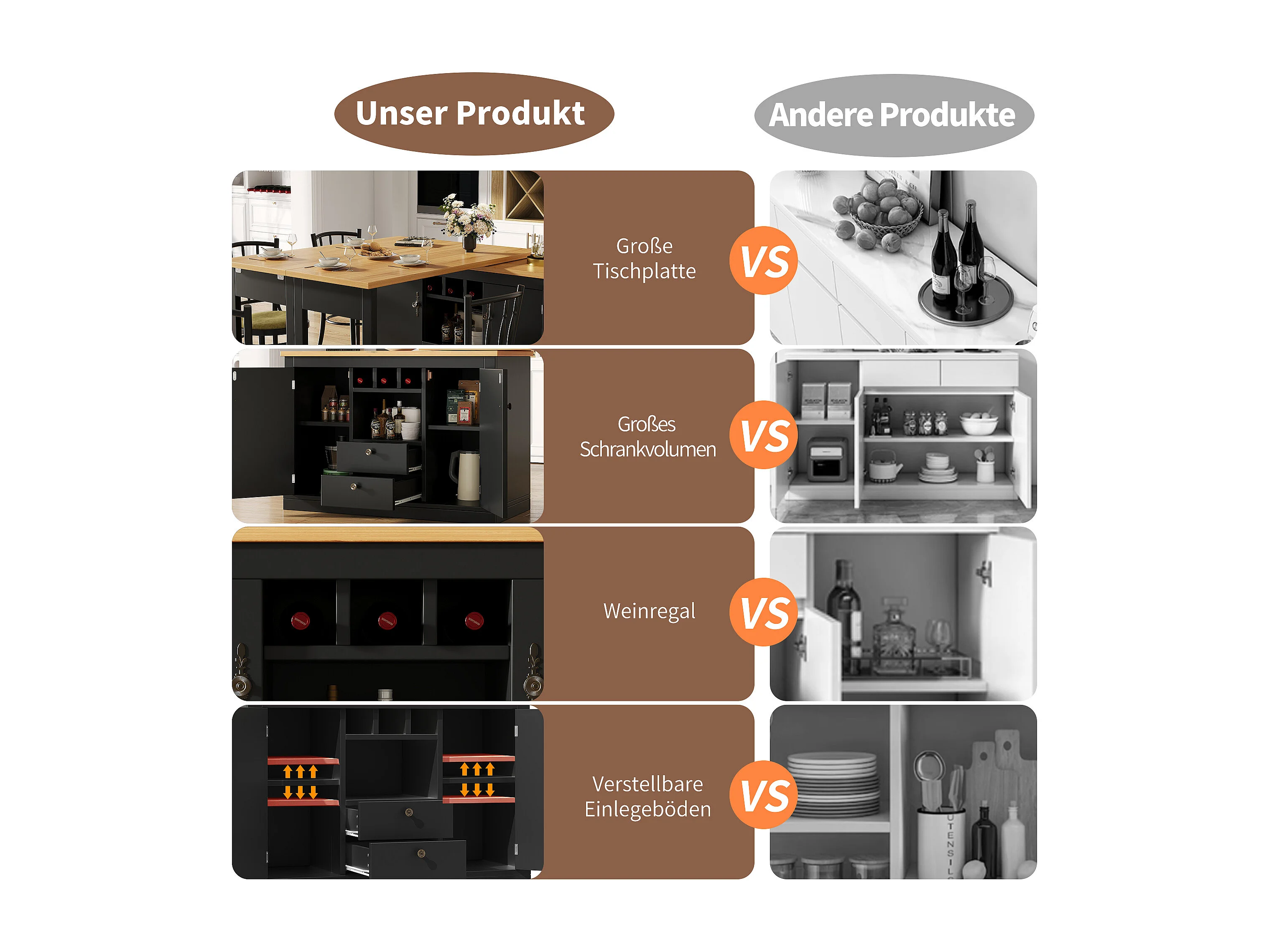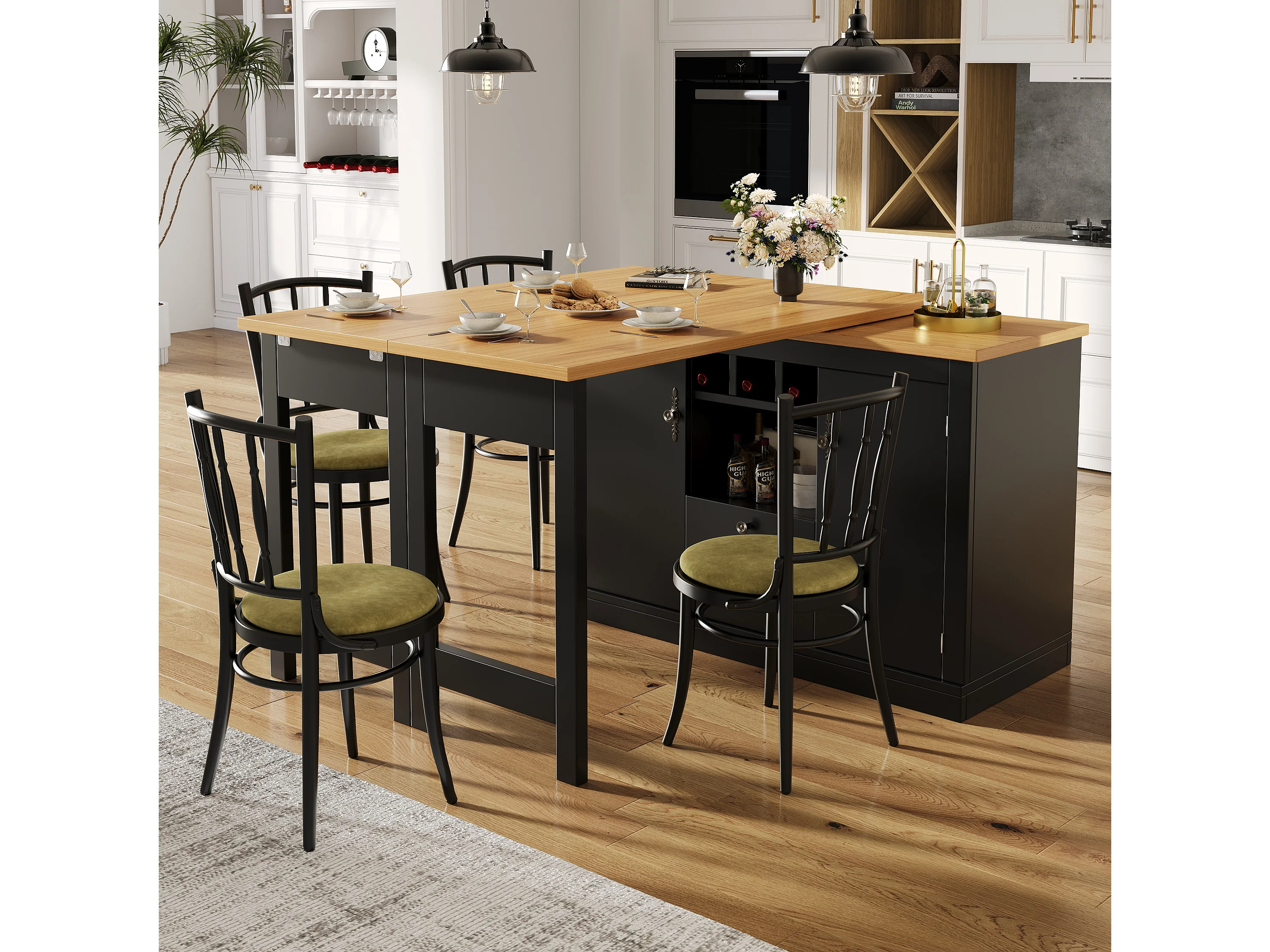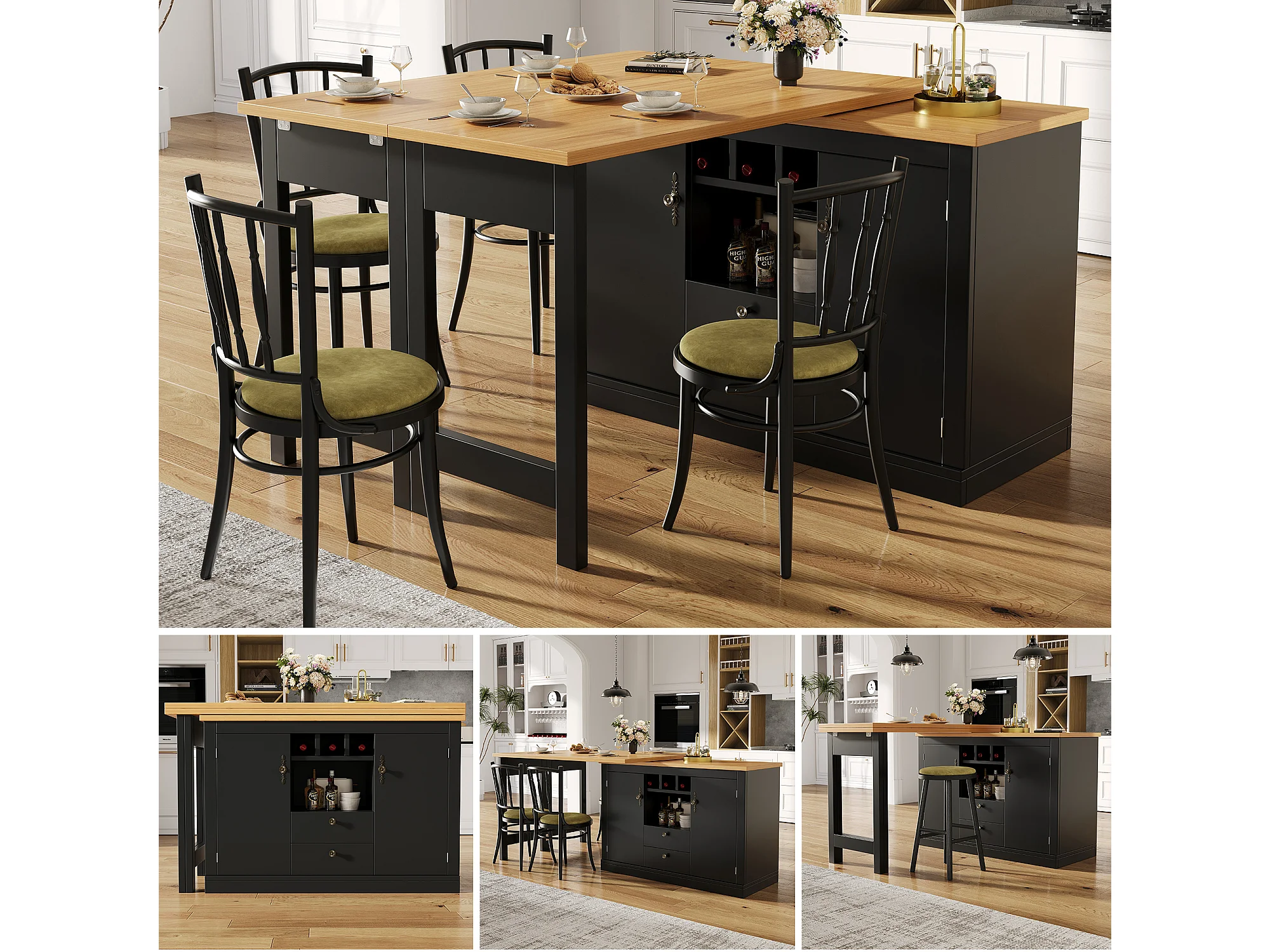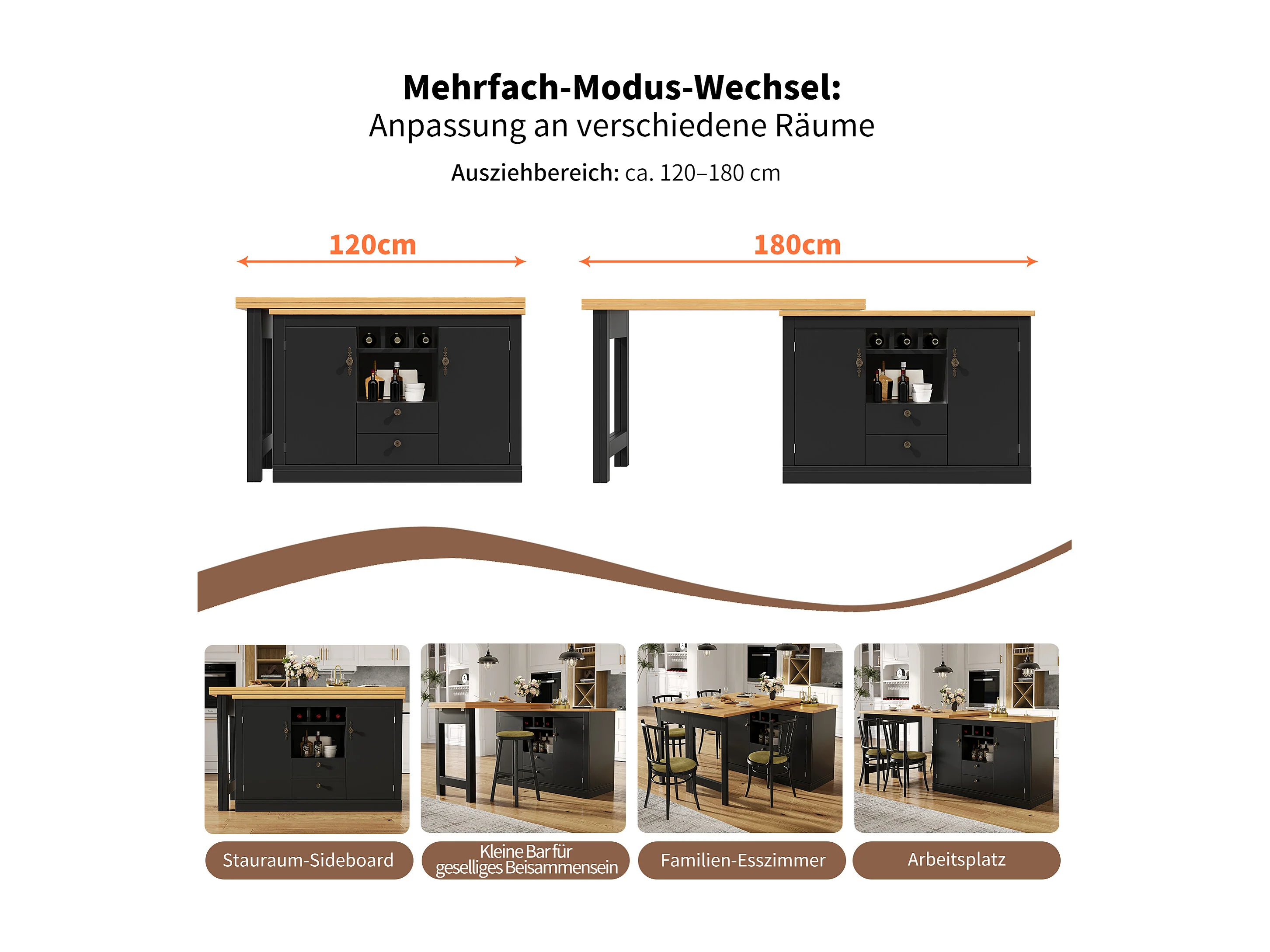 Rozkładany stół barowy - 120/180 x 76 cm - z diodami LED + 2 drzwi + 2 szuflady - obrotowy 360° - MDF - czarny