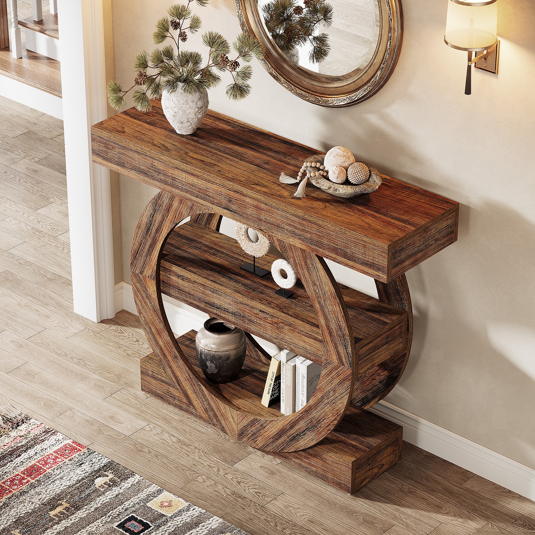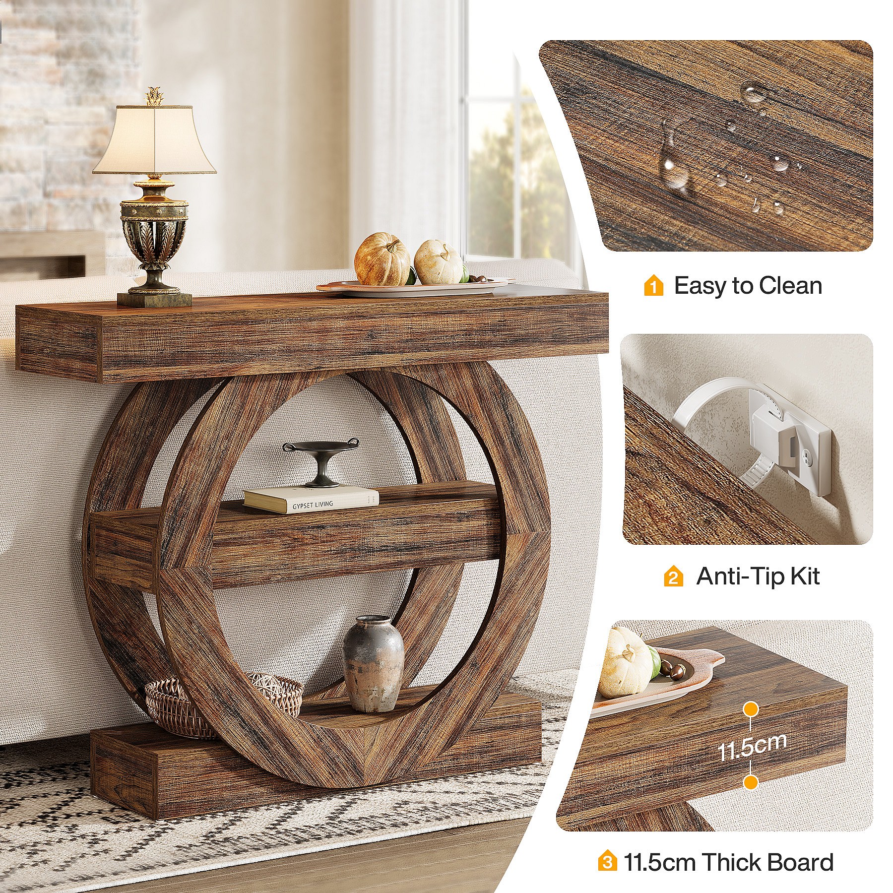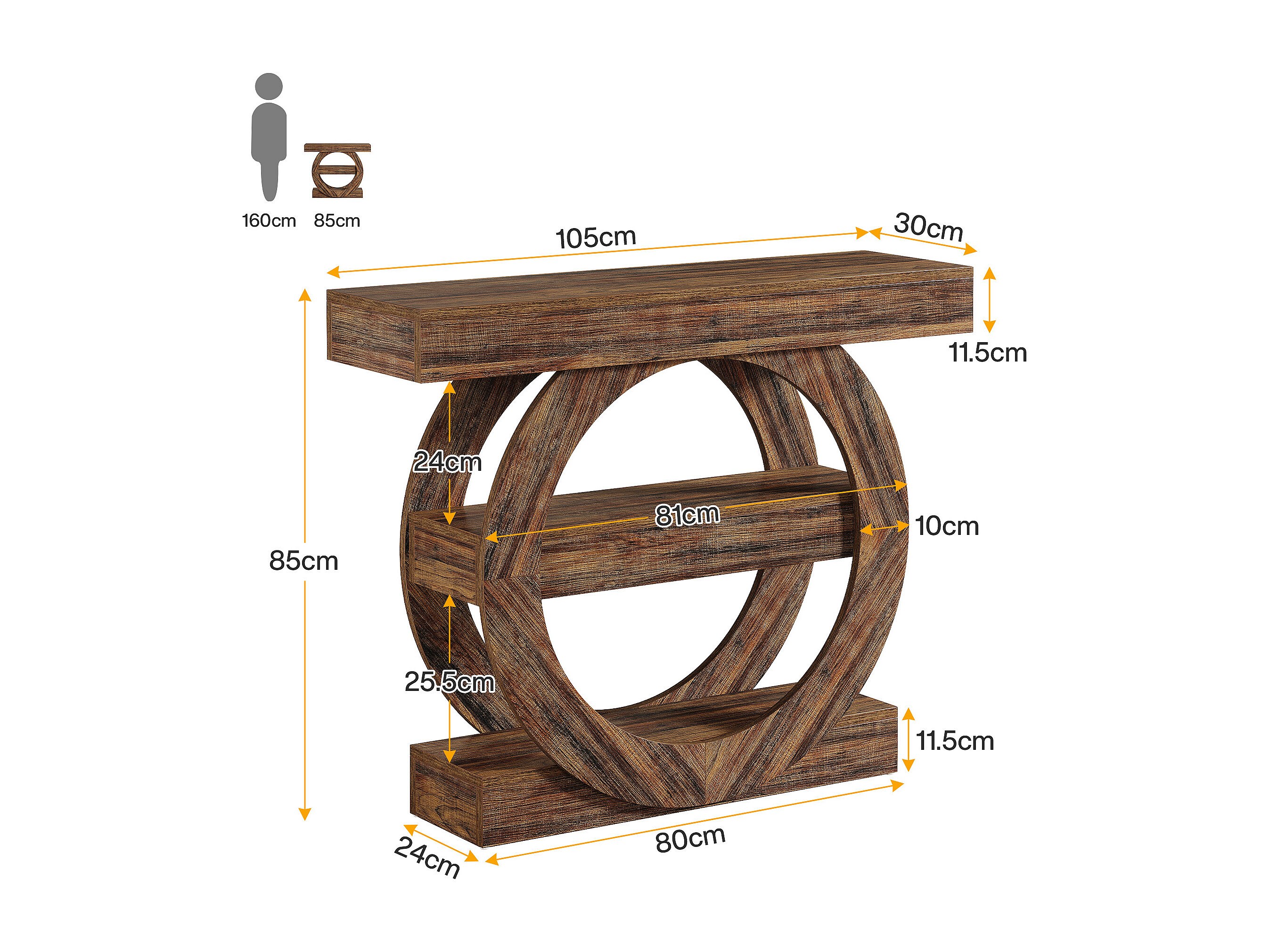 • Rustykalny stolik konsolowy w stylu rustykalnym: Ten stolik konsolowy z wykończeniem z płyty MDF o fakturze drewna tworzy ciepłą, rustykalną atmosferę. Jego okrągły kształt i otwarte półki dodają mu stylu i funkcjonalności, czyniąc go uroczym stolikiem w przedpokoju lub elementem dekoracyjnym w salonie.
