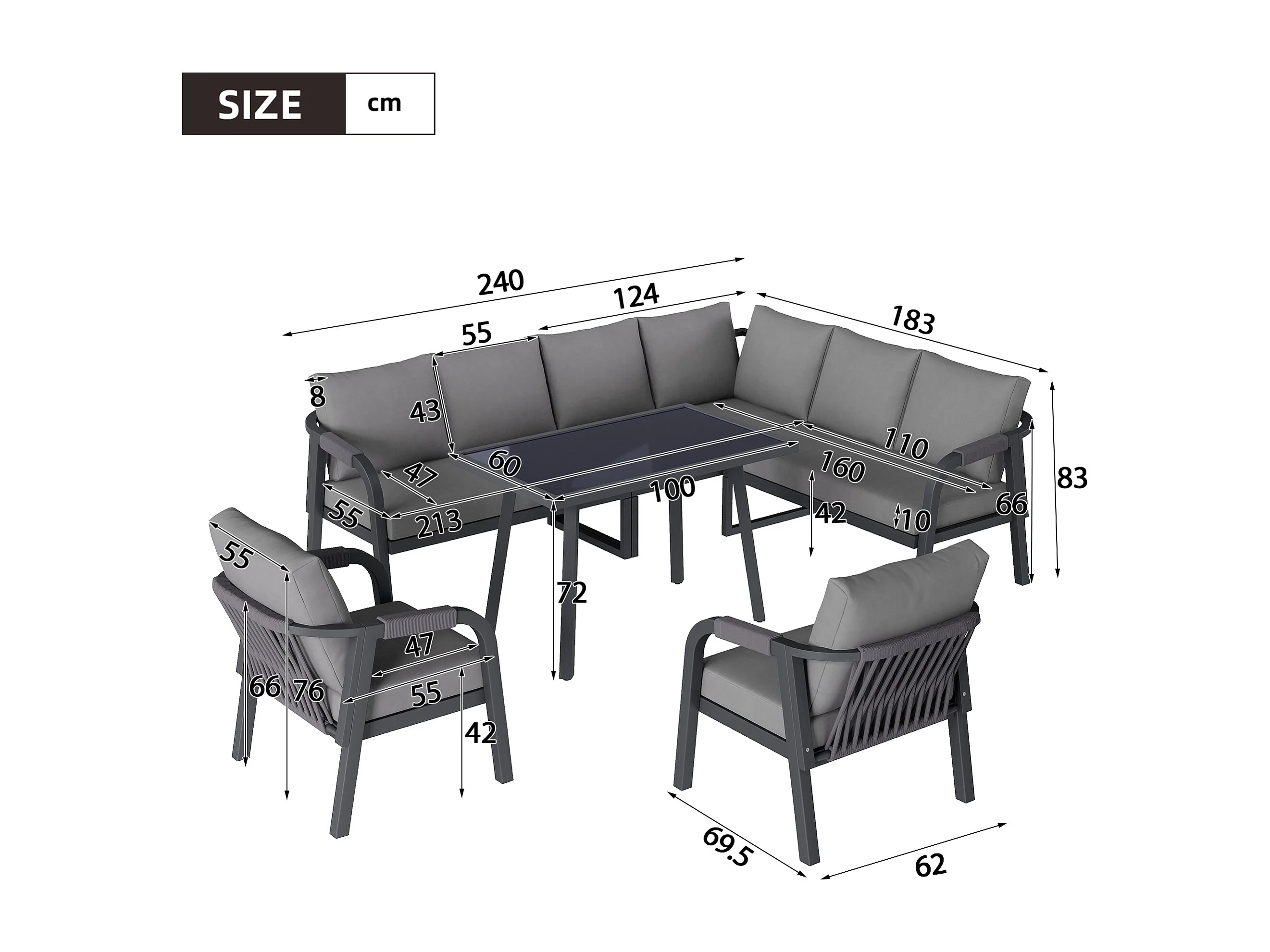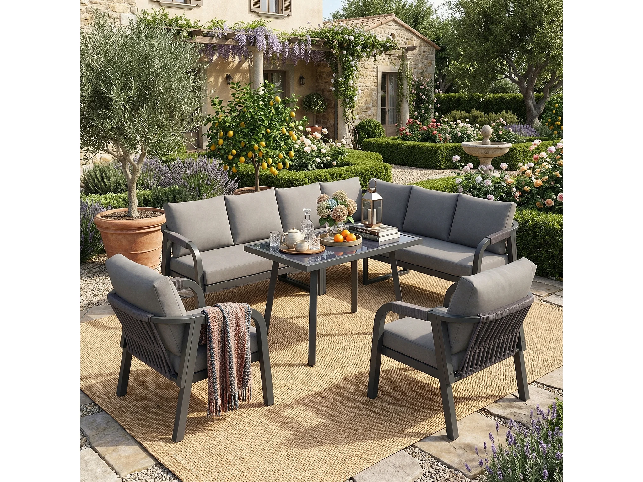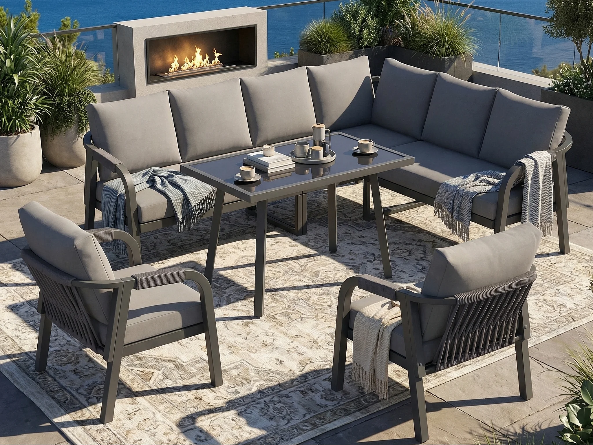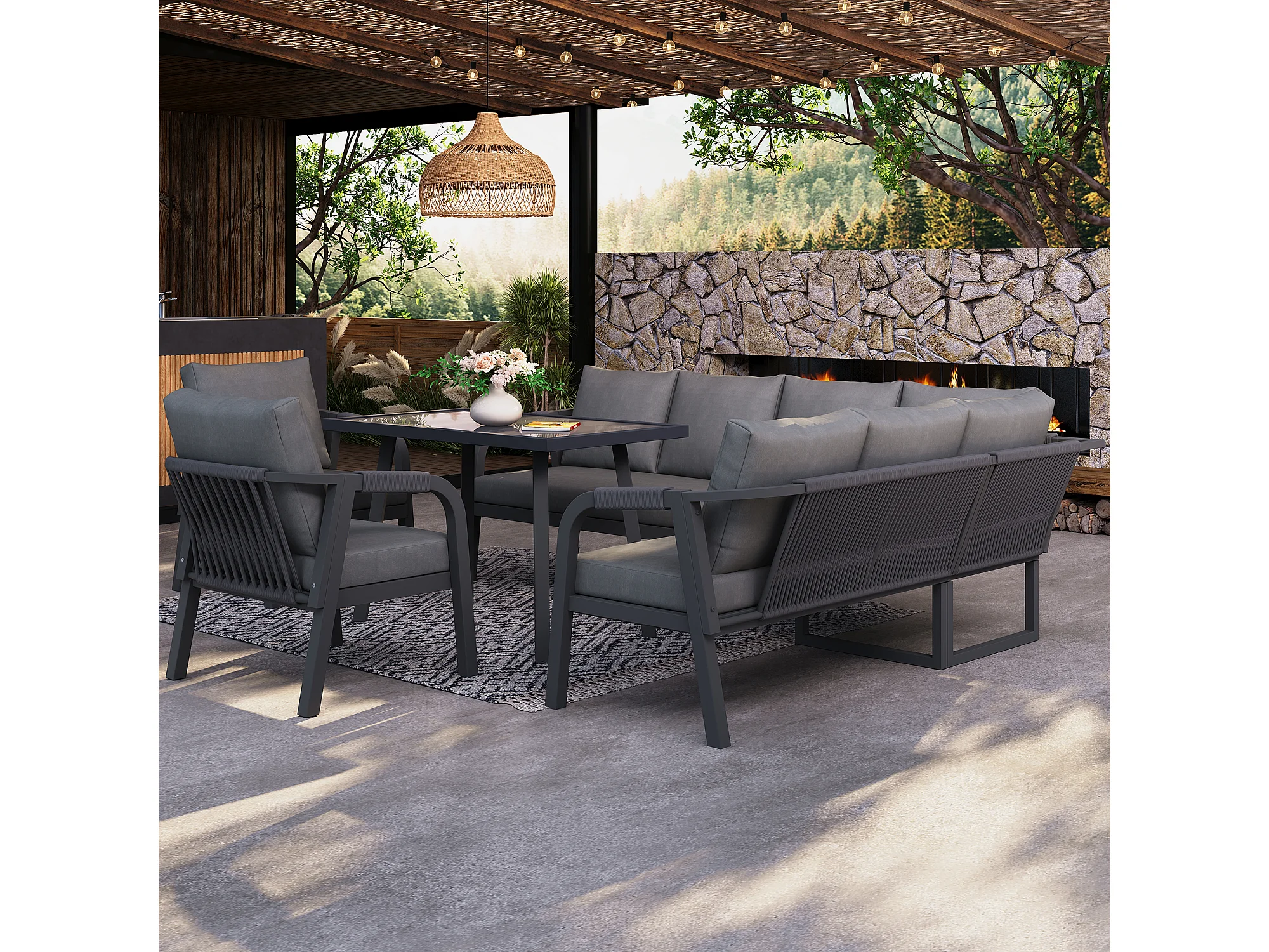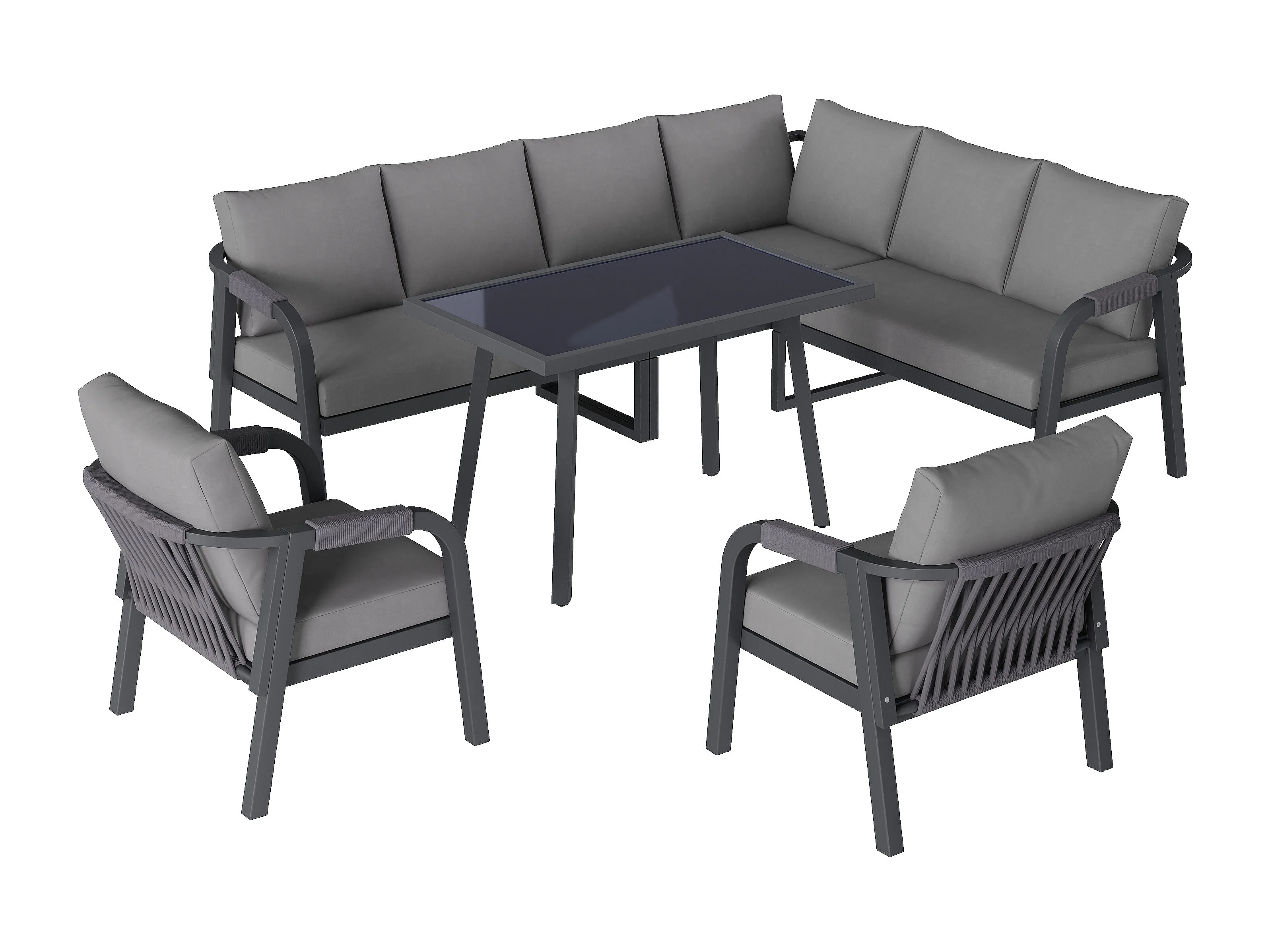 Salon Ogrodowy XL 8 Osób - Zestaw Jadalniany Narożny ze Stojącym Stołem i 2 Fotelami - Wykończenie z Plecionego Sznurka - Wytrzymała Stal Ocynkowana - Szary