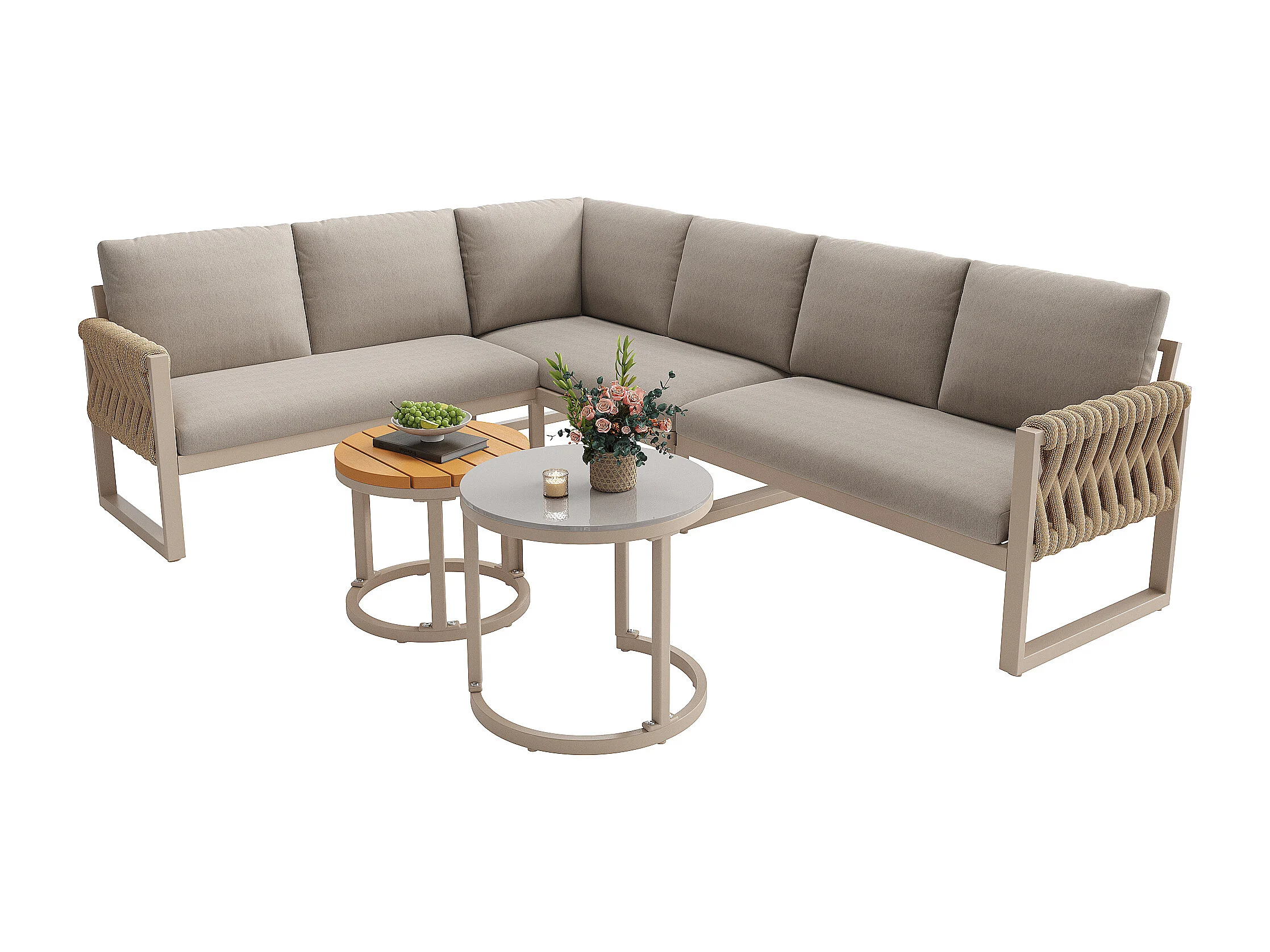 Salon ogrodowy, zestaw mebli na 5-6 osób, lin, z żelaza ocynkowanego, kanapa narożna, 2 stoliki kawowe, Beżowy