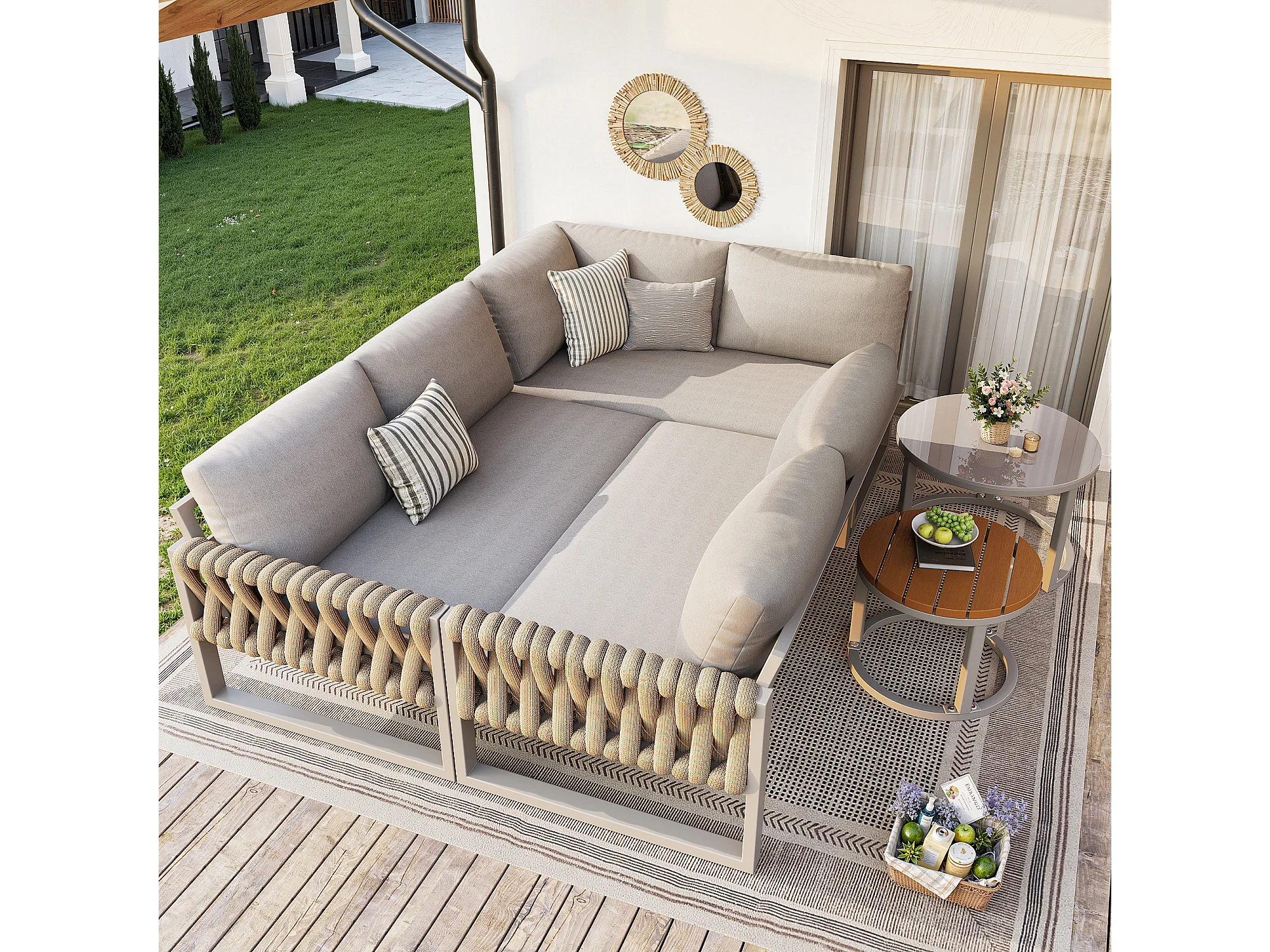 Salon ogrodowy, zestaw mebli na 5-6 osób, z rattanu PE, lin, z żelaza ocynkowanego, kanapa narożna, 2 stoliki kawowe, Beżowy