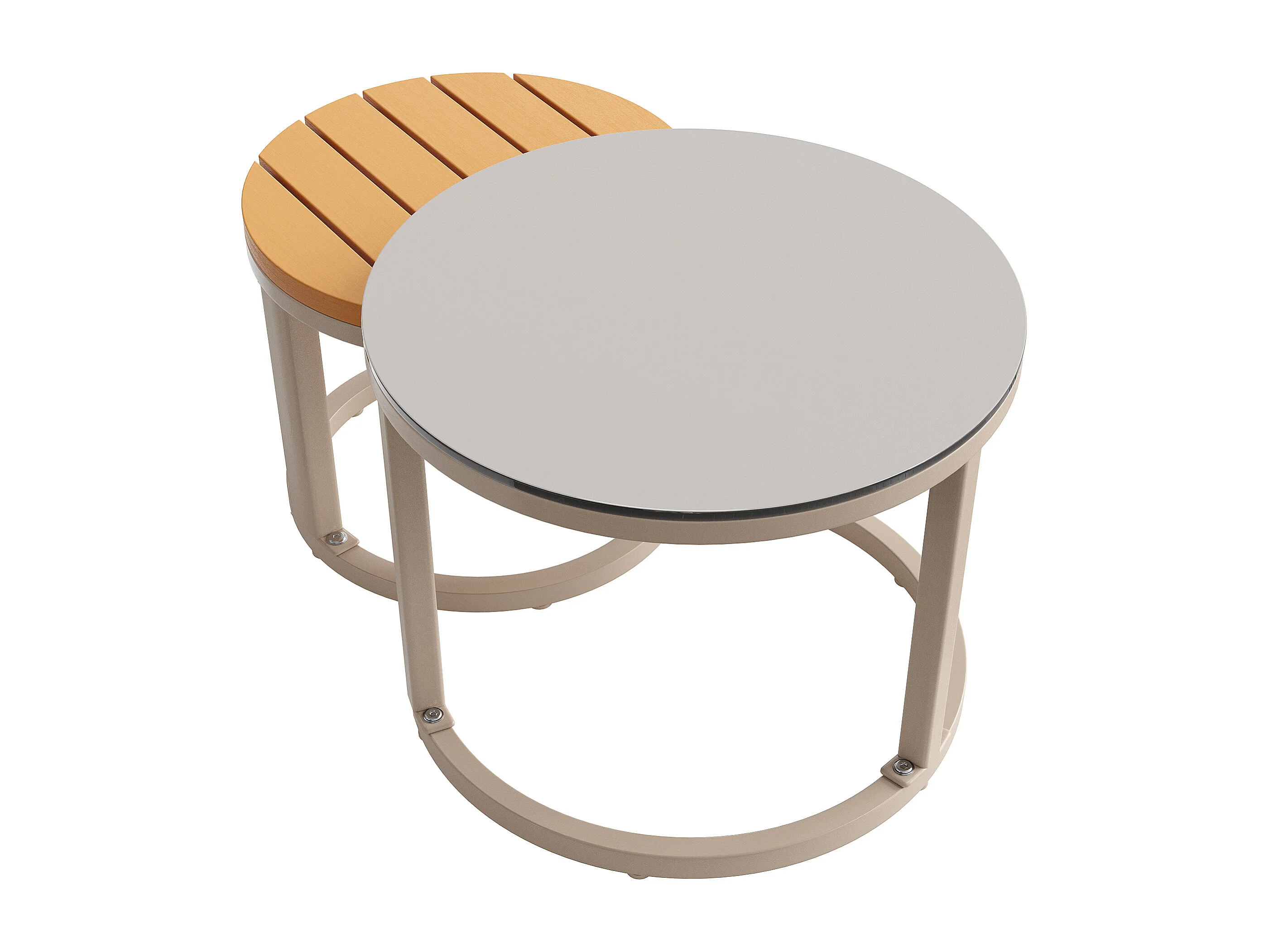 Salon ogrodowy, zestaw mebli na 6-7 osób - kanapa narożna - z żelaza ocynkowanego - stoły jadalniane z tworzywa drewnopodobnego - fotele - ławka, Beżowy
