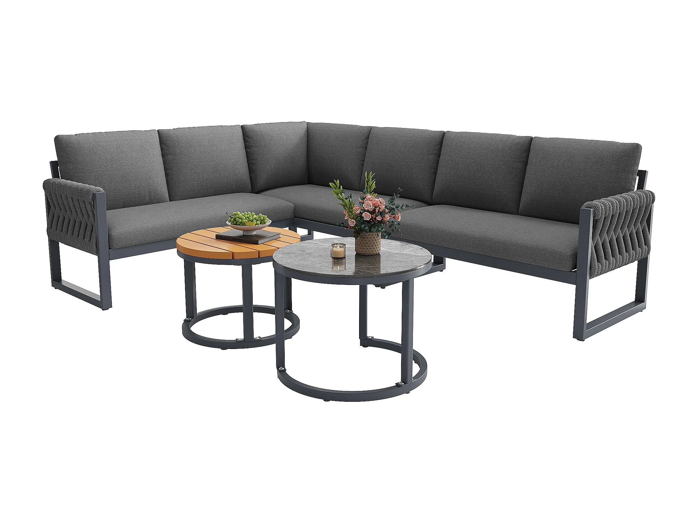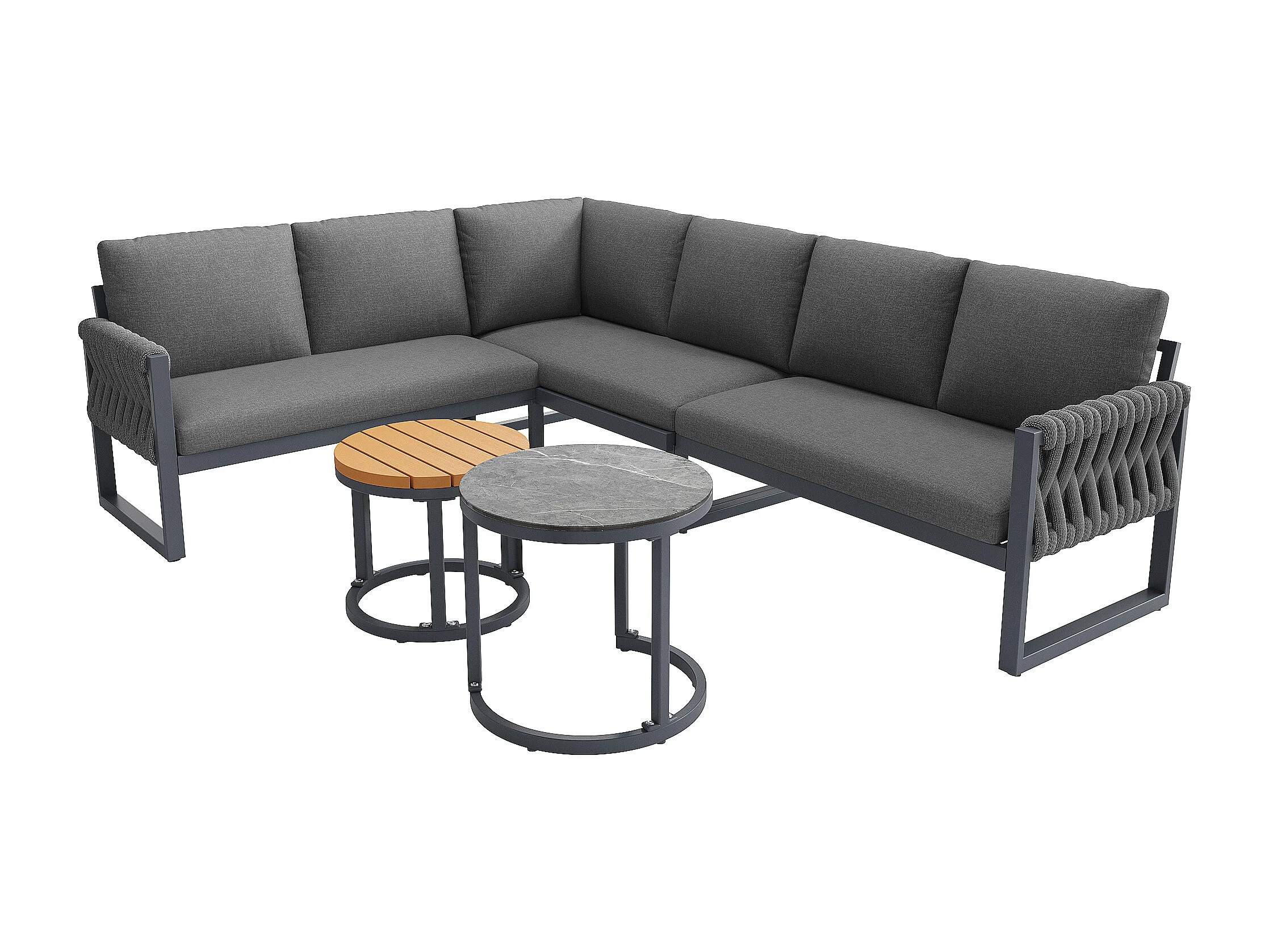 Salon ogrodowy, zestaw mebli na 5-6 osób, lin, z żelaza ocynkowanego, kanapa narożna, 2 stoliki kawowe, Szary