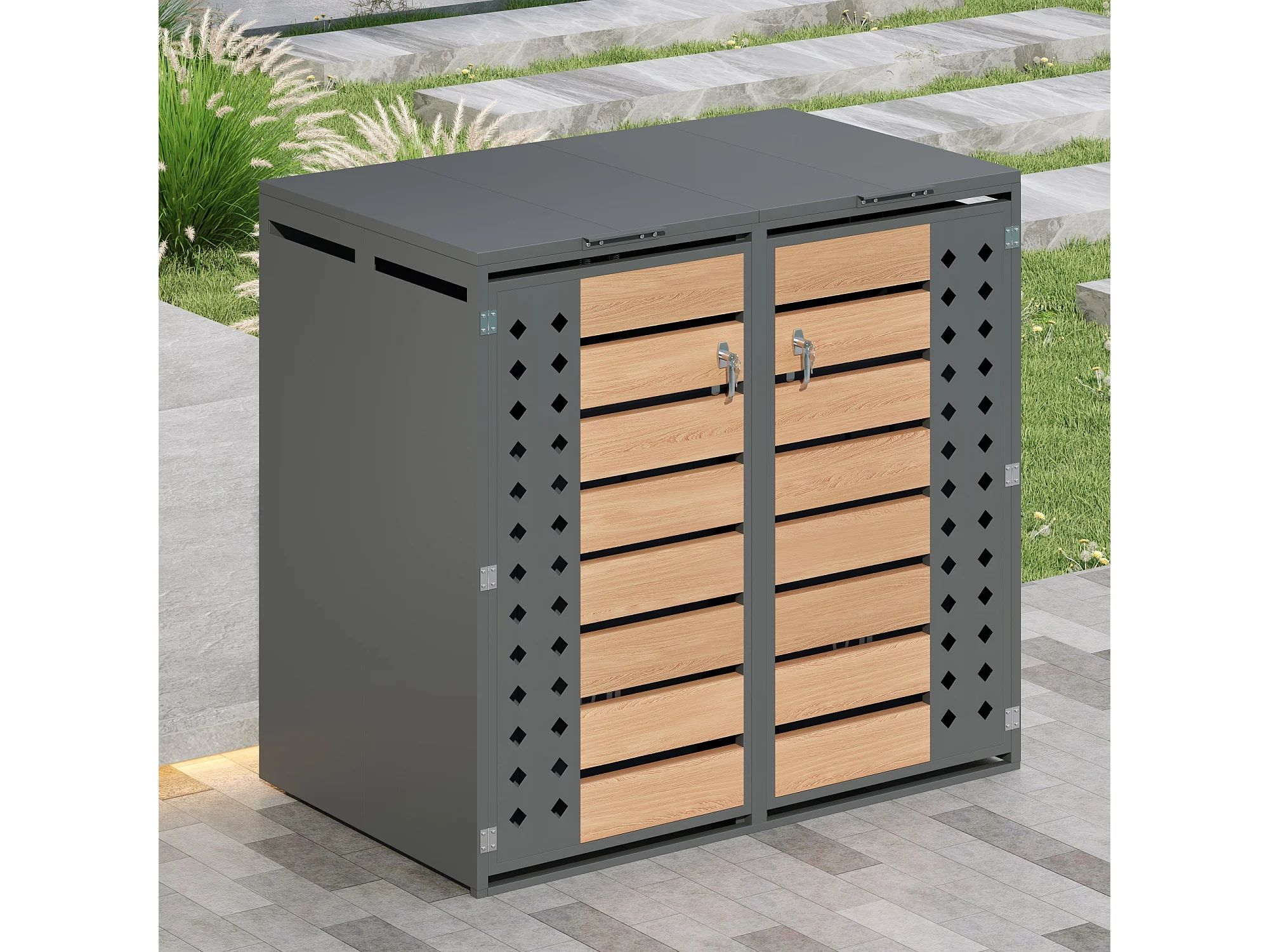 Schowek na 2 ogrodowe kosze na śmieci - 132 x 80 x 118,5 cm - z pokrywą na zawiasach + z zamkiem + 2 drzwiami - metal - szary + naturalny
