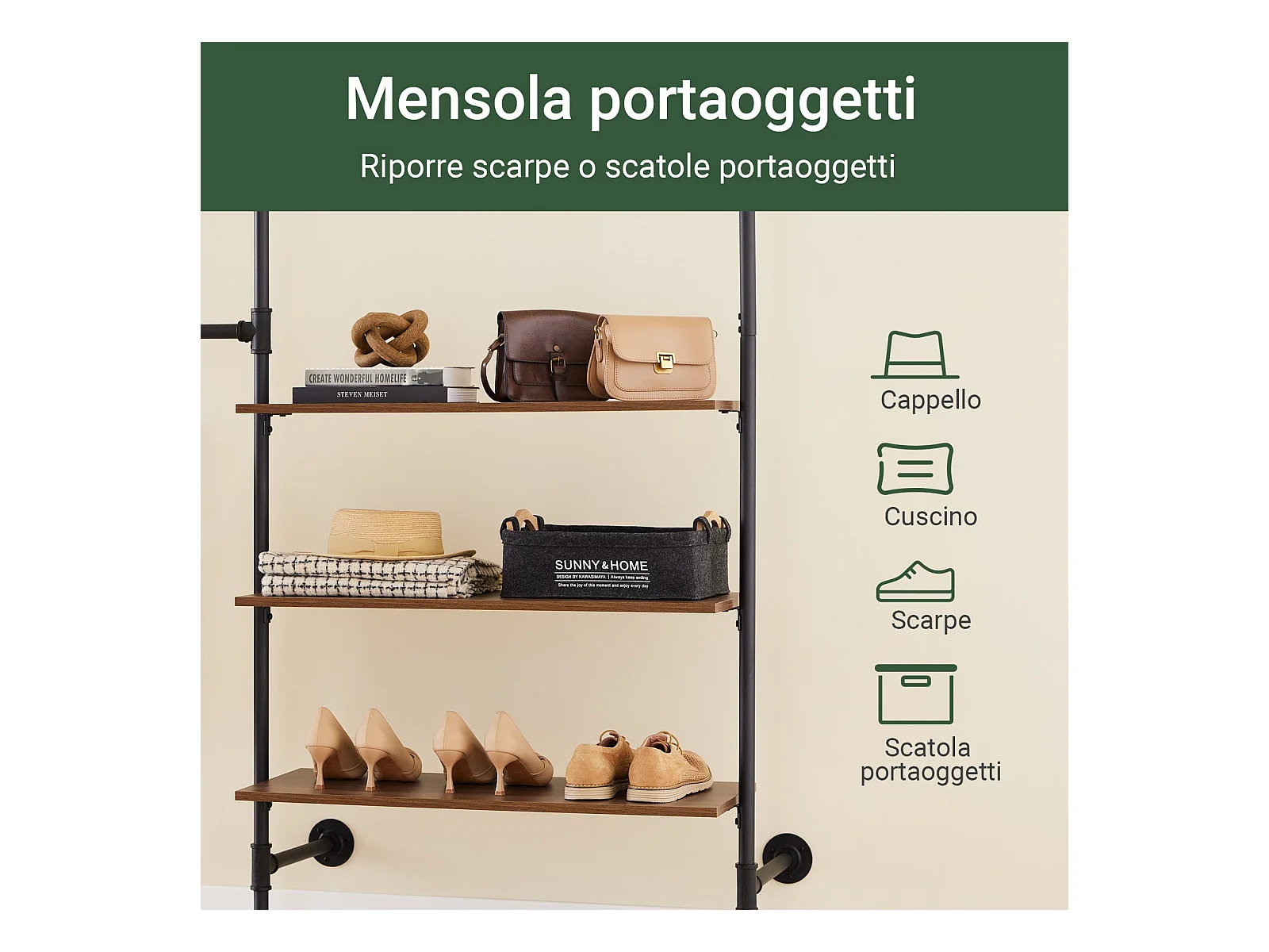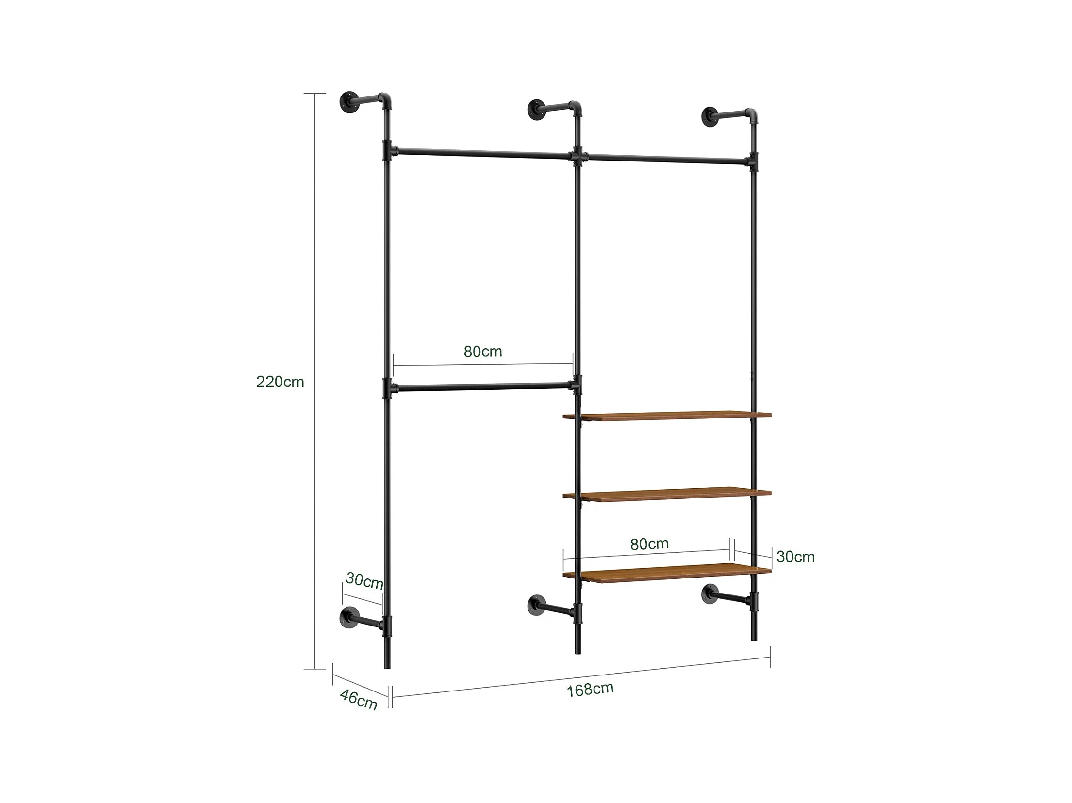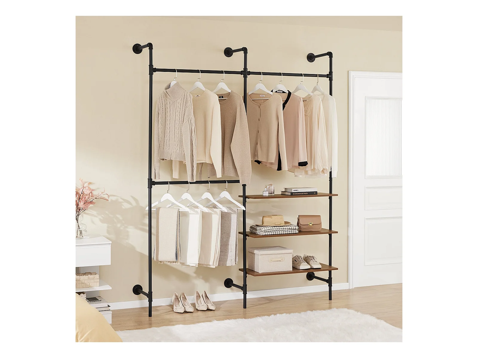 SoBuy Scienny wieszak na ubrania z 3 drążkami i 3 półkami z MDF, czarny