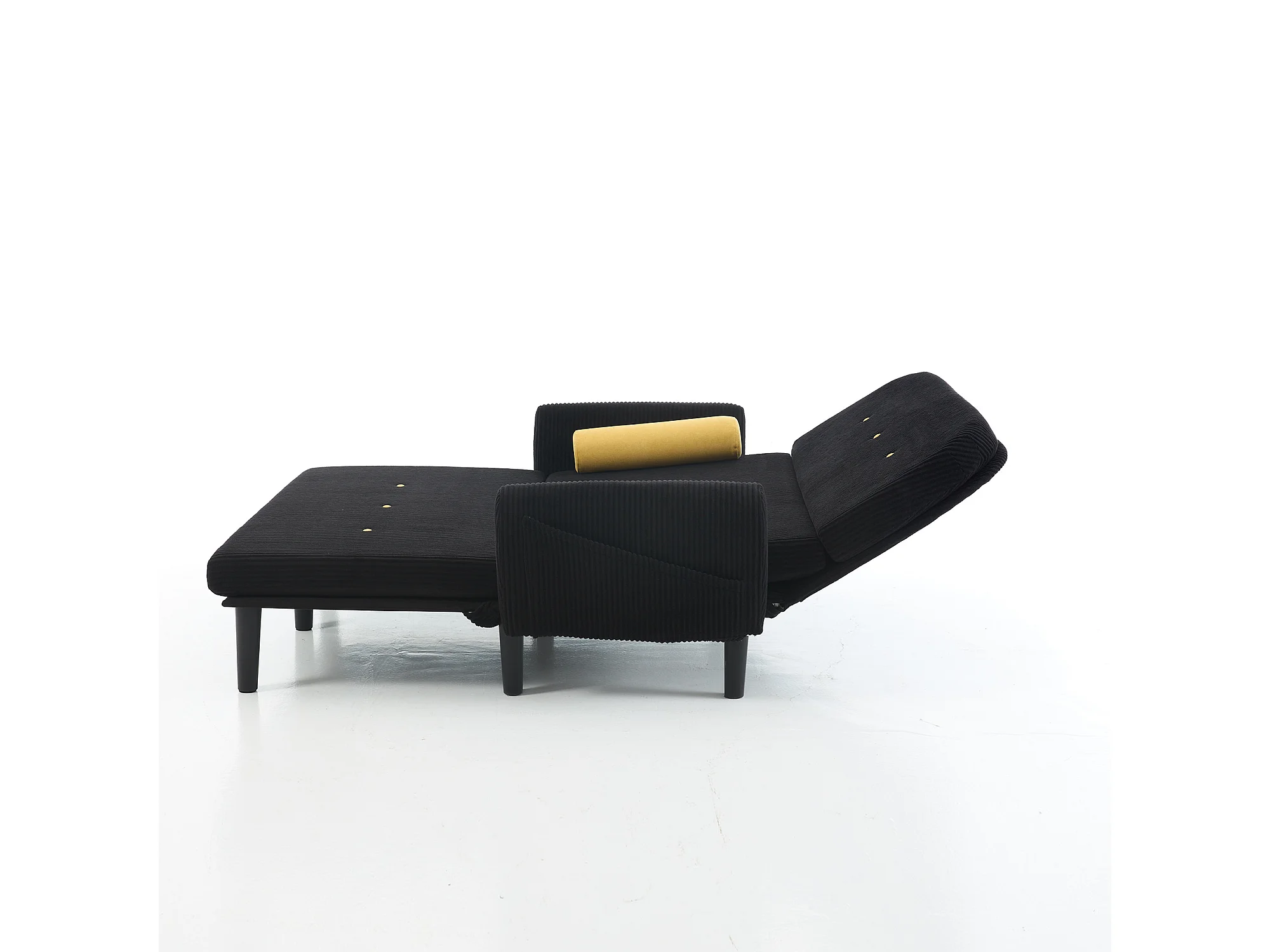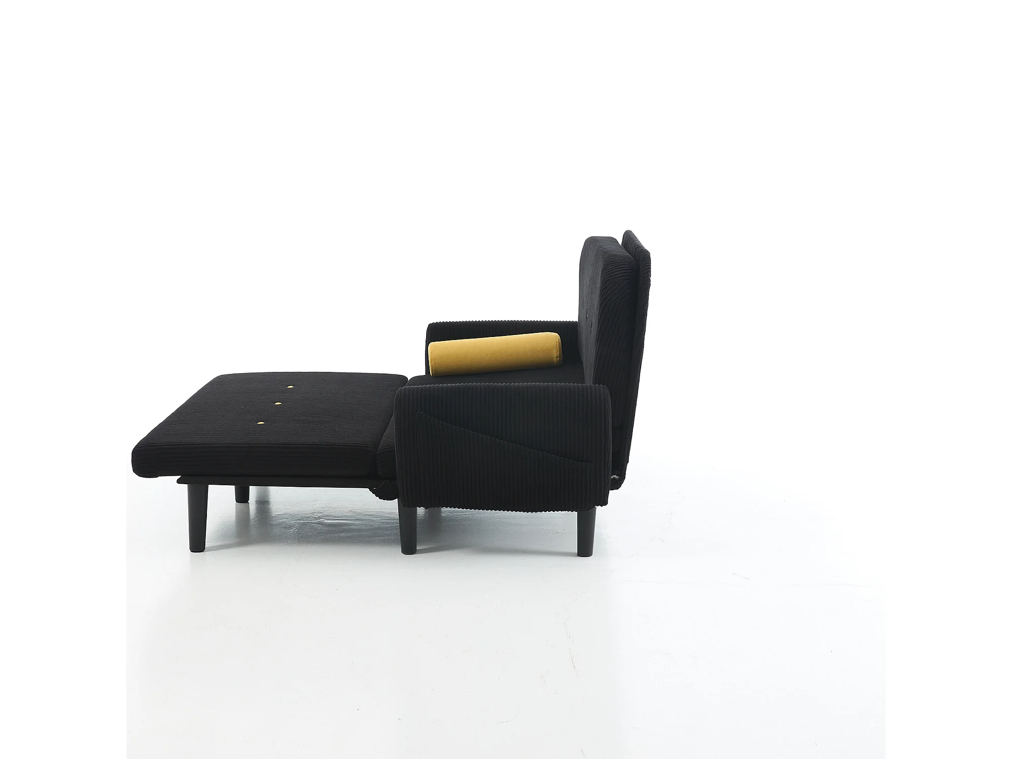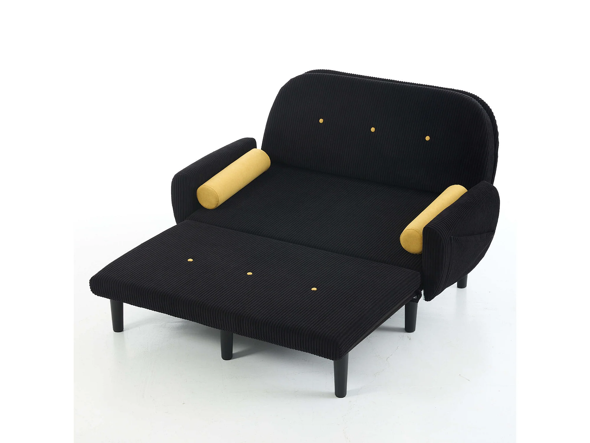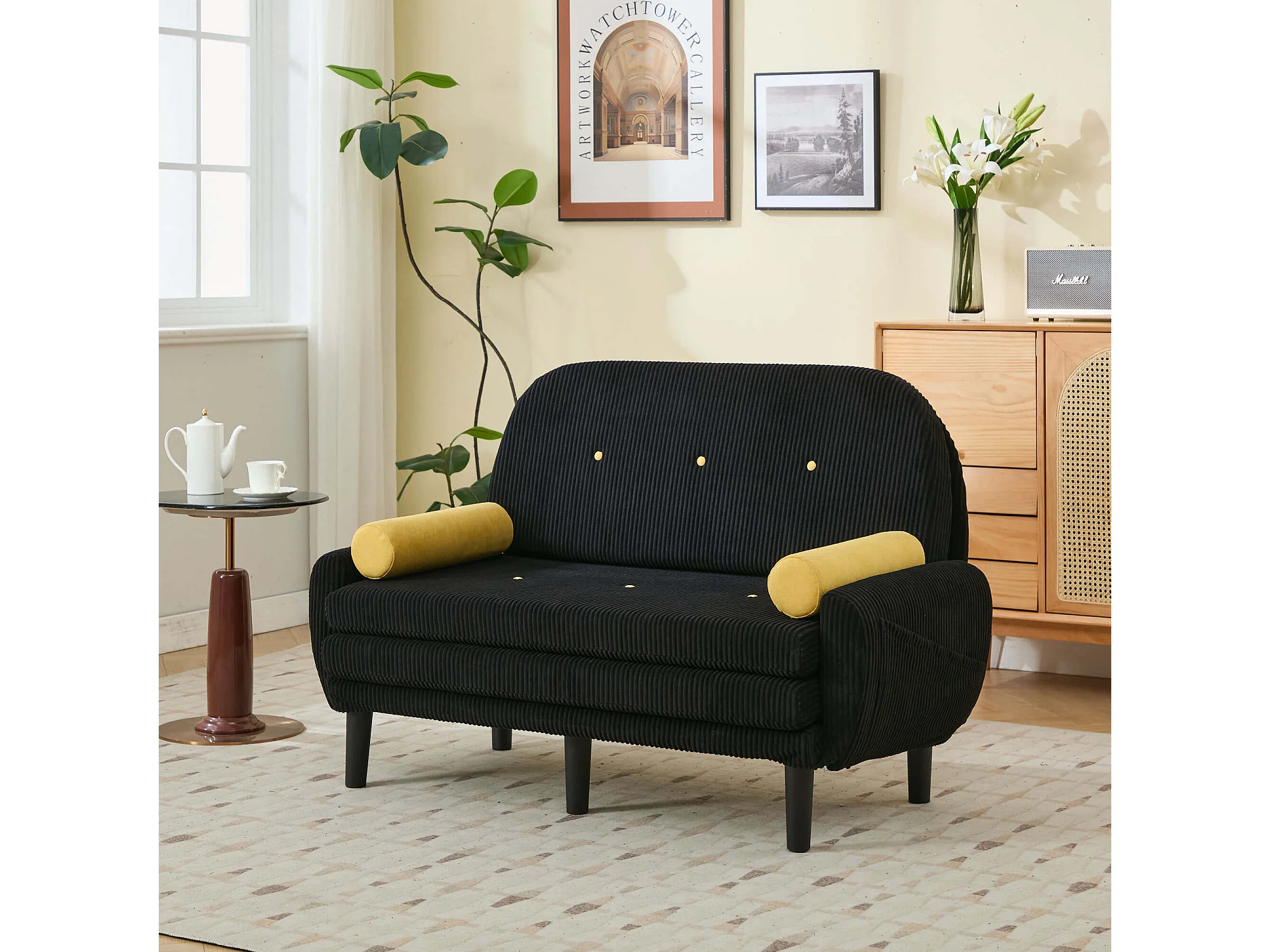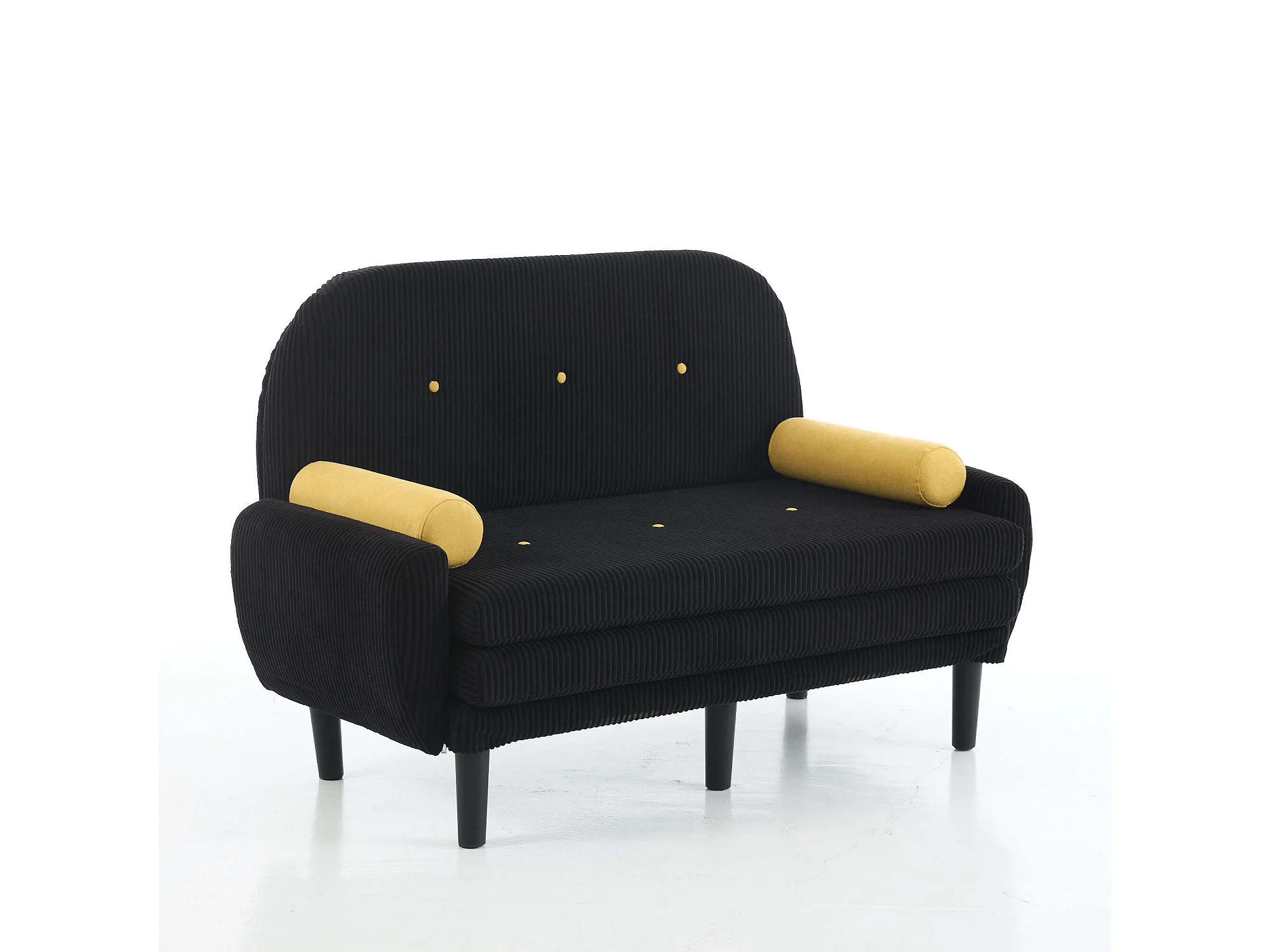 Sofa 2-osobowa czarna - Prosta sofa z bocznymi kieszeniami i 2 okrągłymi poduszkami - sztruks