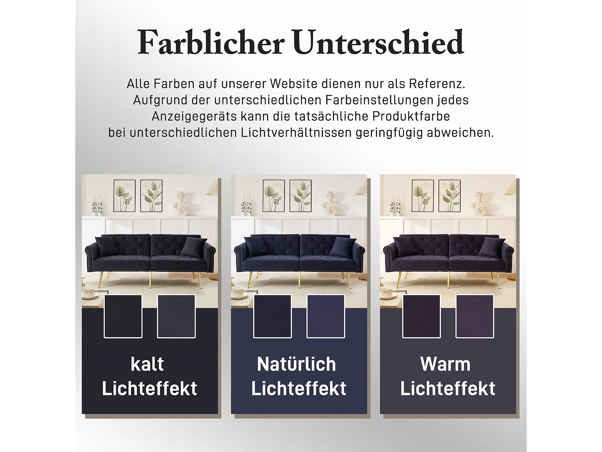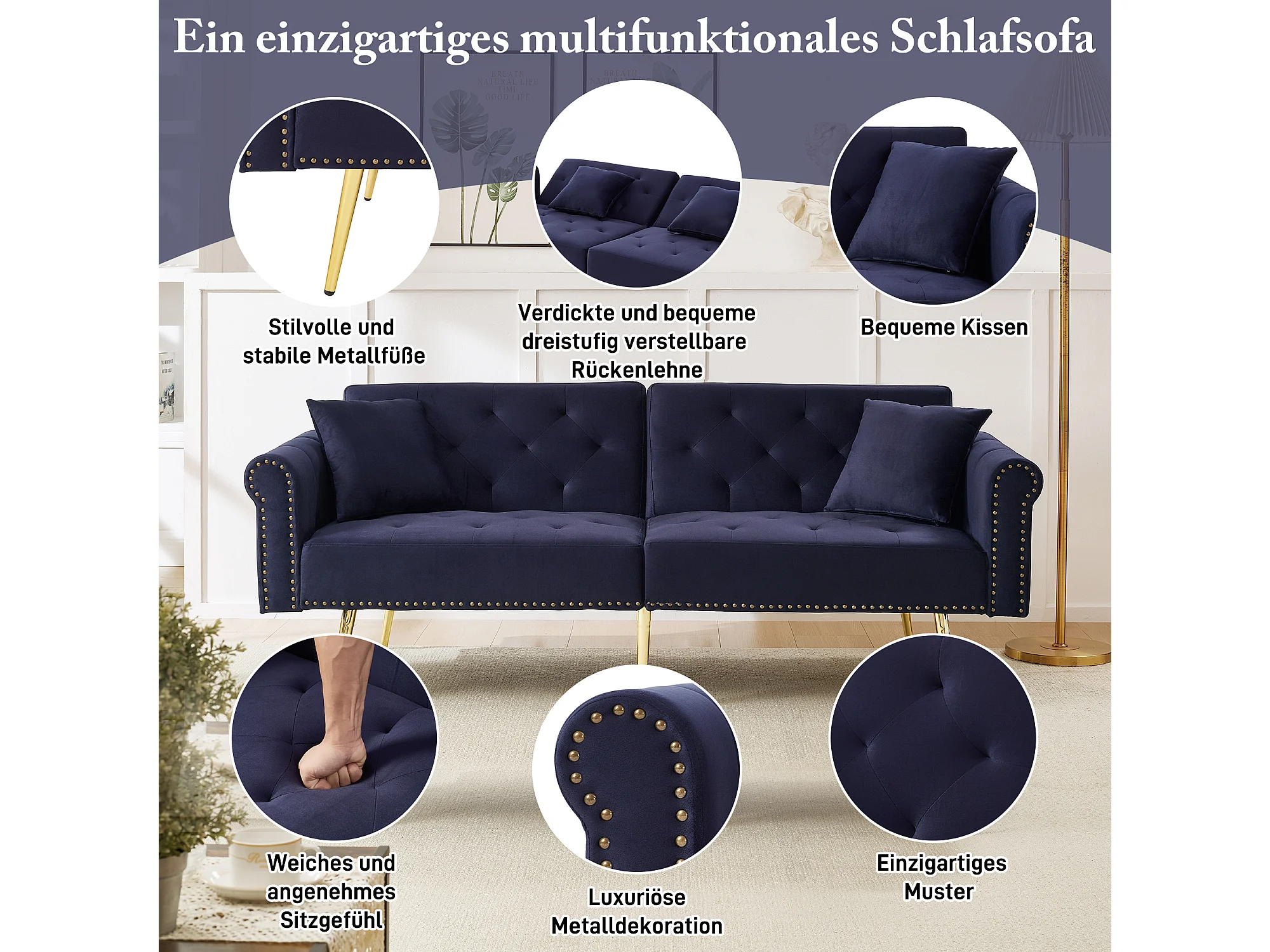 Sofa 2-osobowa z funkcją spania - 173 x 75 x 70 cm - 3-stopniowa regulacja oparcia + złote metalowe nogi - aksamit - granatowy