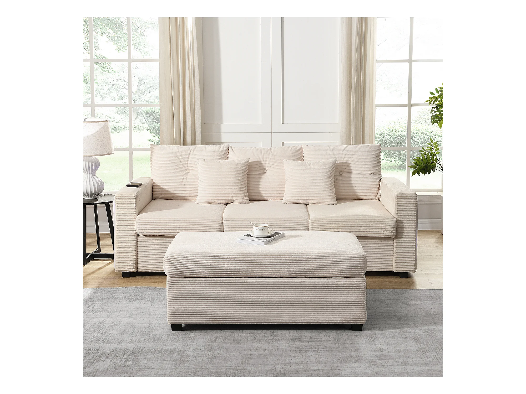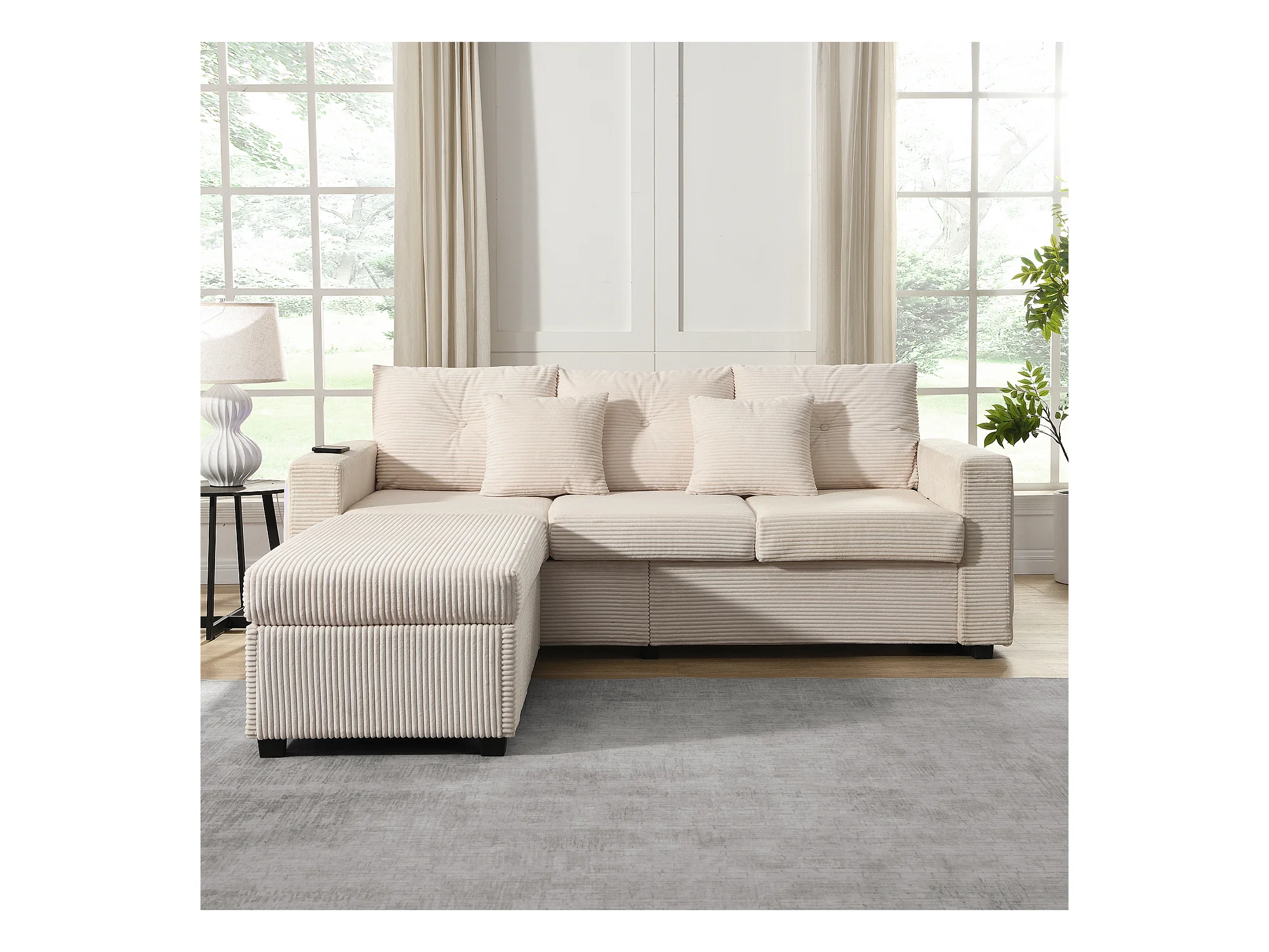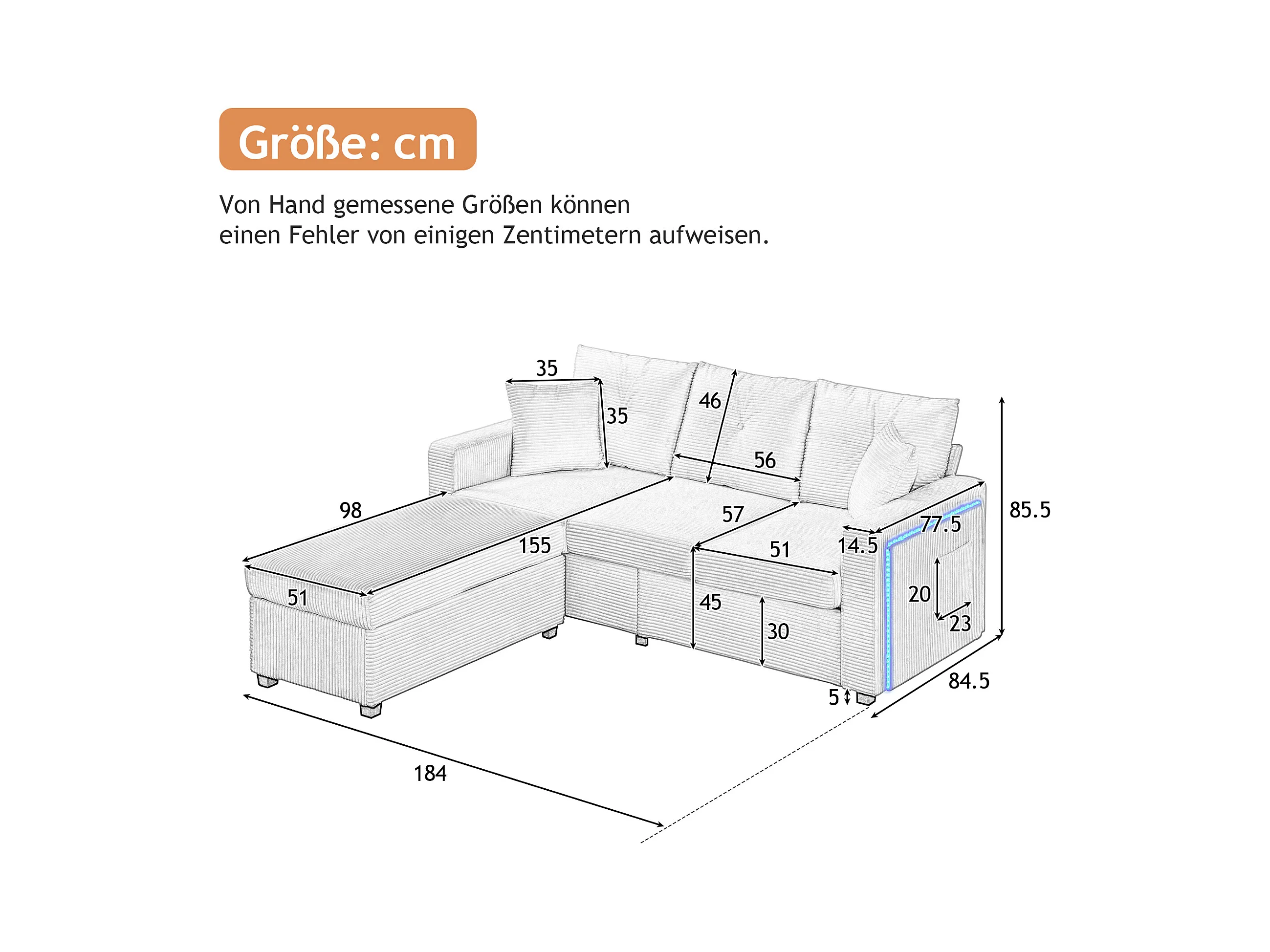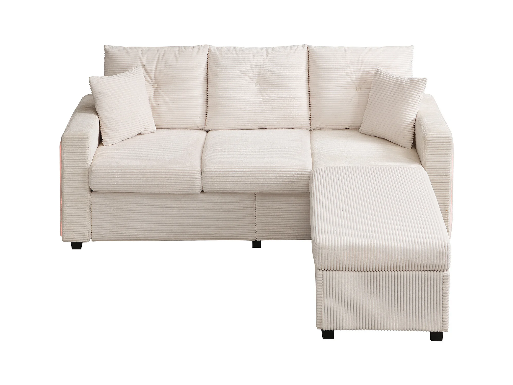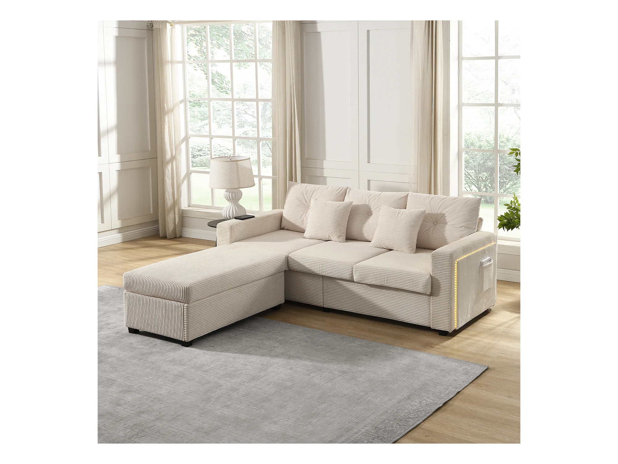 Sofa 3-osobowa, Narożnik z oświetleniem LED i podnóżkiem - beżowy sztruks