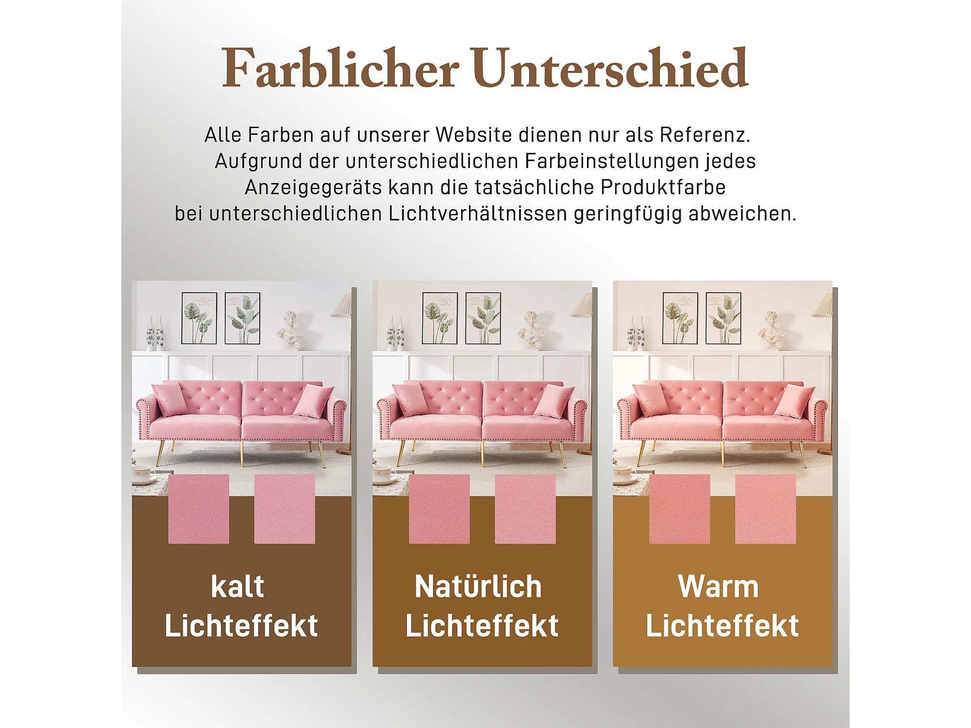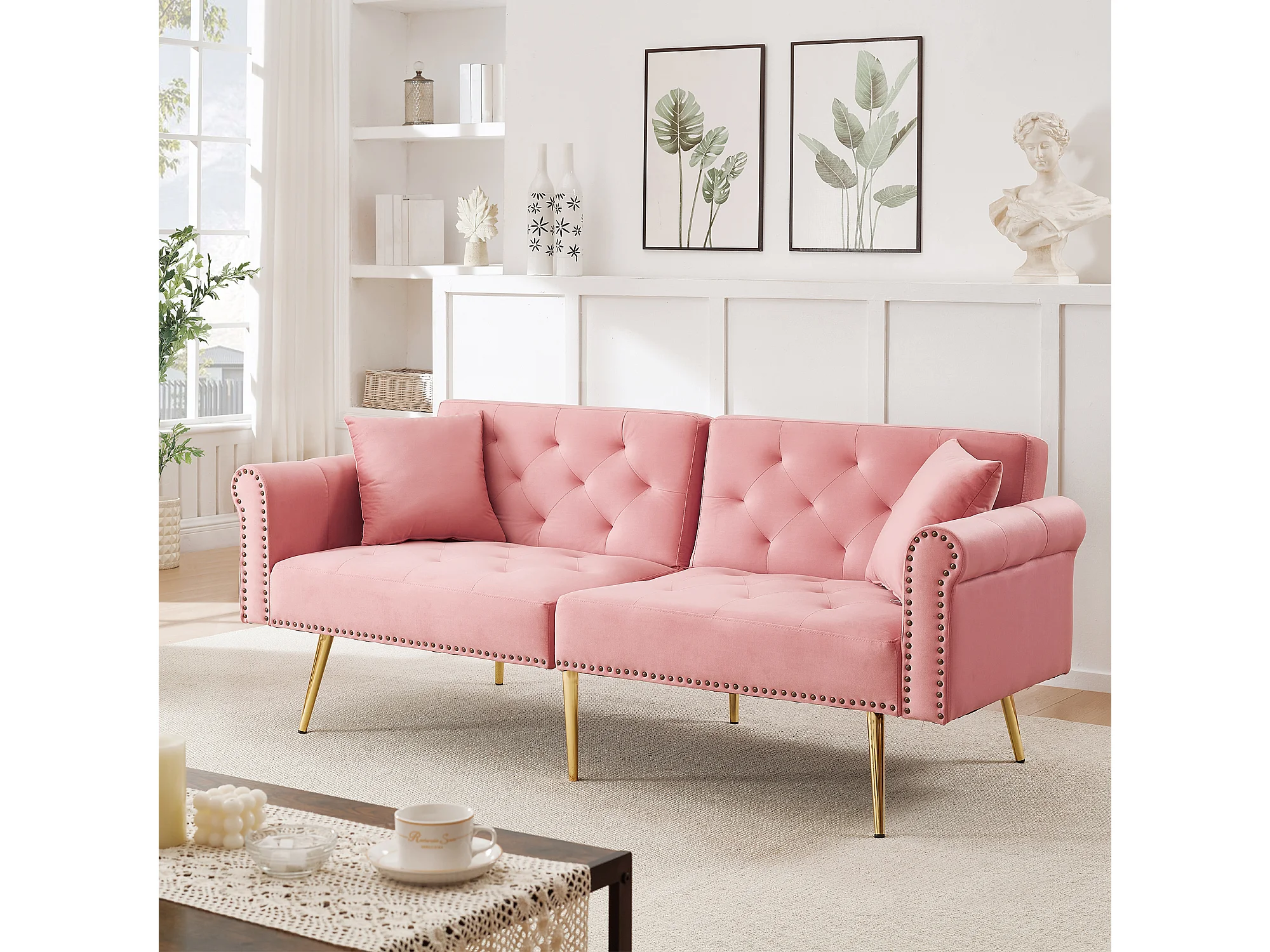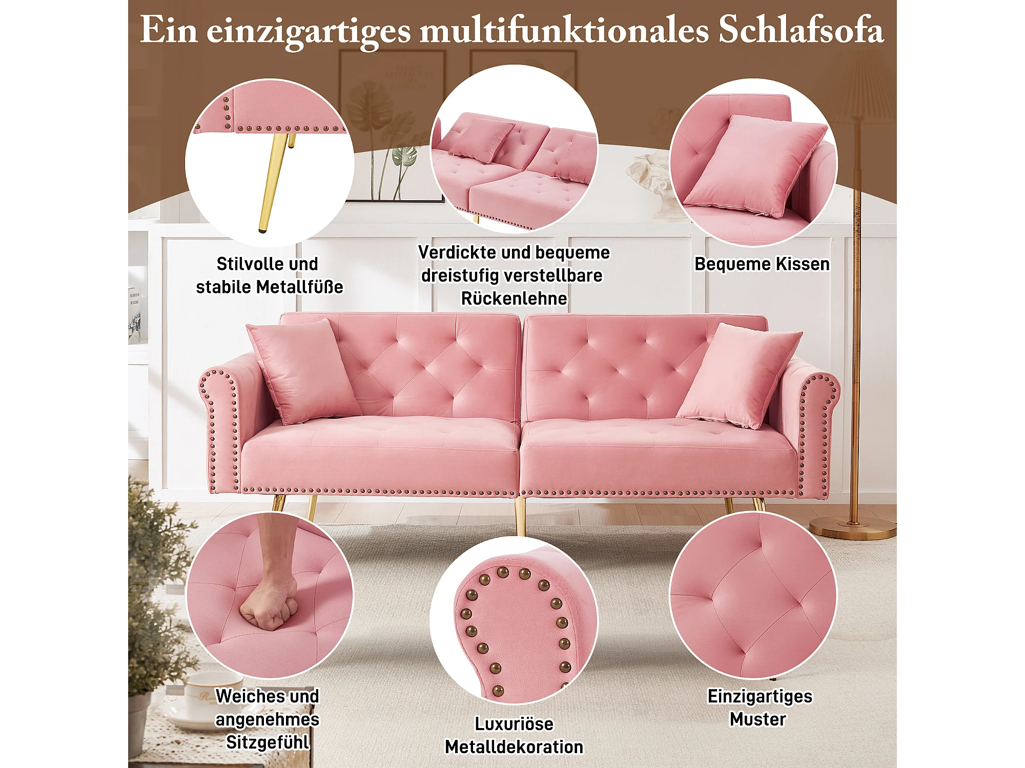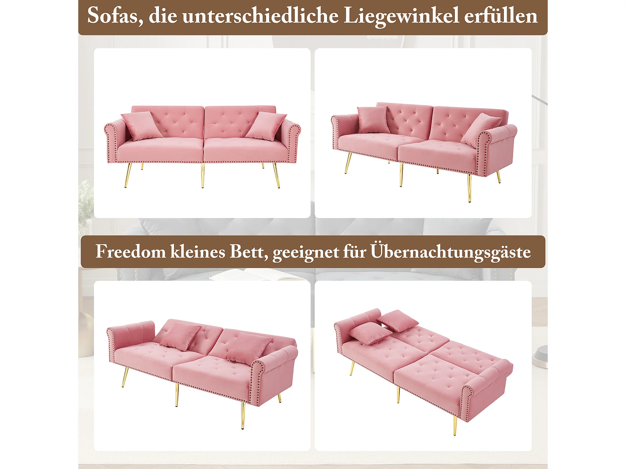Sofa rozkładana 2-osobowa - 173 x 75 x 70 cm - 3-stopniowa regulacja oparcia + złote metalowe nogi - aksamit - różowy